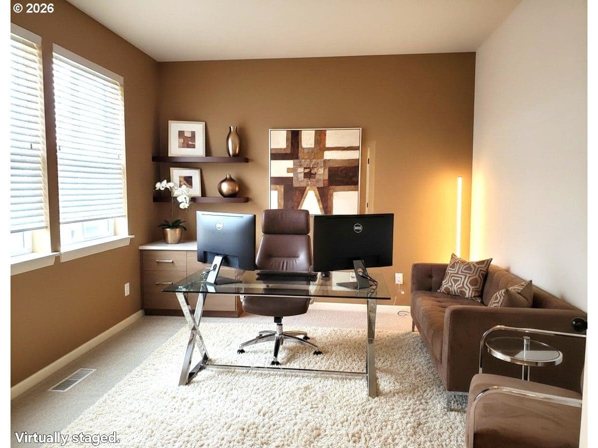 Easy low-maintenance living in this beautiful one-level home with loads of charm! Traditional classic Craftsman ranch-style home features a covered porch and patio... and with a cheerful, newer exterior paint. The charm continues inside with a delightful floorplan with open living spaces, 3 Bedrooms plus Office or a 4th bedroom and 2 full baths. This well-maintained home boasts tall ceilings, oversize windows, brand new carpet, wood laminate flooring, AC, and a tankless hot water system. The modern kitchen features an island breakfast bar with granite countertops, travertine backsplash, premium wood cabinetry, and quality stainless steel appliances. Retreat and unwind in the spacious primary room overlooking a serene greenspace and which also offers a generous walk-in closet and a full bath with dual vanities. Savor your morning coffee or afternoon refreshments in your covered patio or enjoy the manicured backyard which offers plenty of outdoor spaces for gardening, barbecues, and backyard fun. The low HOA dues cover common areas and front yard landscaping maintenance for carefree living. Terrific neighborhood and location that's only minutes to shopping, services, and eateries. OPEN HOUSE SAT 1-4 pm.