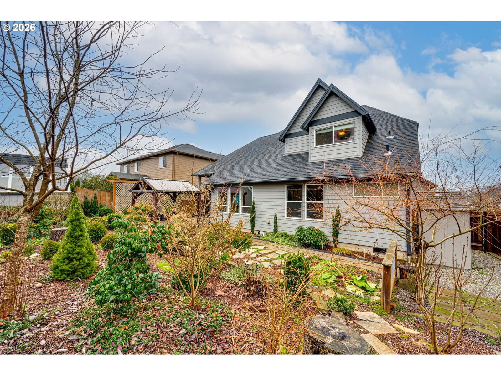 Timeless Craftsman character meets vaulted ceilings, engineered hardwood floors, and a main-level primary suite in this beautifully executed home, set within a quiet neighborhood close to parks, schools, and everyday conveniences. The great room design brings together the living, dining, and kitchen spaces, creating an open and inviting atmosphere. The kitchen is both striking and functional, featuring granite countertops, a statement tile backsplash, stainless steel appliances, a built-in range and double ovens, pantry, island with eat bar, and a built-in desk area. The living room is anchored by a gas fireplace and enhanced by vaulted ceilings and hardwood flooring. The primary suite on the main level offers a walk-in closet with custom organizer, double sinks, soaking tub, and walk-in shower. A dedicated office and laundry room with built-in storage and utility sink complete the main floor. Upstairs, three additional rooms (or two additional bedrooms and a bonus space) with ceiling fans provide flexibility. Outdoor spaces are thoughtfully designed for enjoyment, featuring a fully fenced and landscaped yard with irrigation front and back, raised garden beds, and a 23’x9’ covered patio/gazebo. A large outbuilding with windows offers excellent potential for a greenhouse, studio, or creative space, along with an additional tool shed for storage. A well-balanced home offering Craftsman charm, functional living spaces, and inviting outdoor areas in a desirable setting.