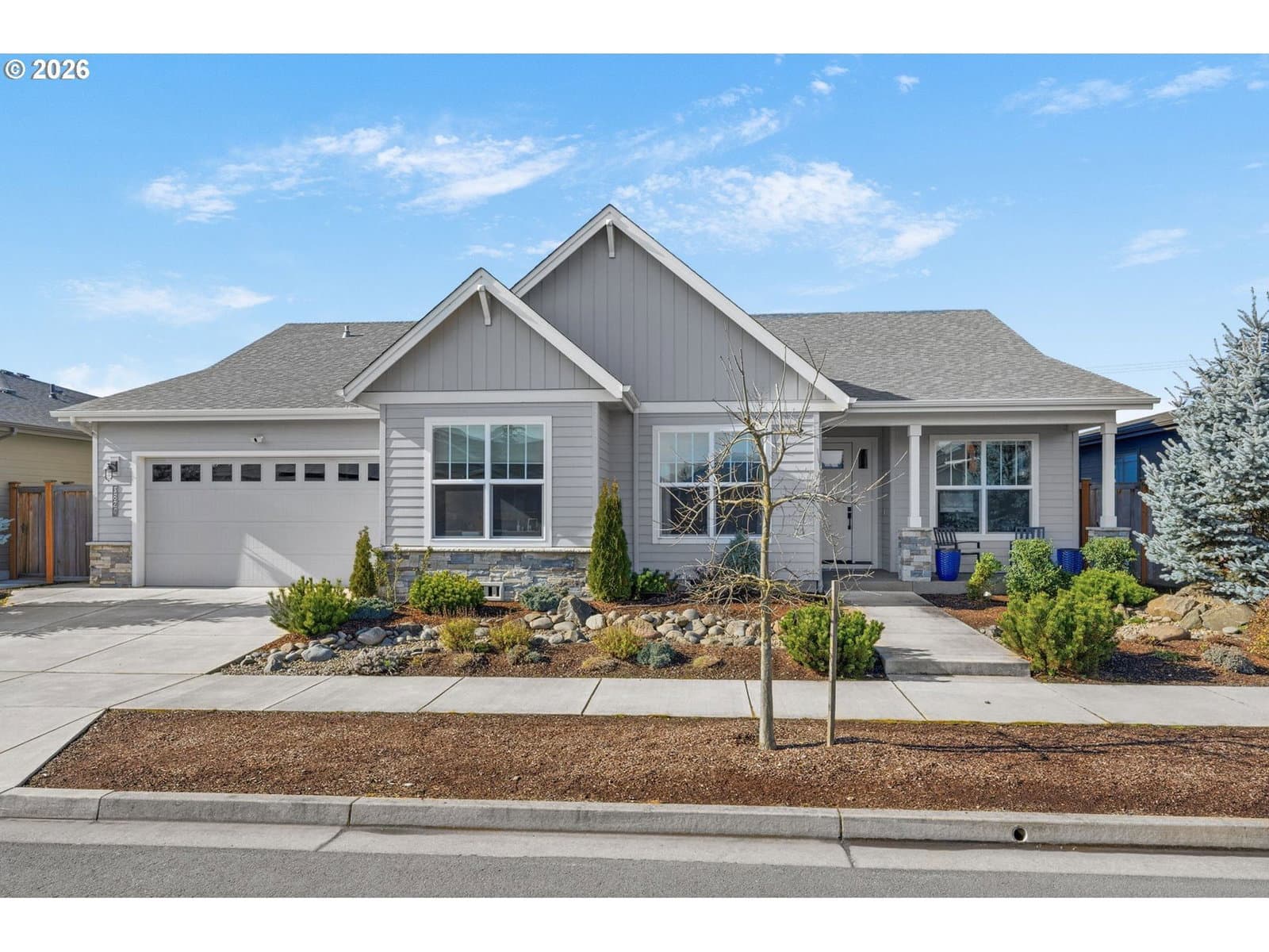 Beautiful Butler Built home (2019) located on 0.15 acres in the highly sought-after “The Nines” subdivision in North Gilham. Just a hop, skip, and jump to the community park and a quick drive to Gilham Elementary, Cal Young Middle School, Market of Choice, and Delta Oaks Shopping Center.The welcoming exterior features dry creek bed landscaping and elegant stone masonry accents. Inside, you’ll find modern design with custom touches throughout—hardwood, tile, and carpeted flooring, wide hallways, high ceilings, ceiling fans, and abundant natural light. Cozy up by the living room fireplace in the inviting great room layout.The luxurious kitchen is a showstopper with quartz countertops, a large island with eat bar, soft-close walnut cabinetry, and stunning GE Café Matte White gas appliances. The owner’s suite is filled with natural light and features a tray ceiling and spa-like bathroom with dual sinks and a beautifully tiled walk-in shower.Additional highlights include a convenient hallway storage nook, a separate laundry room with sink and cabinetry, and a versatile fifth room perfect for a playroom, office, art studio, or workout space.Step outside to a gorgeous backyard retreat complete with paver patio, firepit, pergola, and a large shed/workshop/she-shed—ideal for hobbies or extra storage. Artificial turf means your grass is always green and no mowing needed. A rare opportunity to own a thoughtfully designed home in one of North Gilham’s most desirable newer neighborhoods.