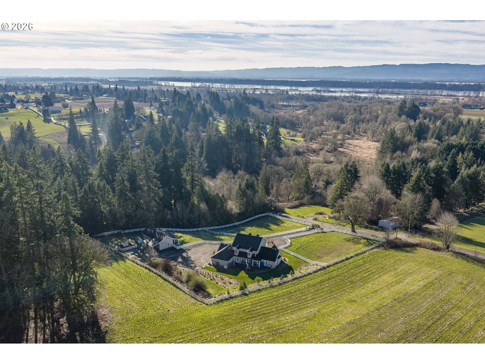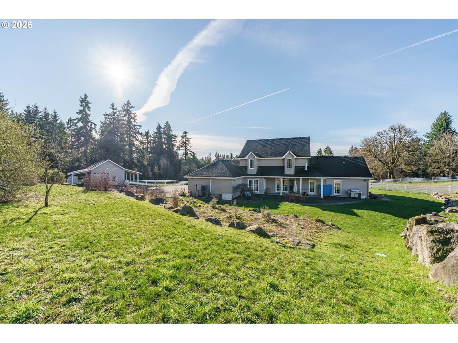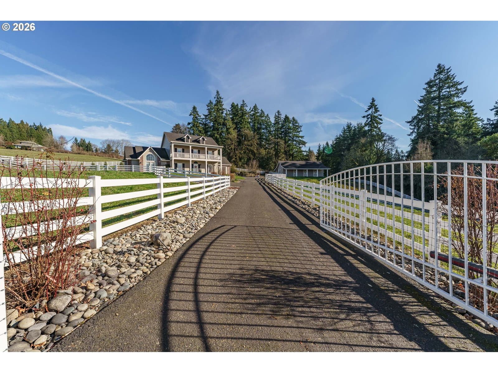 Tucked behind a gated entrance on 2.24 fully fenced acres, this custom Colonial farmhouse is the kind of property that rarely comes available. This thoughtfully designed 2,993 sq ft home is filled with natural light, hardwood floors, and floor-to-ceiling windows that frame peaceful territorial views. The main-level primary suite feels like a true retreat with vaulted ceilings, a sitting area, his & hers closets, and direct access to the back patio. A gourmet kitchen anchors the home with a Wolf cooktop, generous prep space, and seamless flow to an oversized mud and utility room with walk-in pantry. Upstairs offers 3 additional bedrooms and a covered balcony perfect for slow mornings or sunset evenings. Outside, the property shines with multiple fenced pastures, RV parking with hookups, meticulously planned native landscaping, and a three-stall barn with loft, water, and power. Private, functional, and beautifully maintained, this is a home built for those who value space, intention, and the freedom to live a little differently.