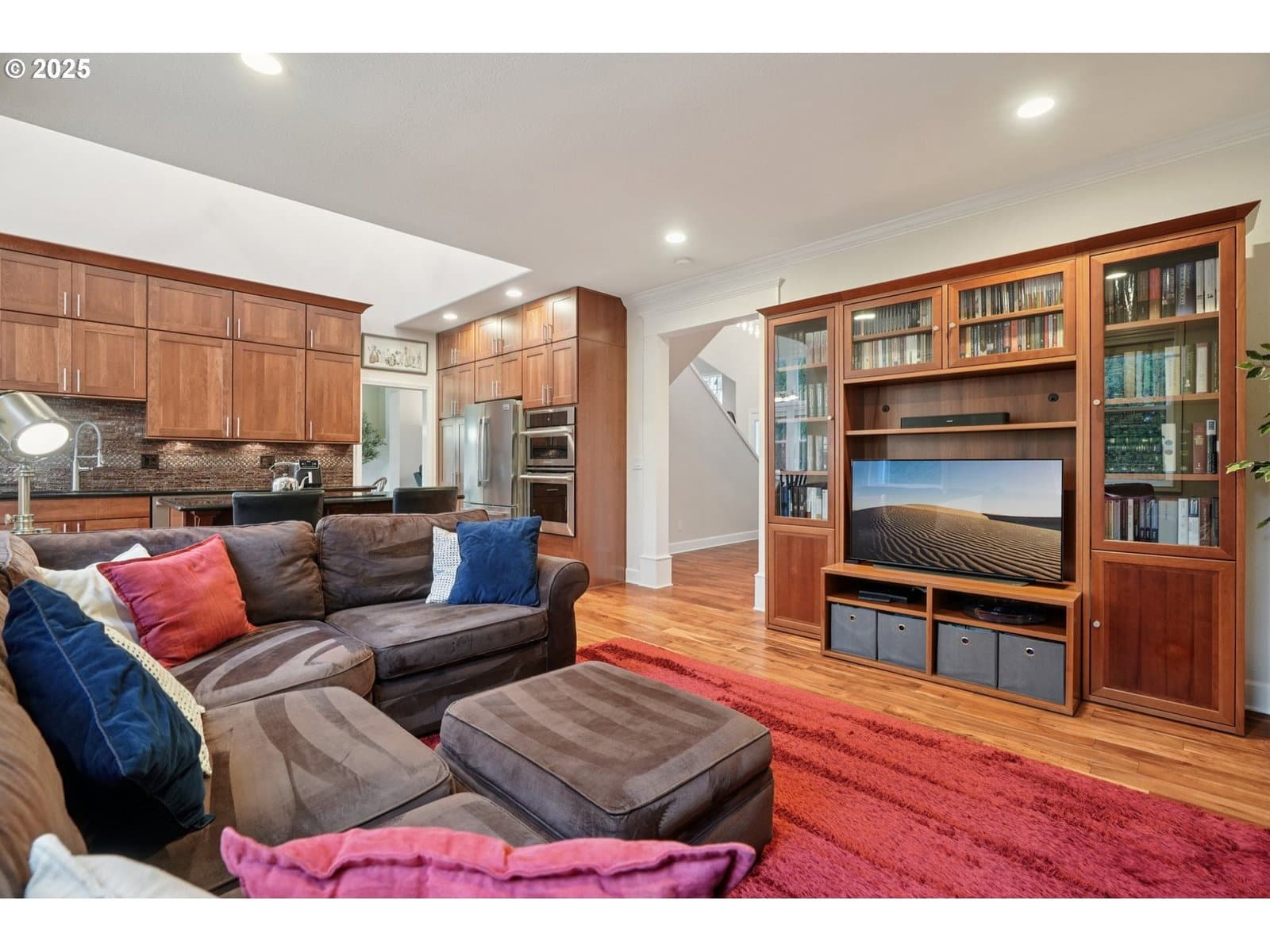 Impressive 18-foot ceilings and an open floor plan fill the home with natural light, creating a bright, airy atmosphere—even during Oregon’s rainy winters. The architectural centerpiece is the open staircase leading to an upstairs “skybridge” hallway that overlooks the heart of the home. From above, take in views of the fully remodeled contemporary kitchen featuring solid cherry 9-foot cabinetry and granite countertops. Opposite the kitchen, the spacious living room offers a warm and inviting setting, ideal for entertaining or relaxing evenings at home. Meticulously maintained by the original owners, the home has been thoughtfully remodeled through three major renovation phases, including a beautifully remodeled primary suite. Notable upgrades include 5” wide acacia wood flooring throughout, Electrolux Icon and Frigidaire gourmet kitchen appliances, granite countertops in the kitchen and bathrooms, striking contemporary lighting, a new roof with transferable warranty, and fresh exterior paint completed in 2022—reflecting exceptional pride of ownership throughout. [Home Energy Score = 5. HES Report at https://rpt.greenbuildingregistry.com/hes/OR10243177]