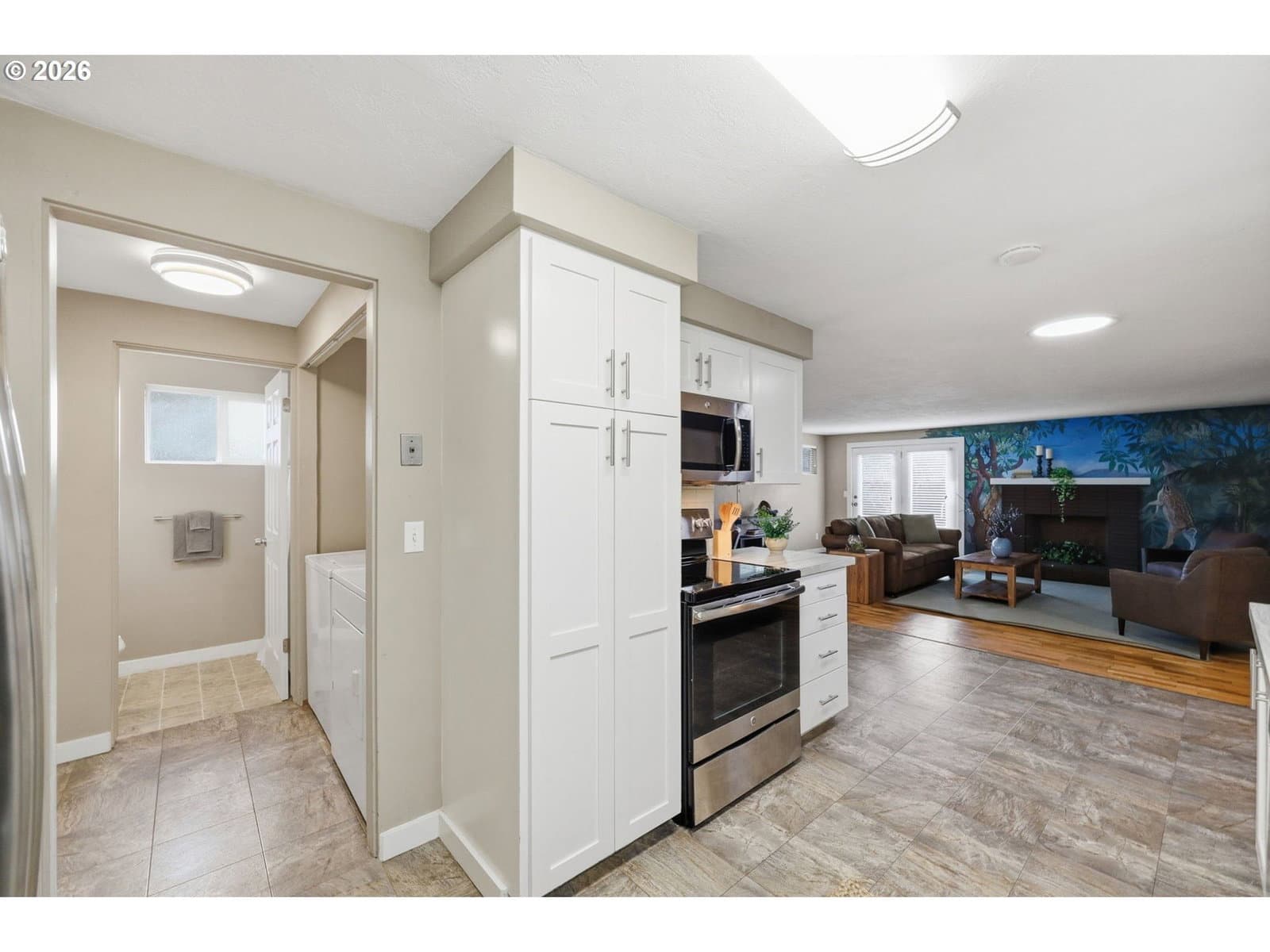 Completely renovated in 2017, this 1960 home offering 1,652sq ft of light-filled living space with an open floor plan and warm, contemporary style. Located at the end of a quiet dead-end street on a private 1/3-acre lot with landscaping done by a master gardener. This home offers peace and space. The fantastic kitchen features stainless steel appliances and abundant storage, opening seamlessly to the main living areas. Hardwood floors, a wood-burning fireplace, and French doors add warmth and character. A large bonus room or 4th bedroom with a separate entrance provides excellent flexibility for guests, home office, or multigenerational living. The Master Gardener–designed yard is a true retreat, featuring many fruit trees, mature plantings, and a setting that is truly a bird’s paradise. Enjoy outdoor living with two inviting entertaining patios, plus year-round comfort with two ductless heating and A/C systems. A beautifully updated home in a tranquil setting—this one is special.