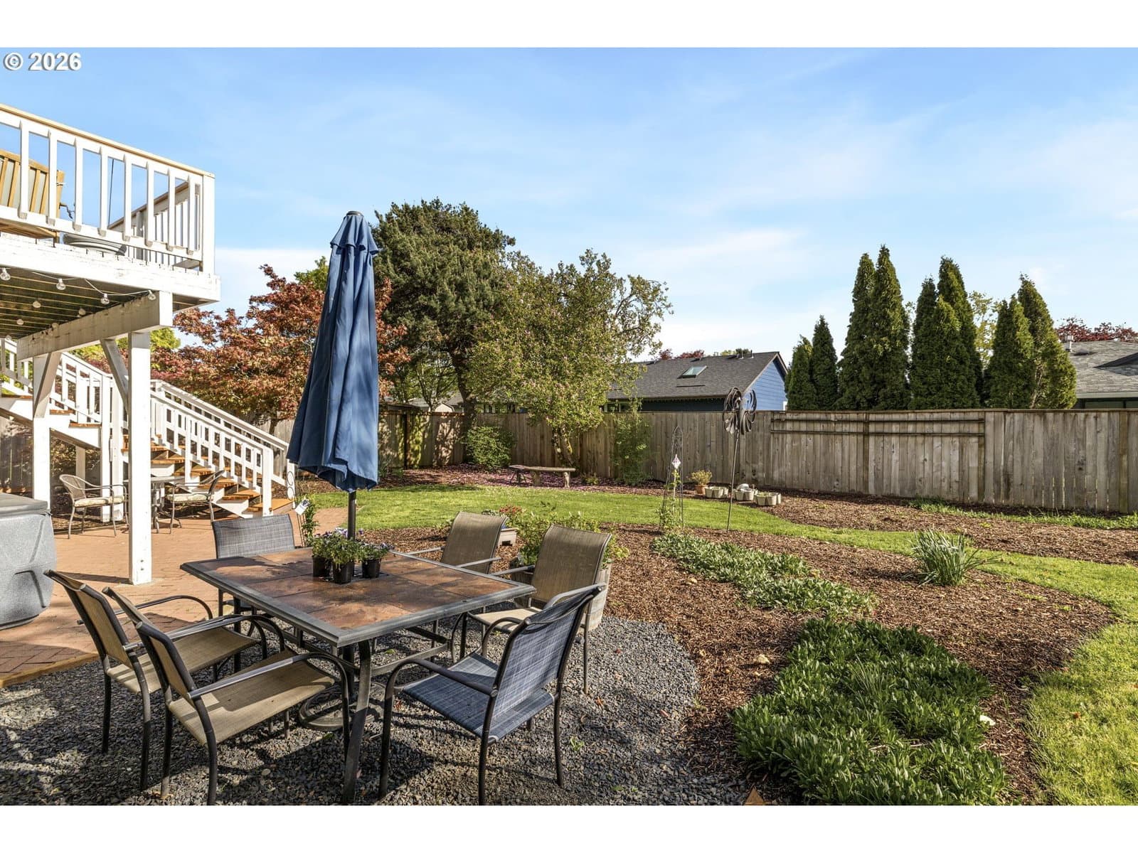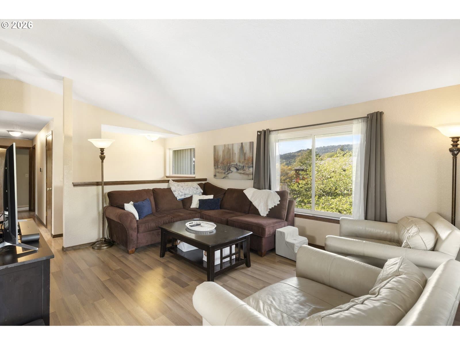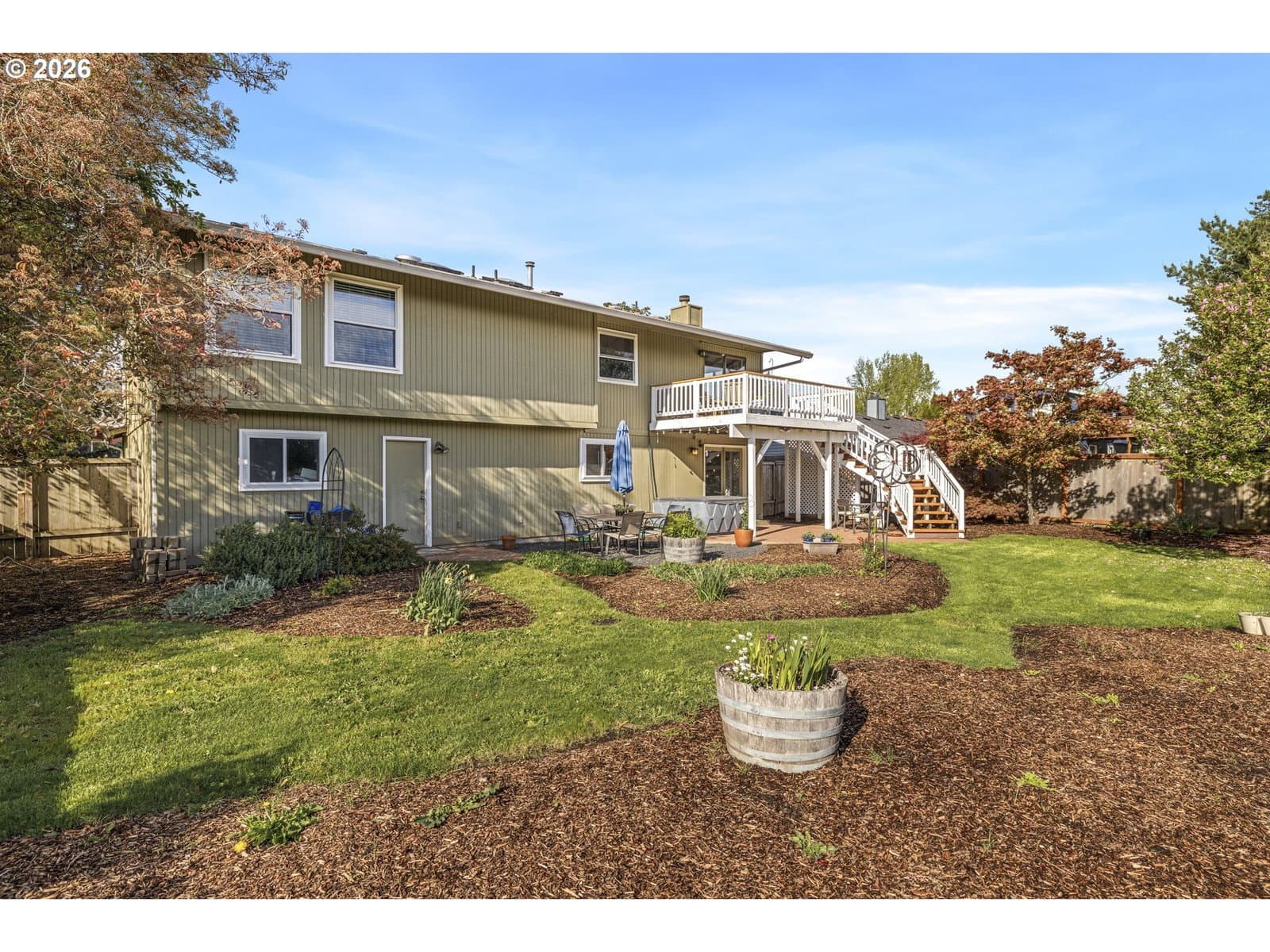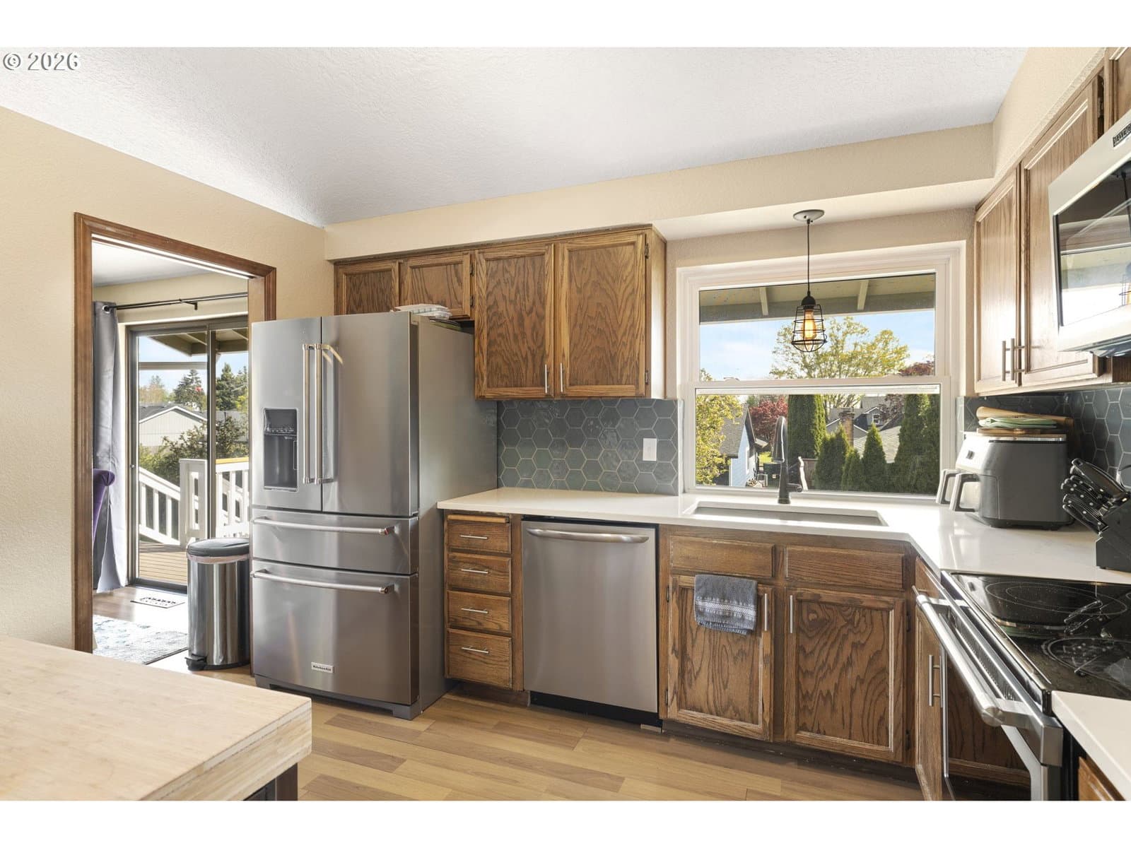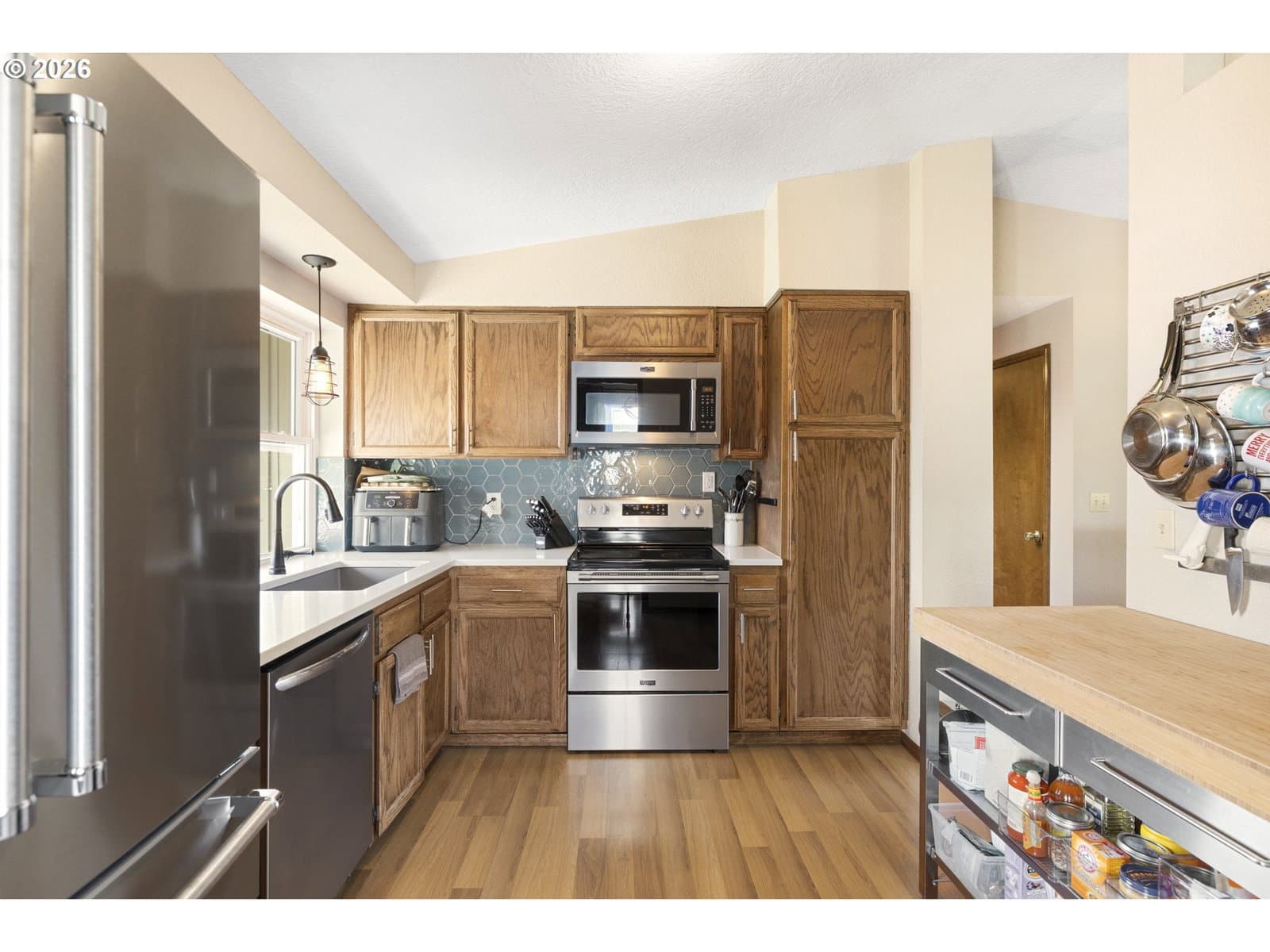 A well-planned split level that balances open living areas with flexible spaces below. Vaulted ceilings and easy-care laminate floors give the living and dining spaces an airy feel, flowing seamlessly into a well-designed kitchen with quartz counters and a standout tile backsplash. Three comfortable bedrooms all feature plush carpet, including a primary suite with double closets and its own private bath. Downstairs, a flexible lower level adapts to whatever you need right now: media room, guest space, homeschool setup, or a quiet retreat. The oversized, extra-deep garage is a major bonus with room for storage, projects, or a full-on hobby space or home gym. Out back, enjoy a fully fenced yard with mature foliage, plus both a deck and covered patio for year-round use. Smart upgrades are already in place with a smart thermostat, smart locks, and a smart garage door opener. Thoughtful spaces inside and out, paired with a location near parks, schools, and the Darnell Wright Sports Complex. Comfortable, functional, and ready for its next chapter!