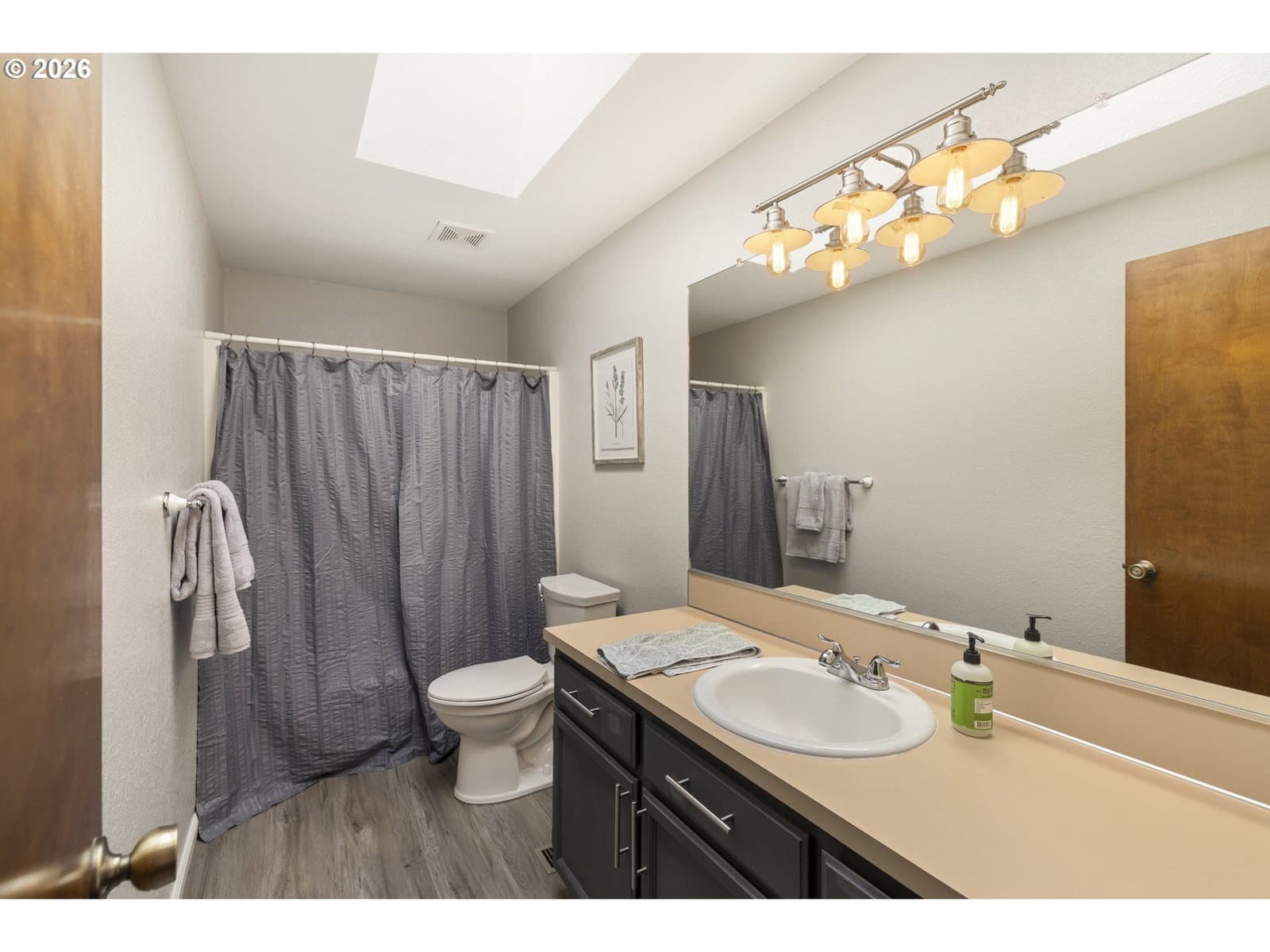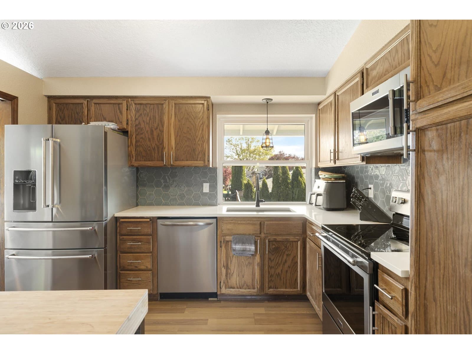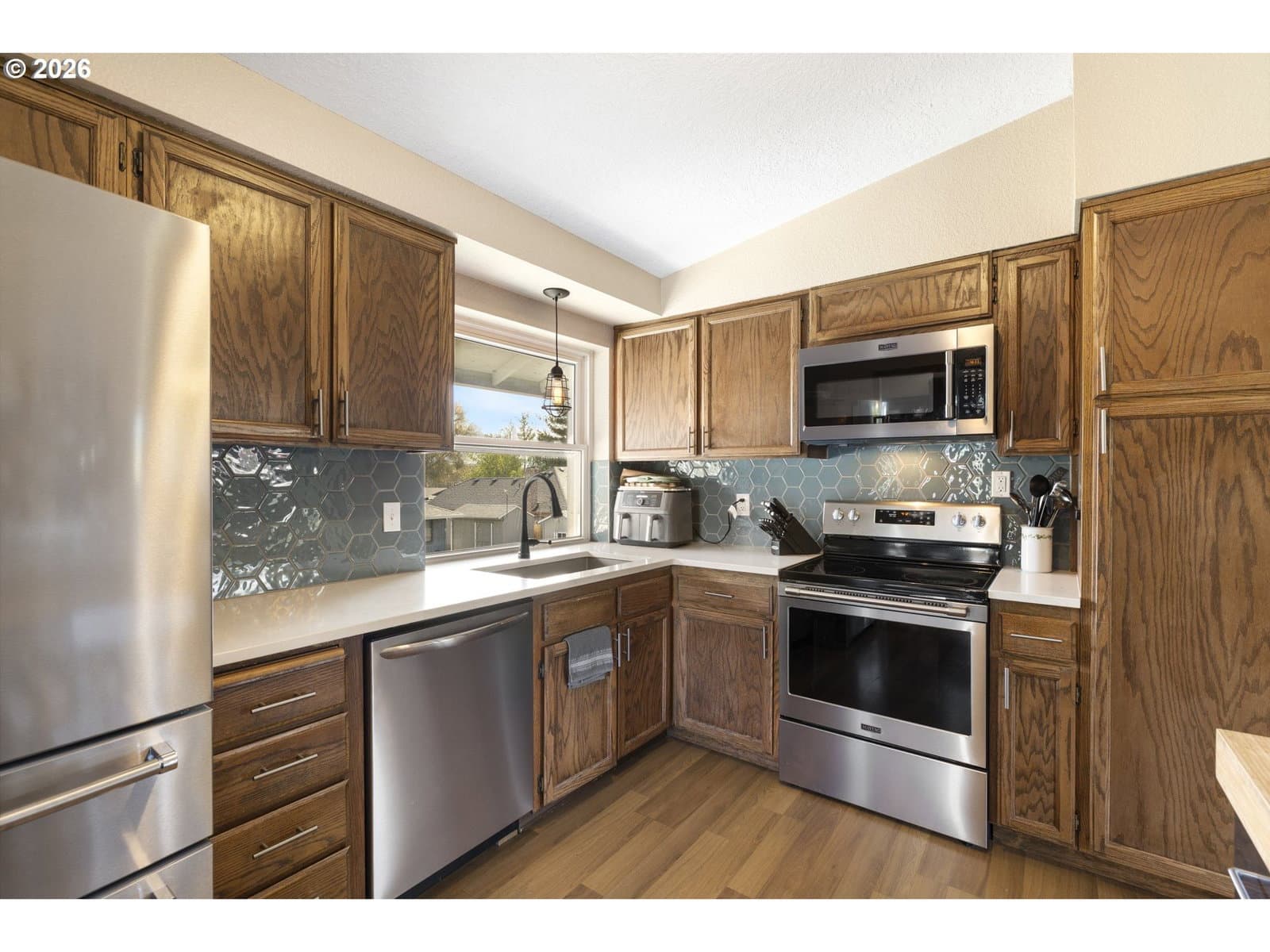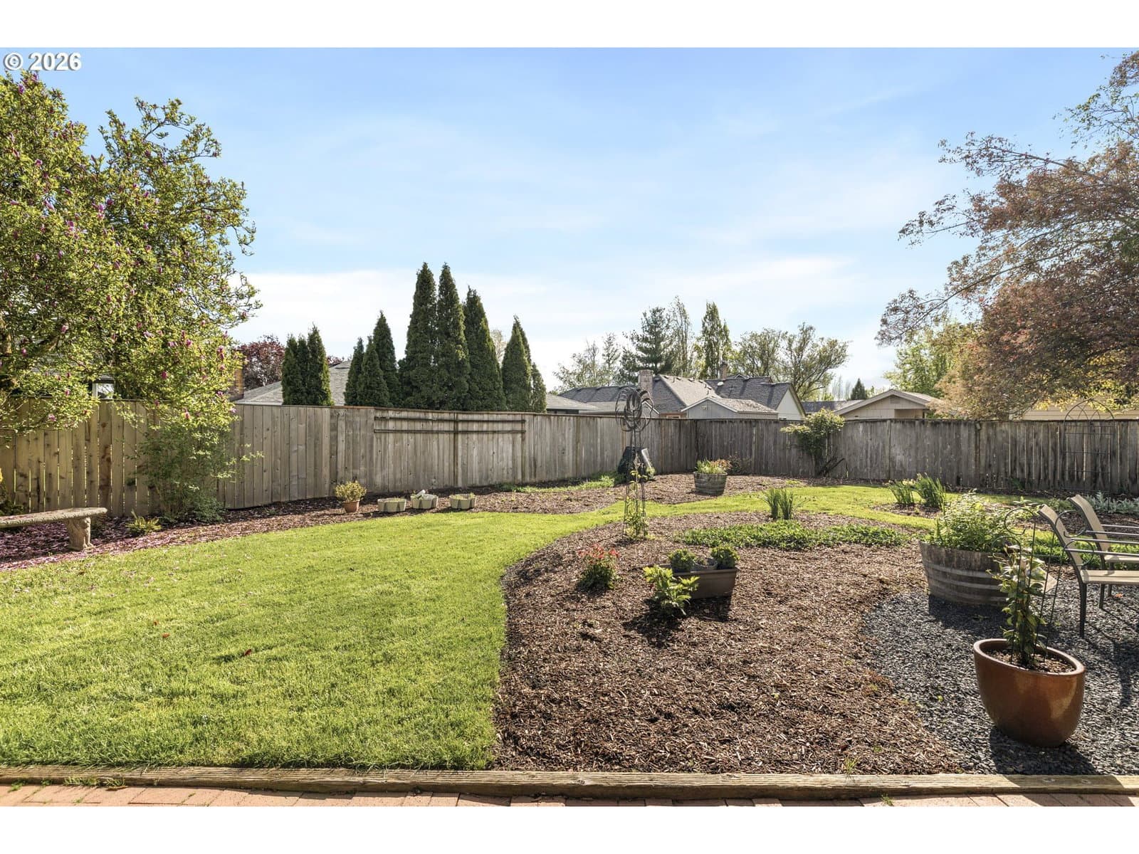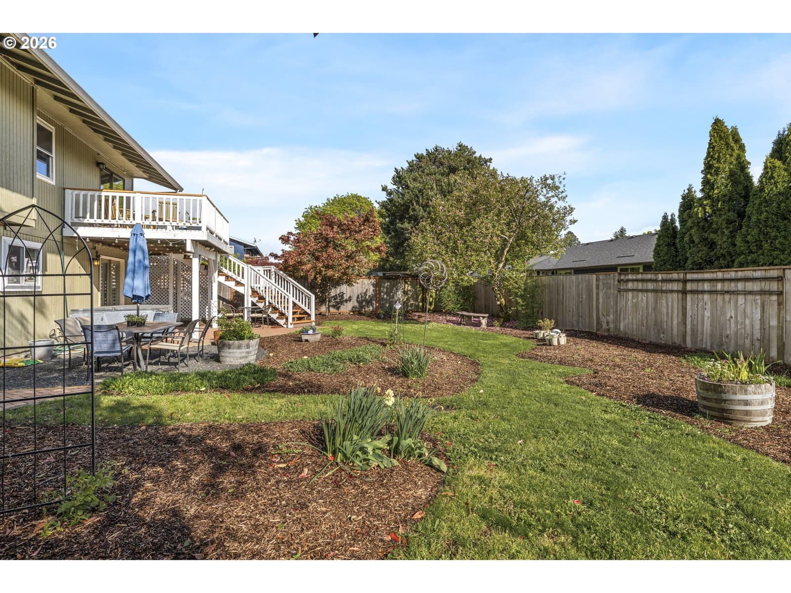 A well-planned split level that balances open living areas with flexible spaces below. Vaulted ceilings and easy-care laminate floors give the living and dining spaces an airy feel, flowing seamlessly into a well-designed kitchen with quartz counters and a standout tile backsplash. Three comfortable bedrooms all feature plush carpet, including a primary suite with double closets and its own private bath. Downstairs, a flexible lower level adapts to whatever you need right now: media room, guest space, homeschool setup, or a quiet retreat. The oversized, extra-deep garage is a major bonus with room for storage, projects, or a full-on hobby space or home gym. Out back, enjoy a fully fenced yard with mature foliage, plus both a deck and covered patio for year-round use. Smart upgrades are already in place with a smart thermostat, smart locks, and a smart garage door opener. Thoughtful spaces inside and out, paired with a location near parks, schools, and the Darnell Wright Sports Complex. Comfortable, functional, and ready for its next chapter!