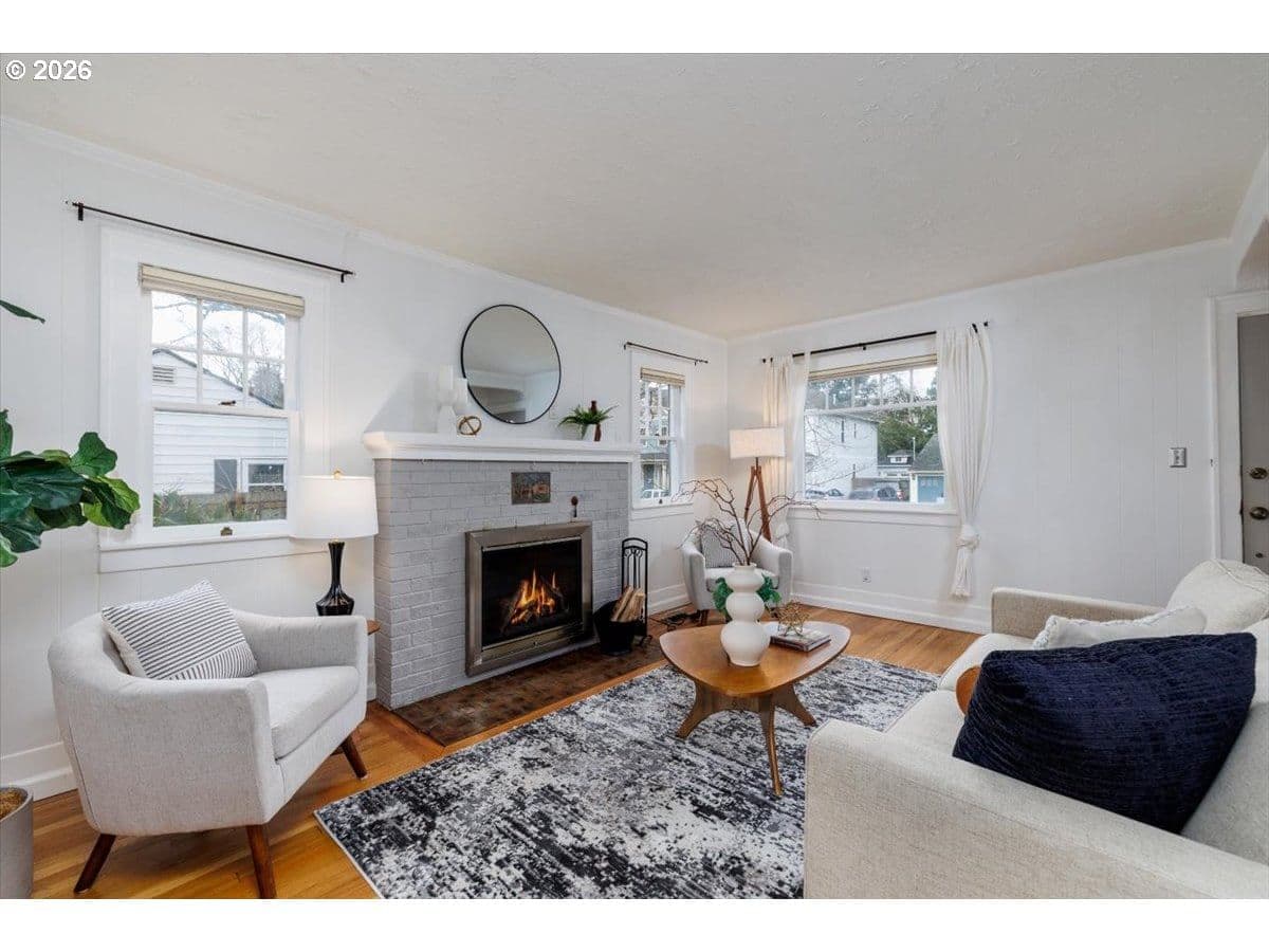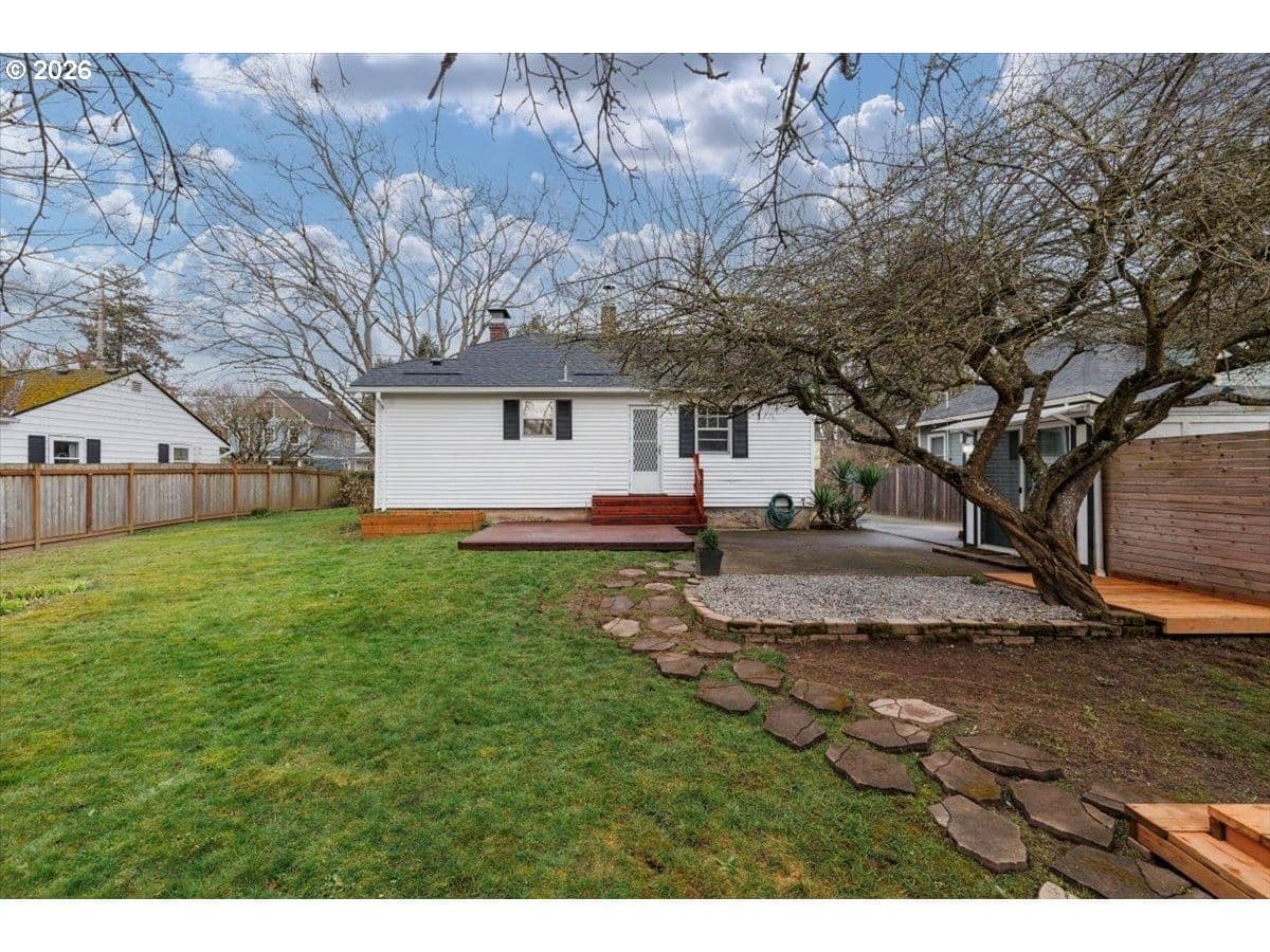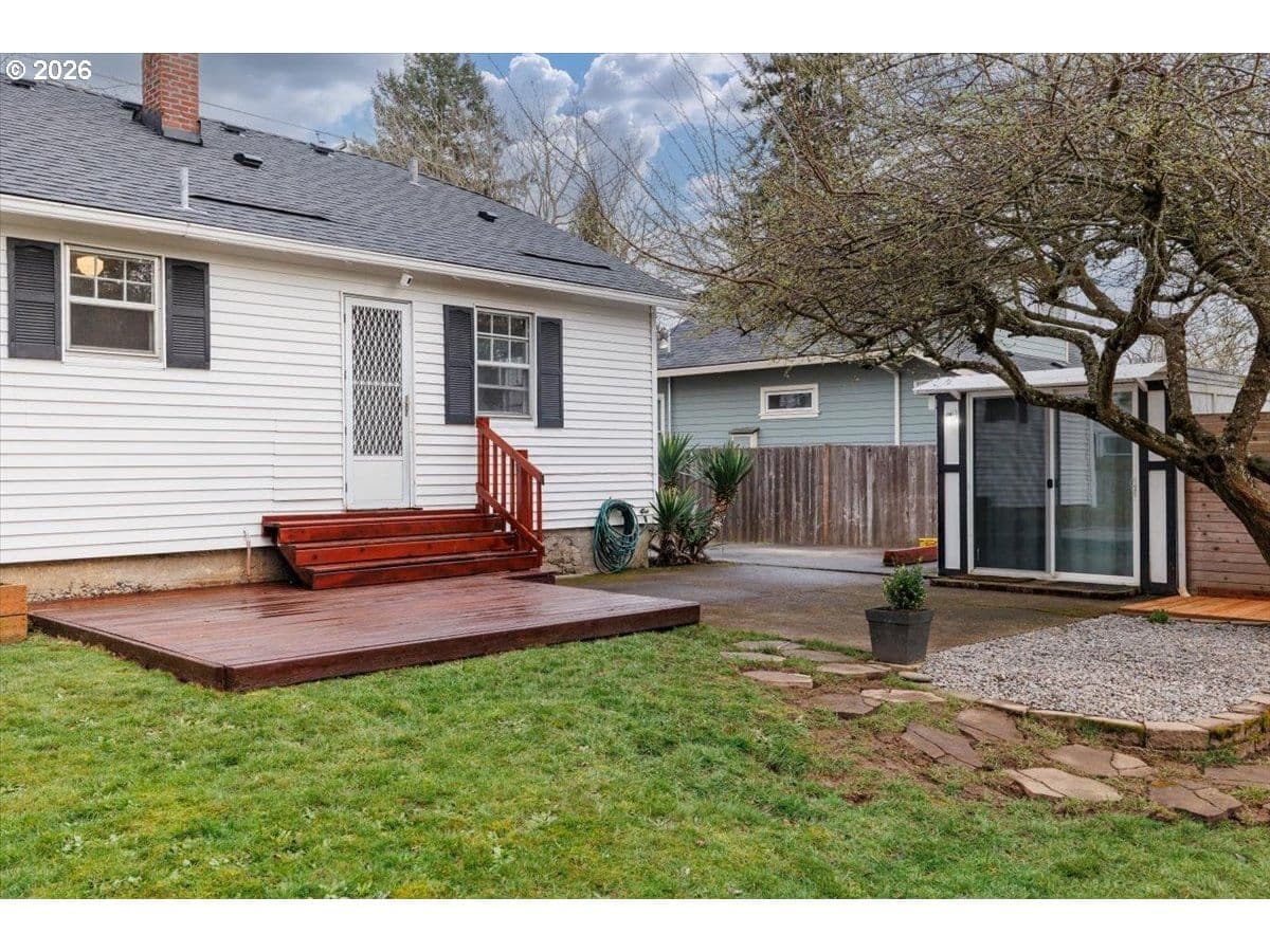 Charming St. Johns bungalow with a brand-new roof, oversized sunny lot, and a detached "Studio" ideal for hobbies or a creative space. This light-filled home blends timeless character with thoughtful updates and offers two bedrooms and one bath on the main level. The bright kitchen features classic wood cabinetry, granite countertops, a farmhouse sink, and an inviting dining nook with built-in storage. The living room is filled with natural light and anchored by a wood-burning fireplace. The basement expands the home’s flexibility with laundry, abundant storage, and a versatile flexspace perfect for a bonus room, office, hobby area, or potential third bedroom with an existing egress window. Outside, enjoy the large, flat backyard with excellent sun exposure perfect for gardening, entertaining, or relaxing. The property includes a detached outbuilding offering flexible space for storage, hobbies, or creative pursuits, as well as an additional workshop/storage shed. Located adjacent to George Park and just minutes from Daydreamer Coffee, St. Johns food pods, and the vibrant St. Johns downtown district, this home offers a wonderful blend of neighborhood charm and everyday convenience.