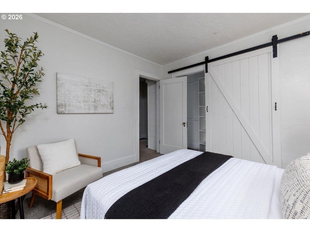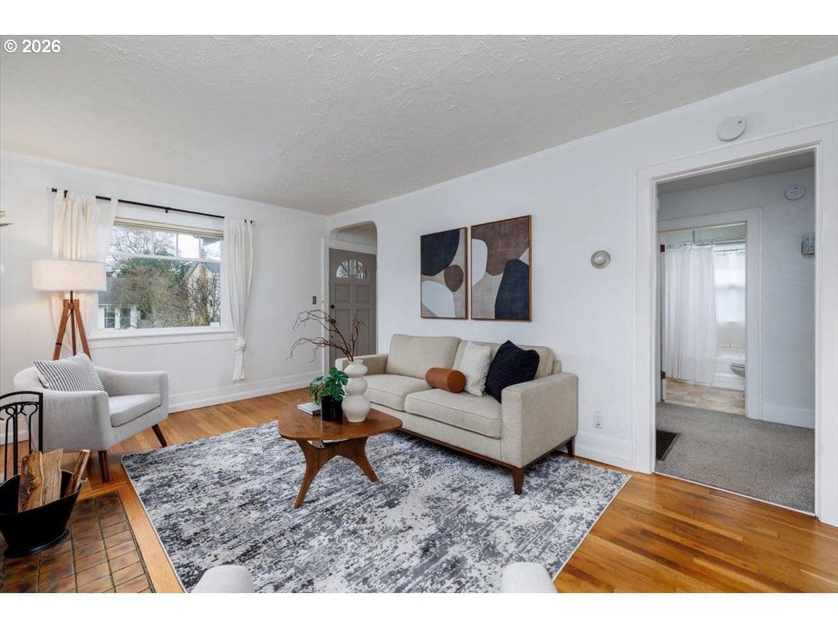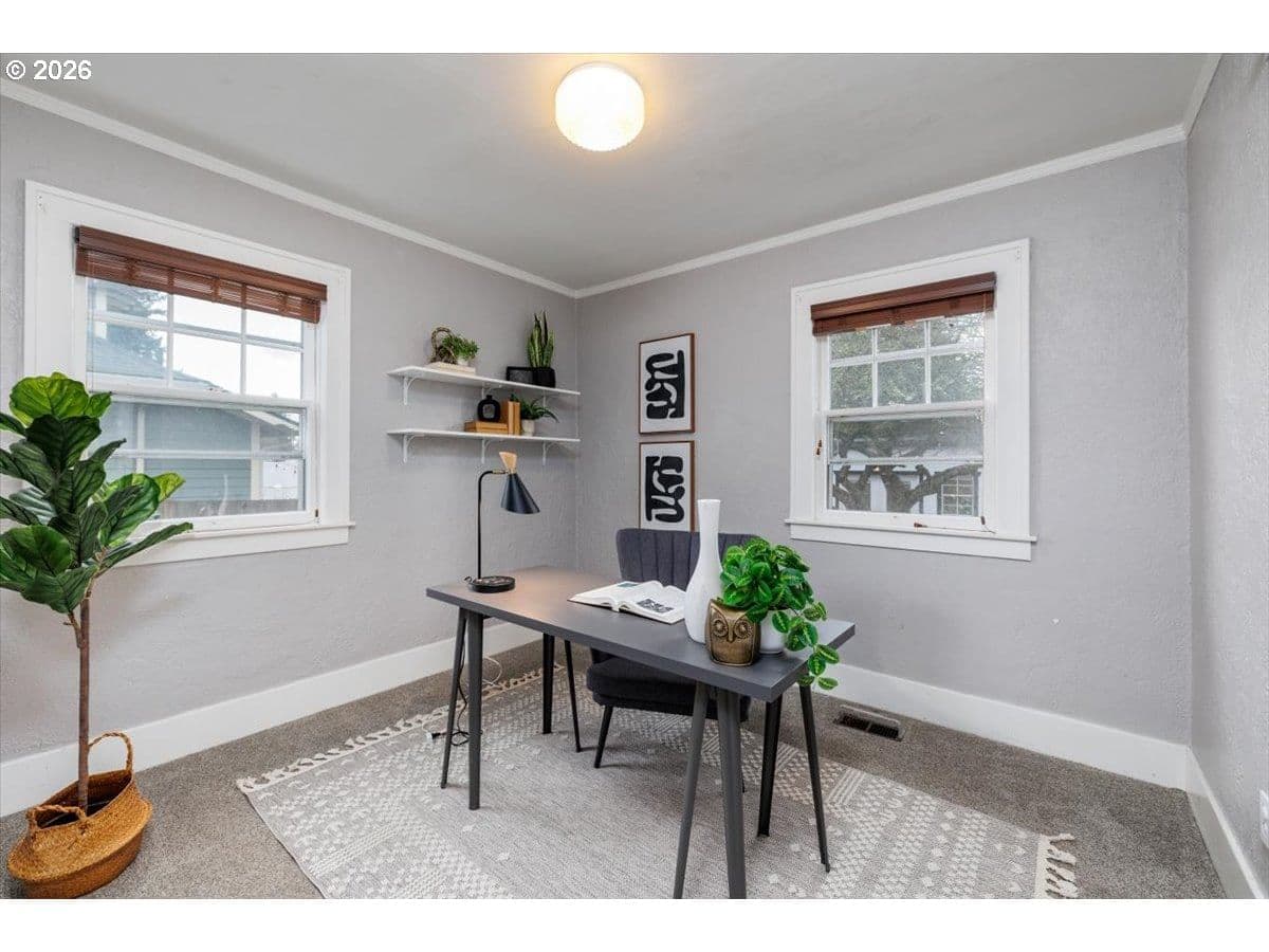 Charming St. Johns bungalow with a brand-new roof, oversized sunny lot, and a detached "Studio" ideal for hobbies or a creative space. This light-filled home blends timeless character with thoughtful updates and offers two bedrooms and one bath on the main level. The bright kitchen features classic wood cabinetry, granite countertops, a farmhouse sink, and an inviting dining nook with built-in storage. The living room is filled with natural light and anchored by a wood-burning fireplace. The basement expands the home’s flexibility with laundry, abundant storage, and a versatile flexspace perfect for a bonus room, office, hobby area, or potential third bedroom with an existing egress window. Outside, enjoy the large, flat backyard with excellent sun exposure perfect for gardening, entertaining, or relaxing. The property includes a detached outbuilding offering flexible space for storage, hobbies, or creative pursuits, as well as an additional workshop/storage shed. Located adjacent to George Park and just minutes from Daydreamer Coffee, St. Johns food pods, and the vibrant St. Johns downtown district, this home offers a wonderful blend of neighborhood charm and everyday convenience.