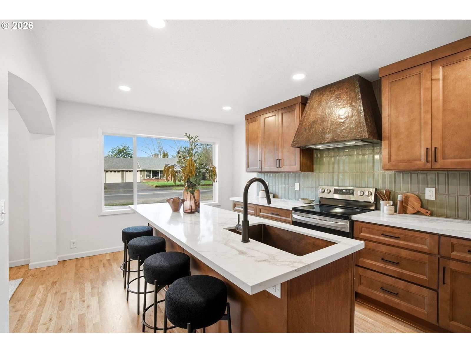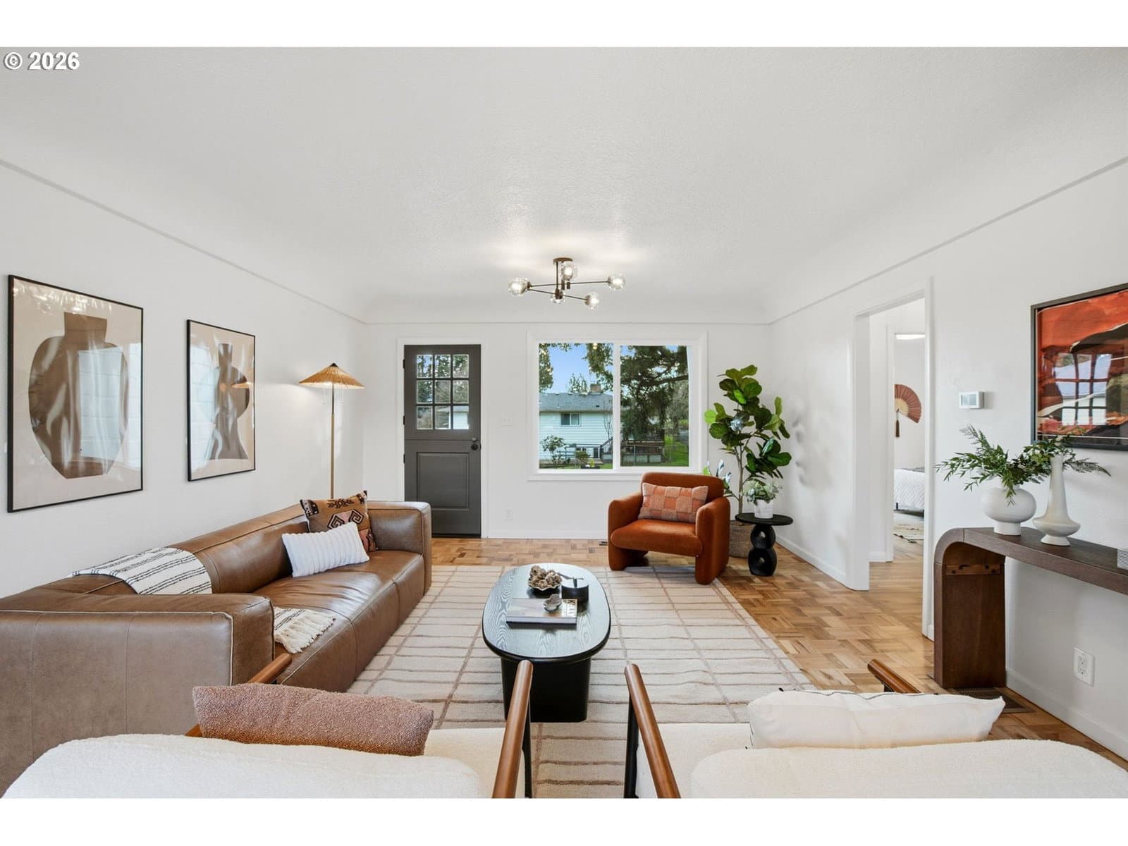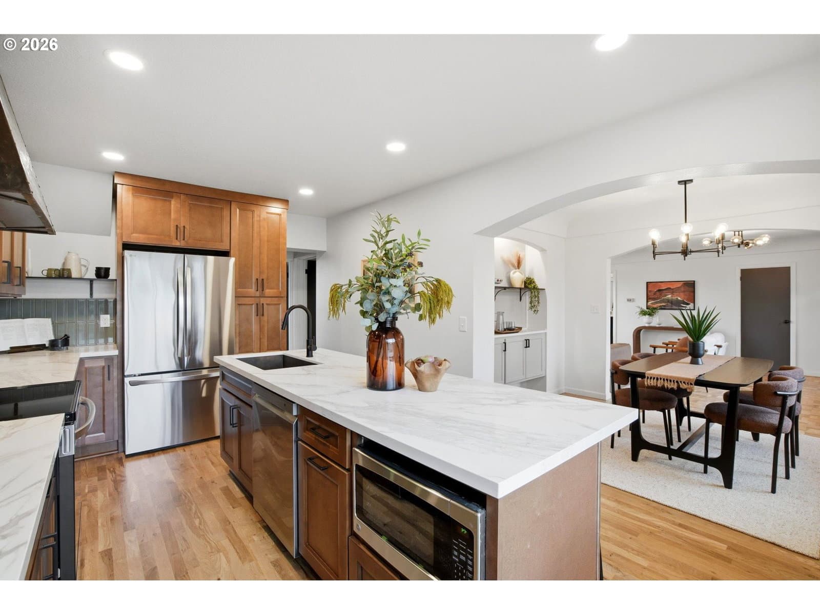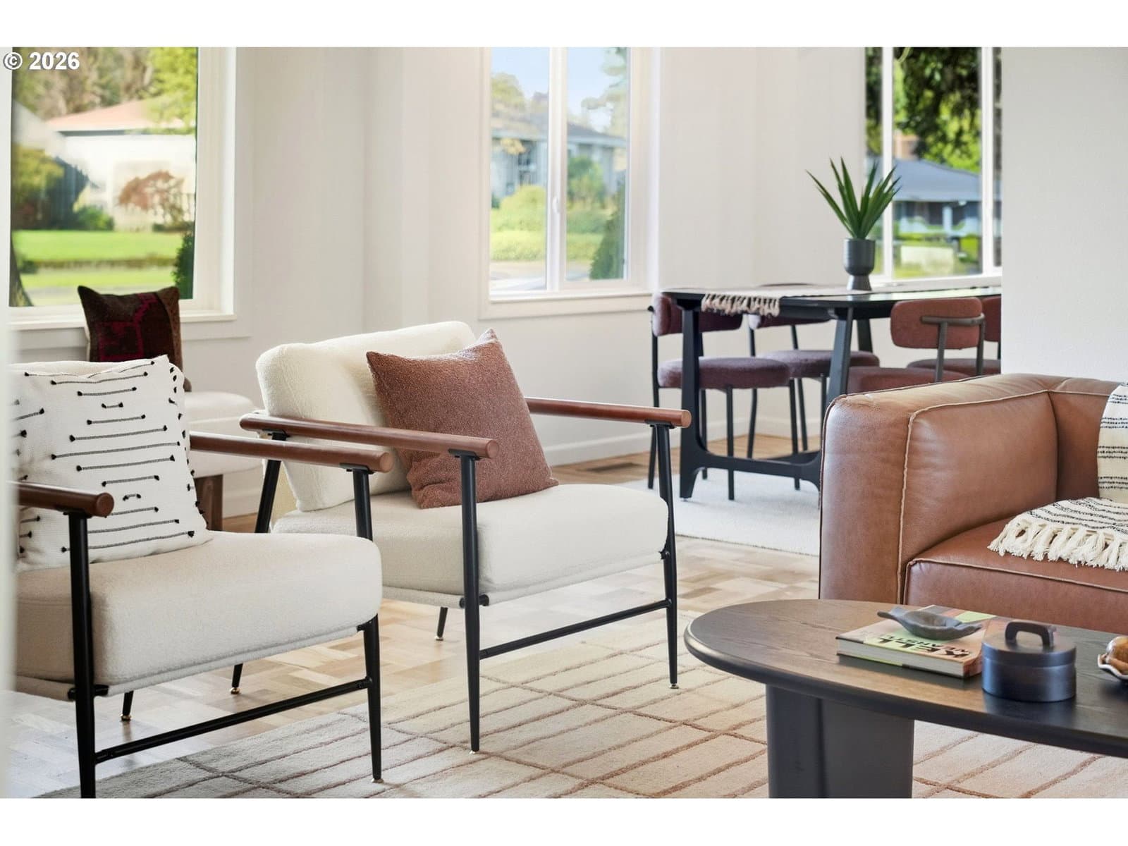 Thoughtfully reimagined classic with confidence and edge, this home delivers a renovation that feels intentional from top to bottom. Original character has been preserved where it matters, while the home has been fully upgraded with new systems, refined finishes, and a layout that works. Inside, restored original hardwood and parquet floors set the tone, leading into a brand-new kitchen centered around a dramatic 9 foot island, designed for gathering, cooking, and everyday living. LG appliances and Delta fixtures bring clean functionality, while a striking vintage copper hood over the range adds a sculptural focal point that anchors the space with personality. A custom dining room bar and newly created office space add smart flexibility for entertaining and work-from-home life. The main level offers two comfortable bedrooms, a dedicated office, and an updated full bath with crisp, current finishes. Upstairs, the primary suite feels like its own level of calm, complete with a new walk-in closet and a generous bath featuring a deep soaking tub, tiled shower, double vanity, and separate toilet room designed for comfort. Beyond the design, the home has been comprehensively improved: updated plumbing and electrical with modern outlets and switches, new double-pane windows, Trane heat pump with A/C, new water heater, new roof and gutters, new sewer line, and a decommissioned oil tank. The result is an all-electric home built for efficiency, longevity, and peace of mind. This is a transformation that respects the home’s roots while delivering a fresh, confident take on everyday living. Distinctive, functional, and truly move-in ready, this Milwaukie home offers originality paired with substance.