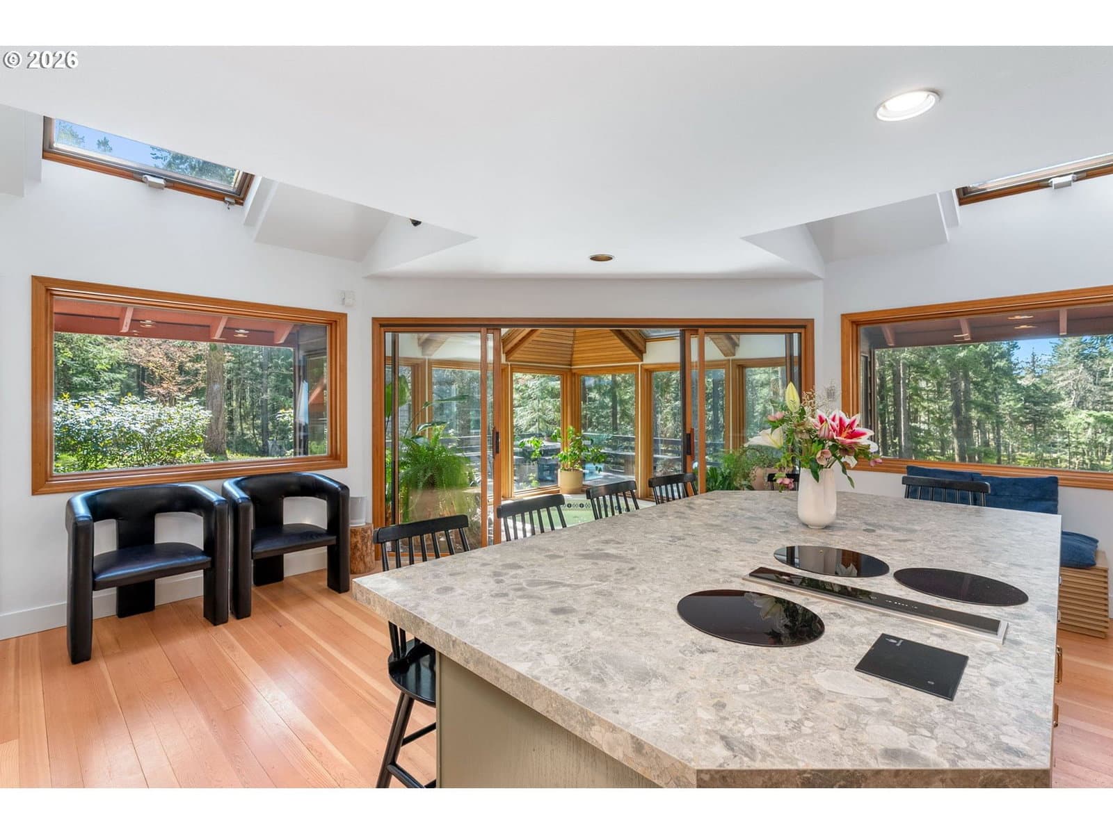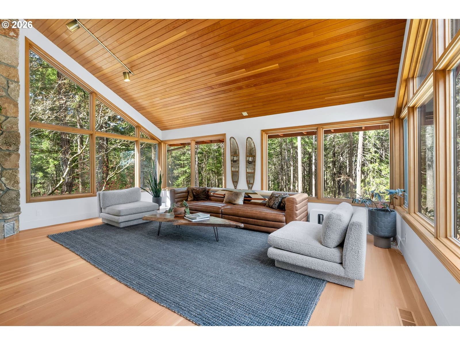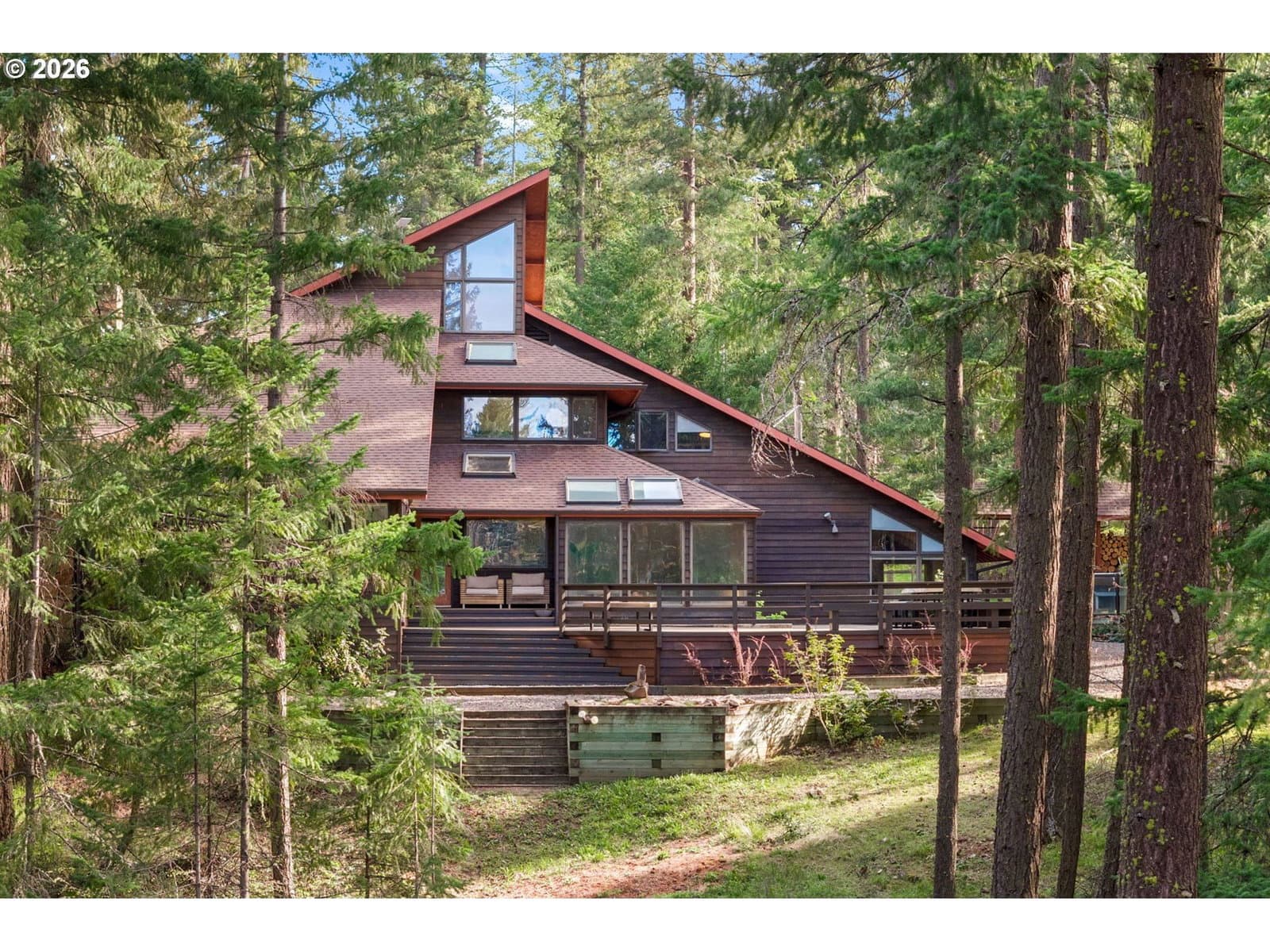 Indulge in nature, live in sophistication at this exceptional Paradise Ridge retreat. Set on a private, forested landscape with curated clearings and double mountain views of Mt. Adams and Mt. Hood, this 3,947 square foot residence offers 4 bedrooms and 2.5 bathrooms, blending refined design with the quiet beauty of the Columbia River Gorge. Extensive recent improvements elevate both form and function across the property. Inside, solid fir hardwood flooring creates warmth and continuity, complemented by custom wood accents and a fully reimagined interior. The kitchen has been thoughtfully opened and expanded, featuring premium surfaces including Dekton, honed granite, and quartz, along with high-end appliances designed for both performance and style. The main-level primary suite offers a spa-like experience with heated tile flooring and elevated finishes, while additional bathrooms and the laundry room have been tastefully updated. A custom fir and glass entry door makes a striking first impression, setting the tone for the craftsmanship found throughout. The indoor hot tub room is set within a light-filled solarium space, creating a unique year-round retreat. Outdoor living is equally intentional. The grounds have been enhanced with a resurfaced drive, expanded guest and RV parking, and improved drainage and landscaping. A private trail system winds through the property, leading to a peaceful fire pit setting and a newly installed pond, creating multiple spaces to relax, gather, and connect with the land. Extensive fire mitigation and forest stewardship work have been completed to improve long-term land health, while also opening up view corridors and enhancing the overall setting. This is a rare opportunity to own a meticulously improved property where natural beauty and thoughtful design come together seamlessly. Everyday living meets peaceful retreat here, with the option to purchase the neighboring 5-acre parcel for even more space and privacy (MLS 411556320). The association is only in place for road maintenance/snow removal on Paradise Ridge Rd.