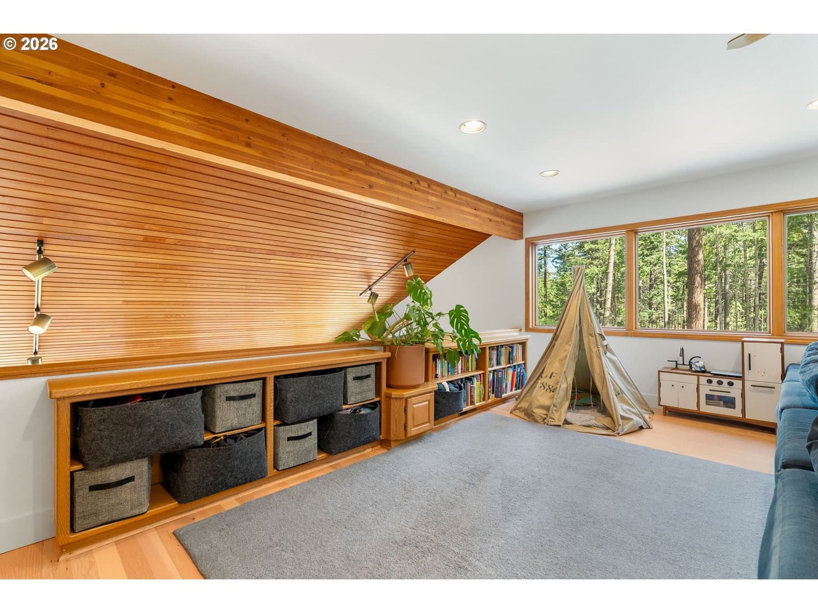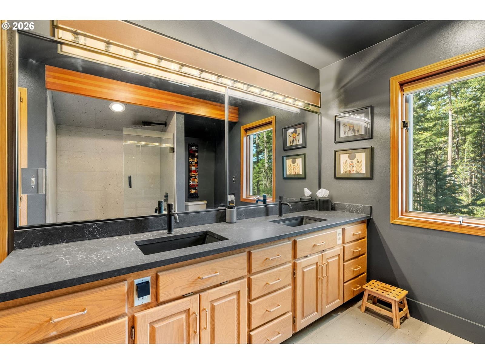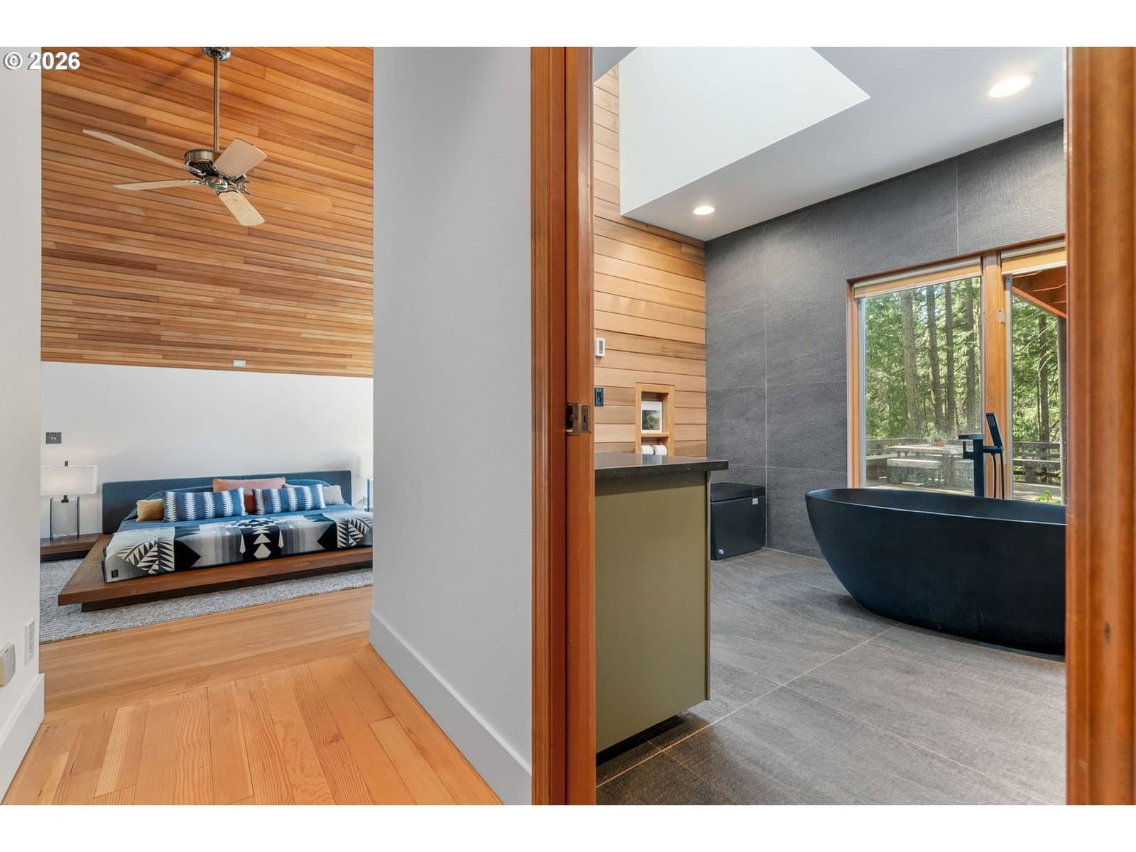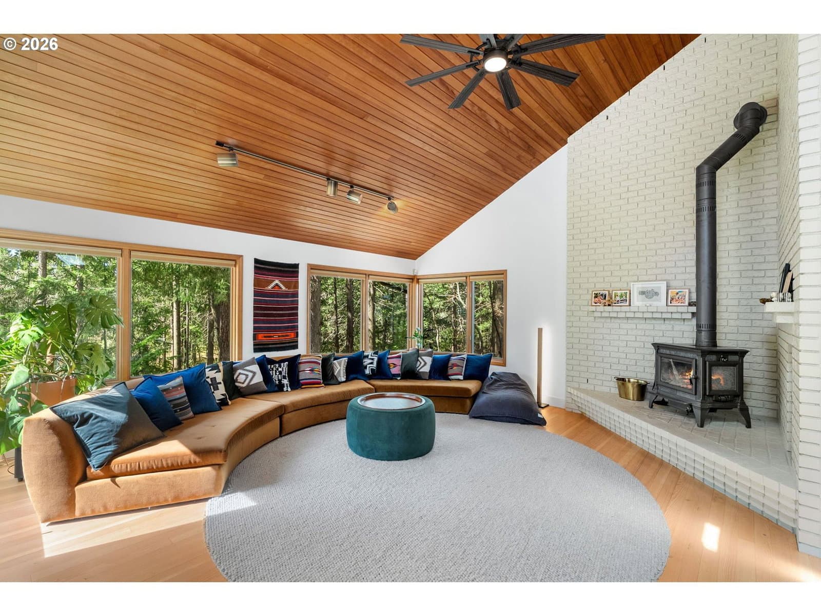 Indulge in nature, live in sophistication at this exceptional Paradise Ridge retreat. Set on a private, forested landscape with curated clearings and double mountain views of Mt. Adams and Mt. Hood, this 3,947 square foot residence offers 4 bedrooms and 2.5 bathrooms, blending refined design with the quiet beauty of the Columbia River Gorge. Extensive recent improvements elevate both form and function across the property. Inside, solid fir hardwood flooring creates warmth and continuity, complemented by custom wood accents and a fully reimagined interior. The kitchen has been thoughtfully opened and expanded, featuring premium surfaces including Dekton, honed granite, and quartz, along with high-end appliances designed for both performance and style. The main-level primary suite offers a spa-like experience with heated tile flooring and elevated finishes, while additional bathrooms and the laundry room have been tastefully updated. A custom fir and glass entry door makes a striking first impression, setting the tone for the craftsmanship found throughout. The indoor hot tub room is set within a light-filled solarium space, creating a unique year-round retreat. Outdoor living is equally intentional. The grounds have been enhanced with a resurfaced drive, expanded guest and RV parking, and improved drainage and landscaping. A private trail system winds through the property, leading to a peaceful fire pit setting and a newly installed pond, creating multiple spaces to relax, gather, and connect with the land. Extensive fire mitigation and forest stewardship work have been completed to improve long-term land health, while also opening up view corridors and enhancing the overall setting. This is a rare opportunity to own a meticulously improved property where natural beauty and thoughtful design come together seamlessly. Everyday living meets peaceful retreat here, with the option to purchase the neighboring 5-acre parcel for even more space and privacy (MLS 411556320). The association is only in place for road maintenance/snow removal on Paradise Ridge Rd.