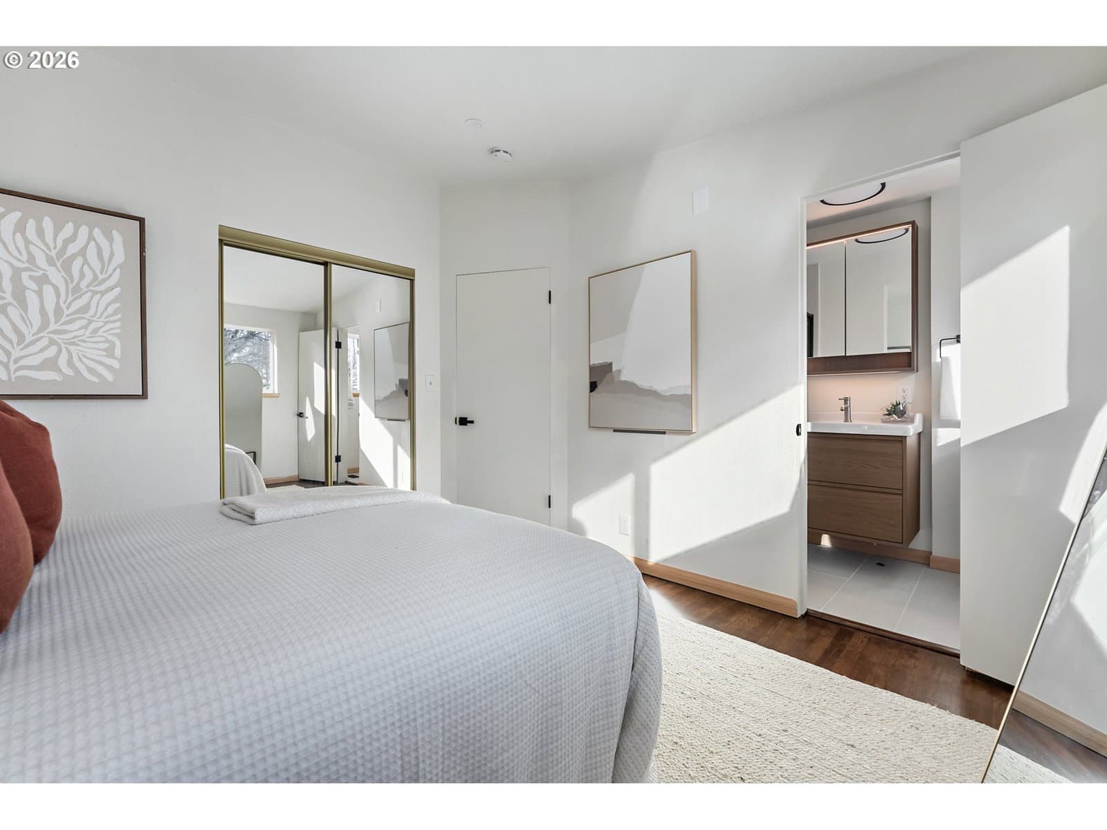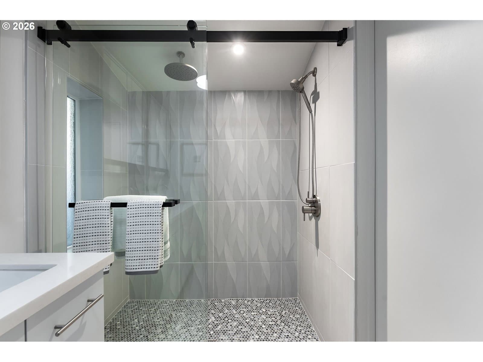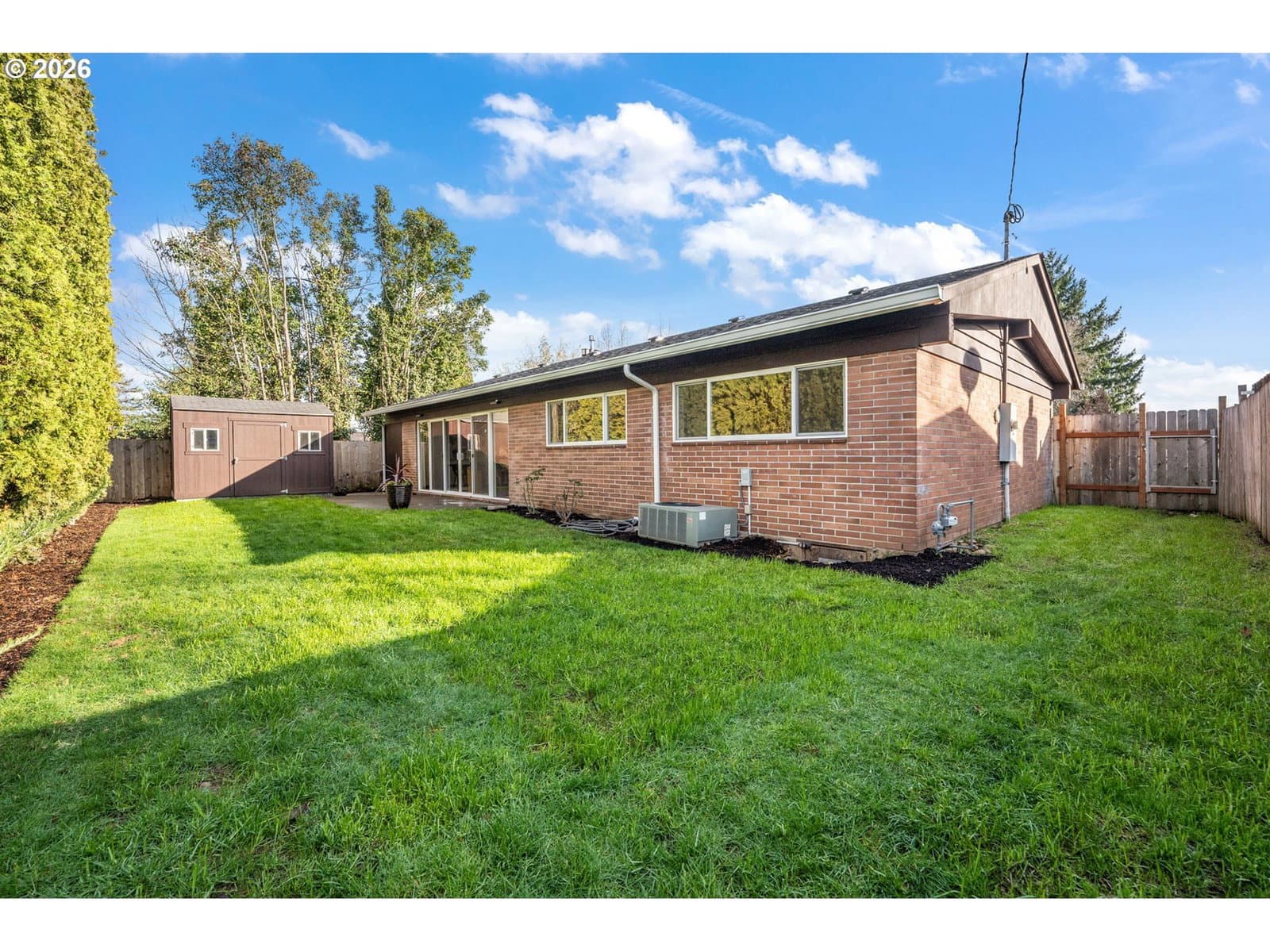 Meticulously updated 1956 mid-century modern ranch with contemporary finishes. Original hardwood floors, period double fireplace, vaulted ceilings. Beautifully remodeled kitchen with custom solid wood cabinets, quartz counters, large pantry, and stainless-steel appliances, including a built-in induction range that flows to a cozy family room and spacious entry. The light and airy living & dining space opens to the fully fenced back yard with an expansive patio that is perfect for outdoor entertaining. A total of four bedrooms and three full baths, including a primary suite with a vaulted tongue and groove wood ceiling, double closets, walk-in shower and custom tile work. A second primary also offers a vaulted ceiling, a walk-in shower and custom tile work. New windows, roof, plumbing, updated electrical, interior and exterior paint, and furnace. The home offers a large tool/garden shed and enclosed exterior storage area on the north side of the home. [Home Energy Score = 1. HES Report at https://rpt.greenbuildingregistry.com/hes/OR10236922]