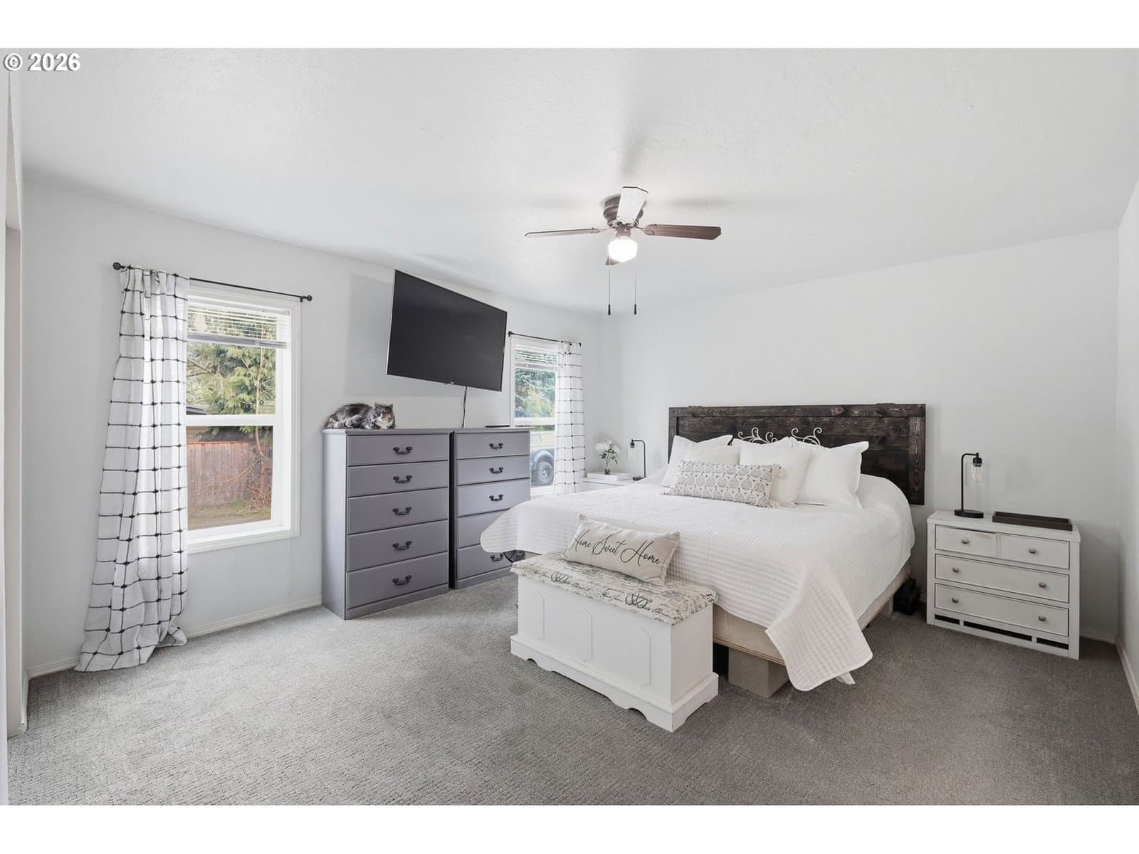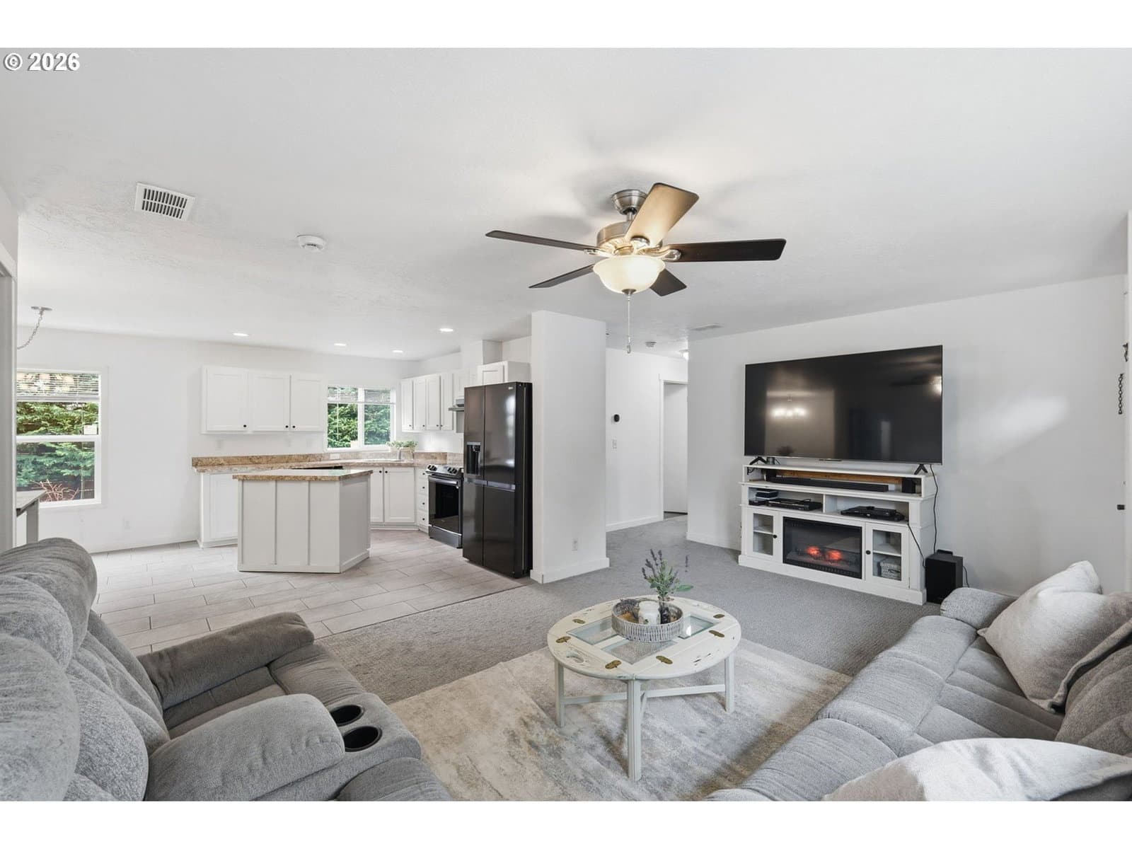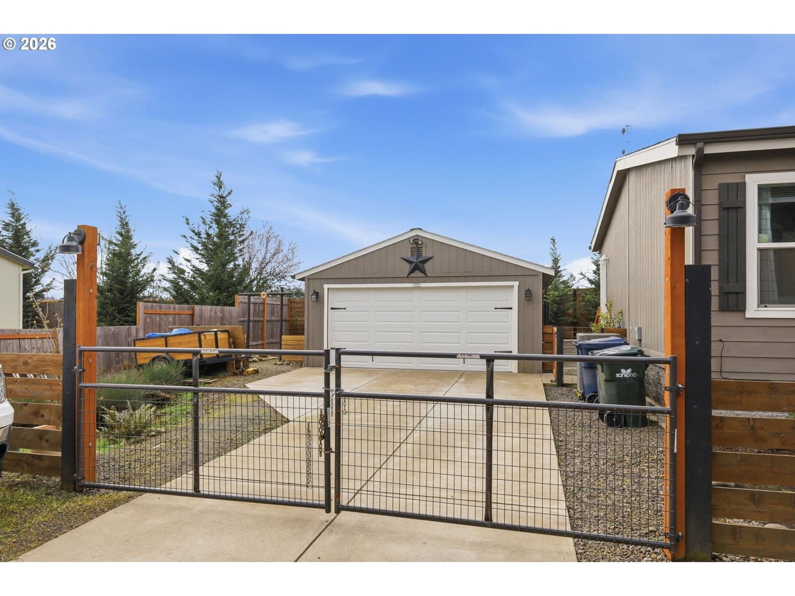 Enjoy easy living in this updated 2018 manufactured home on its own land with no HOA. This well-maintained one-level home offers a bright, open layout designed for comfort and functionality. The spacious open floor plan connects the living area and kitchen, creating an inviting space for everyday living and entertaining. The kitchen features an island, dishwasher, refrigerator, and newer stove, offering plenty of room for cooking and gathering. The home offers great separation of space, with a large primary suite that includes two closets—one walk-in—and a private spacious bathroom with double sinks, giving you a relaxing retreat at the end of the day. Additional highlights include forced air heat with a heat pump for efficient heating and air conditioning, plus a large indoor laundry room for added convenience. Step outside to enjoy the fully fenced yard with plenty of space, a deck for outdoor relaxing, RV Parking and a large double gate for easy access. The 400 sq. ft. detached garage provides excellent flexibility—perfect for parking, storage, or a workshop. Move-in ready and offering space, comfort, and versatility—this is one you won’t want to miss.