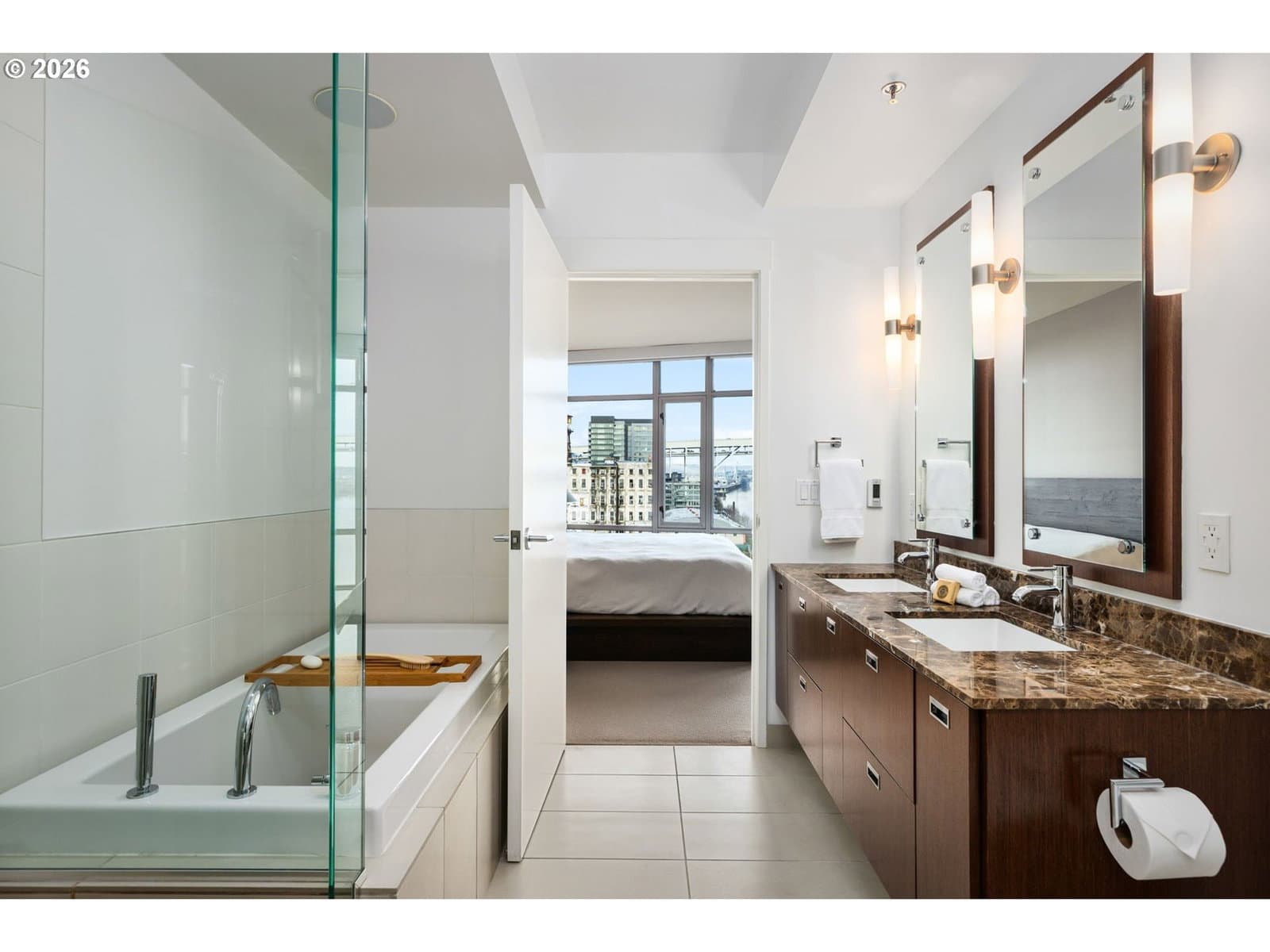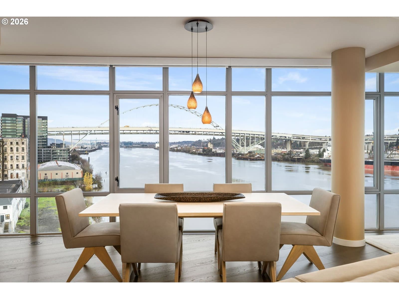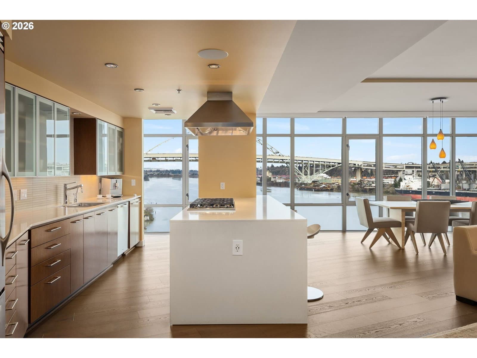 Effortless Luxury Meets Willamette River Views. Experience the pinnacle of one-level waterfront living in this completely reimagined Waterfront Pearl Penthouse. Recently transformed with meticulous attention to detail, this residence features state-of-the-art electronic solar shades, premium pre-engineered hardwood flooring, and designer finishes throughout—creating a sophisticated sanctuary designed for the modern lock-and-leave lifestyle. Floor-to-ceiling windows frame panoramic views of the Portland Skyline and Willamette River, while the open-concept living space flows seamlessly to two private terraces facing northwest and east. The chef's kitchen showcases Viking stainless steel appliances and an integrated wine cooler, perfect for entertaining or quiet evenings at home. Retreat to dual ensuite bedrooms, each appointed with custom closets and spa-inspired baths. The versatile media room offers flexibility as a home office, guest space, or private lounge—all with captivating river views. Worry-free living features 24/7 concierge service, a private fitness center with a sauna, secure side-by-side parking with EV charging, and climate-controlled storage. Steps from Pearl District galleries, acclaimed restaurants, and riverside trails, you are positioned at the heart of Portland's most coveted neighborhood. The Waterfront Pearl is more than a home, it is a "Lifestyle Refined".