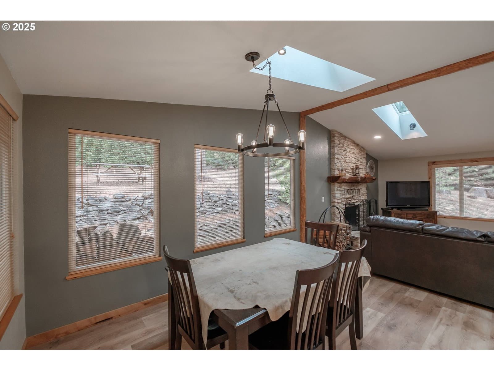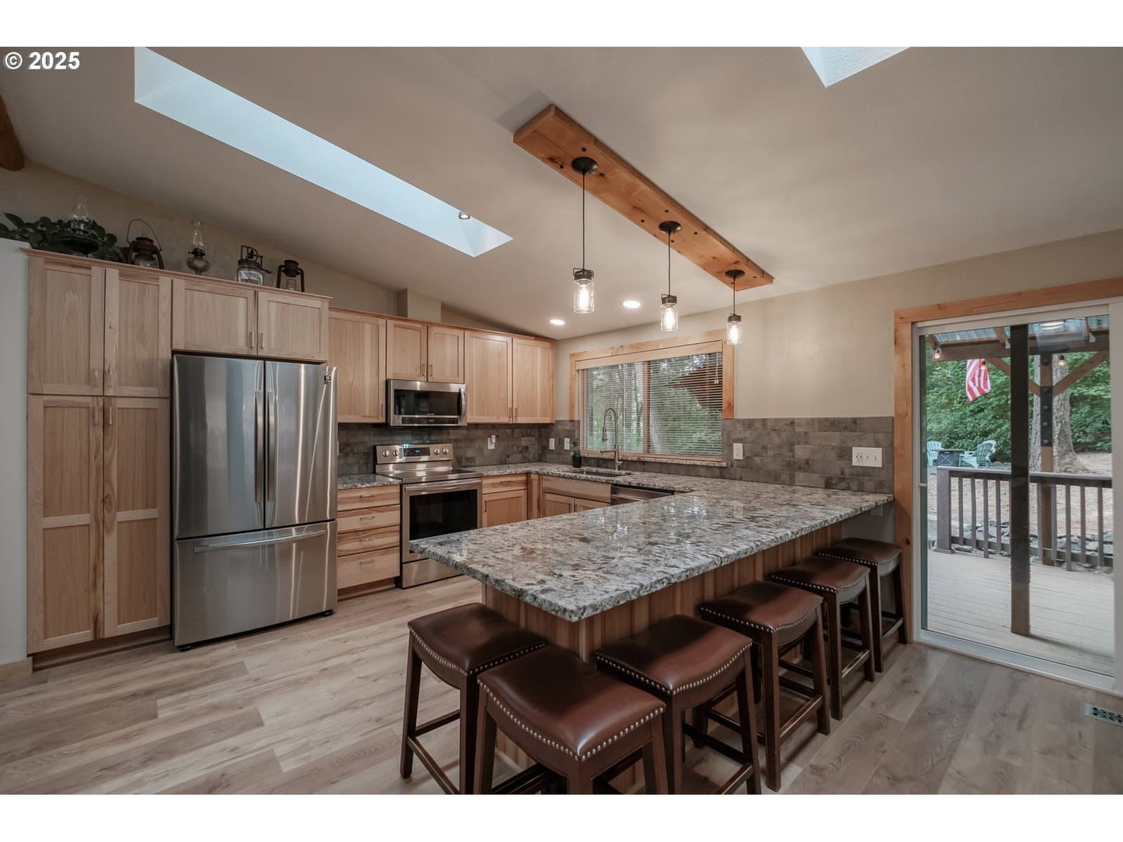 Beautifully maintained 4-bed, 2-bath tri-level on 0.50 acre in Philomath with 2,258 sq ft of living space. The main level boasts luxury vinyl plank flooring, open-concept design, skylights, and modern farmhouse fixtures. The kitchen shines with granite live-edge countertops, wood cabinetry, stainless steel appliances, large single-basin sink, island bar, and abundant storage. Relax in the living room with a stone, floor-to-ceiling wood-burning fireplace accented by log beams.