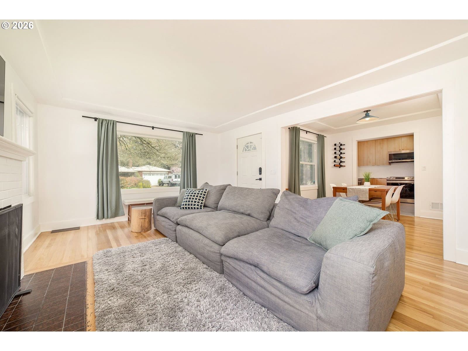 Charming, thoughtfully updated mid-century ranch set on a double-sized lot. Sunlight pours in through abundant windows, including two oversized picture windows that brighten the living and dining rooms. Relax by the wood-burning fireplace, seamlessly connected to the dining area, both featuring gleaming oak hardwood floors. The renovated kitchen offers a modern touch with quartz countertops, built-in appliances, and a convenient pantry. Both bedrooms include ceiling fans and stylish barn doors on the closets. Stay cool this summer with central AC installed in 2020. The bathroom features a beautifully tiled walk-in shower with rain showerhead option. Downstairs, the basement provides endless possibilities—perfect for a second living area, home office, or creative studio—plus a spacious laundry room. The finished one-car attached garage feels like an extension of the home and could serve as an exercise space, with additional storage available in the large backyard shed. Outside, enjoy a fully fenced, expansive yard lined with mature trees, along with a charming hydrangea garden and two established blueberry bushes. Located on a quiet, tree-lined street, this home is just minutes from the vibrant and growing NE Halsey district, offering coffee shops, organic groceries, and is only a few blocks from Gateway Discovery Park. Ask your agent for the LONG list of updates completed in the last 5 years.