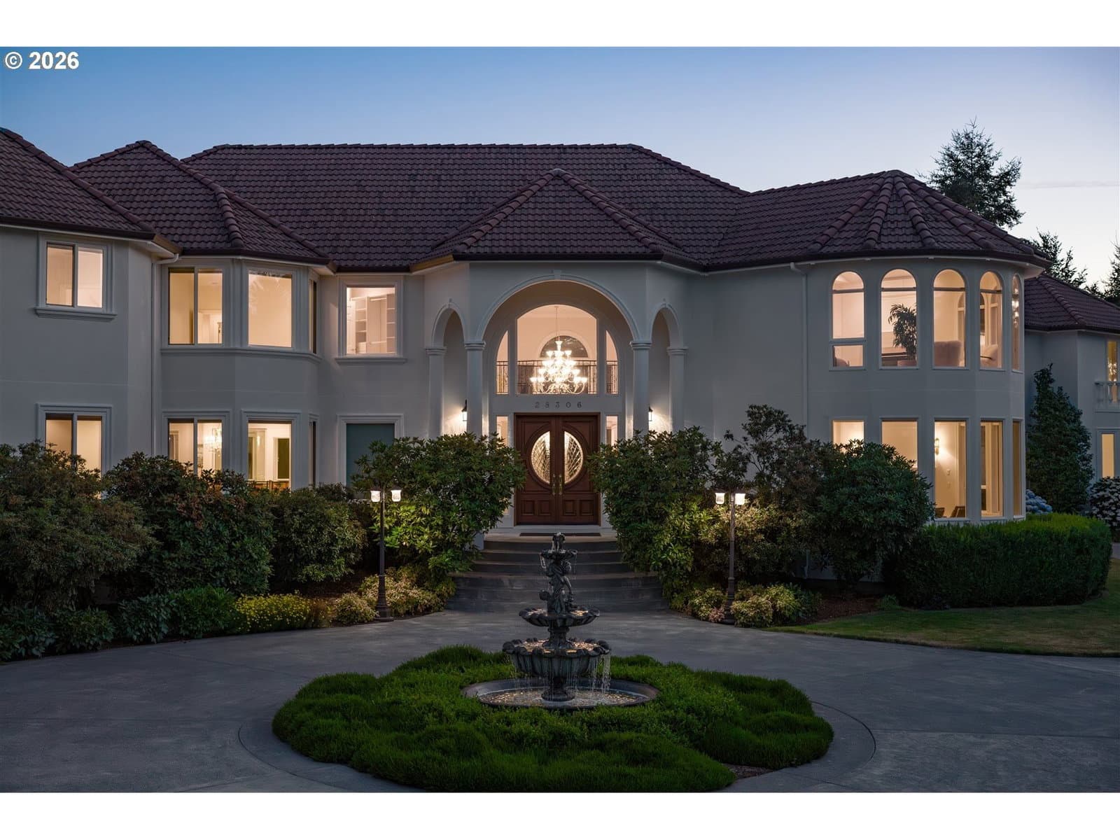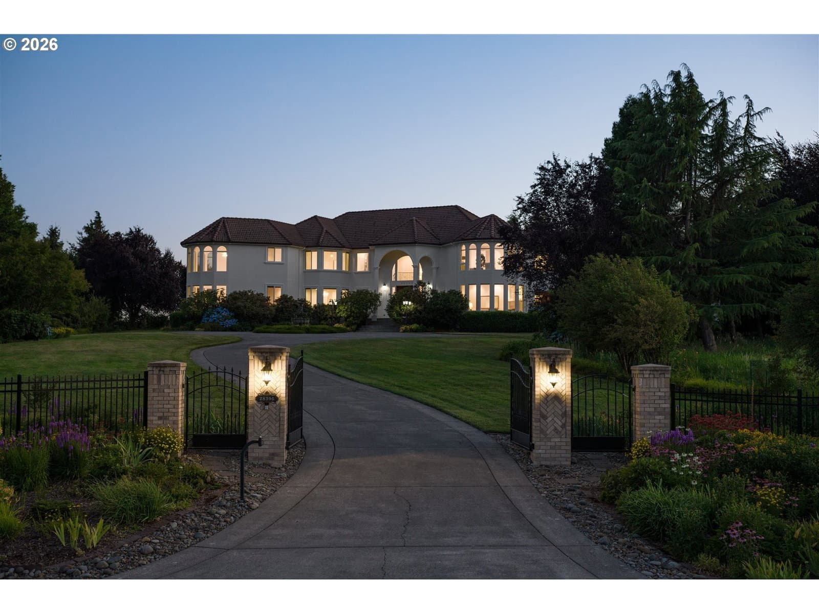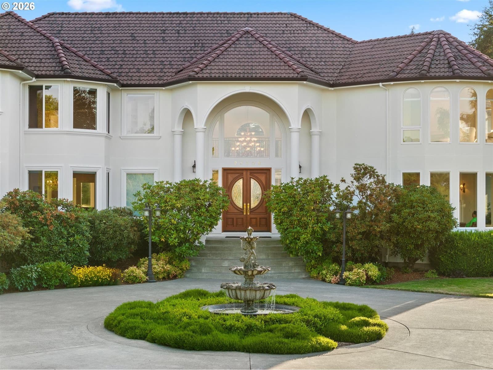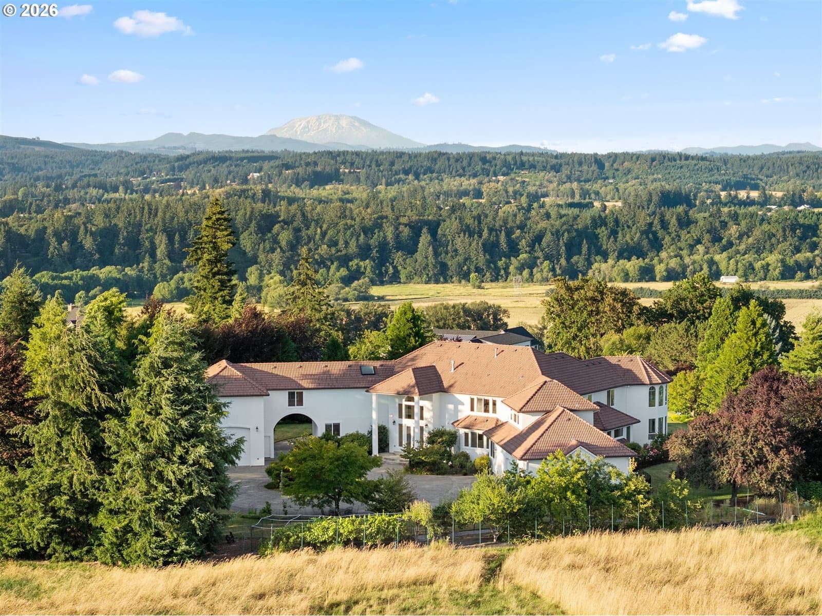 Timeless elegance meets Spanish-inspired charm in this stunning Ridgefield estate perched above the Lewis River. Set on 15 acres of level grounds, the home showcases classic stucco, concrete tile roofing, graceful arches, and expansive picture windows framed to capture sweeping views of Mt. St. Helens, Mt. Adams and Mt. Hood and the river valley from nearly every room. Enter through a dramatic marble foyer and staircase into formal living and dining rooms and a private office, all detailed with intricate moldings and custom mantles. The living room centers on a grand fireplace with a postcard view of Mt. St. Helens. The U-shaped kitchen offers abundant counter and cabinet space, blending functionality with timeless design.Generous bedrooms provide peaceful retreats; the primary suite is a true sanctuary with a fireplace, walk-in closet, luxurious en-suite bath and jetted tub, and unforgettable vistas of the Lewis River Valley and Mt. St. Helens. Guests will delight in choosing which panoramic view—Helens or Hood—wins their vote.Outdoors, 15 acres invite endless possibilities for gardening, recreation, or simply enjoying serene privacy, while still being minutes from I-5 and Ridgefield’s growing retail amenities. An attached shop adds practical space for hobbies and projects. Elegant, comfortable, and exceptional—this property delivers a luxurious, tranquil lifestyle.