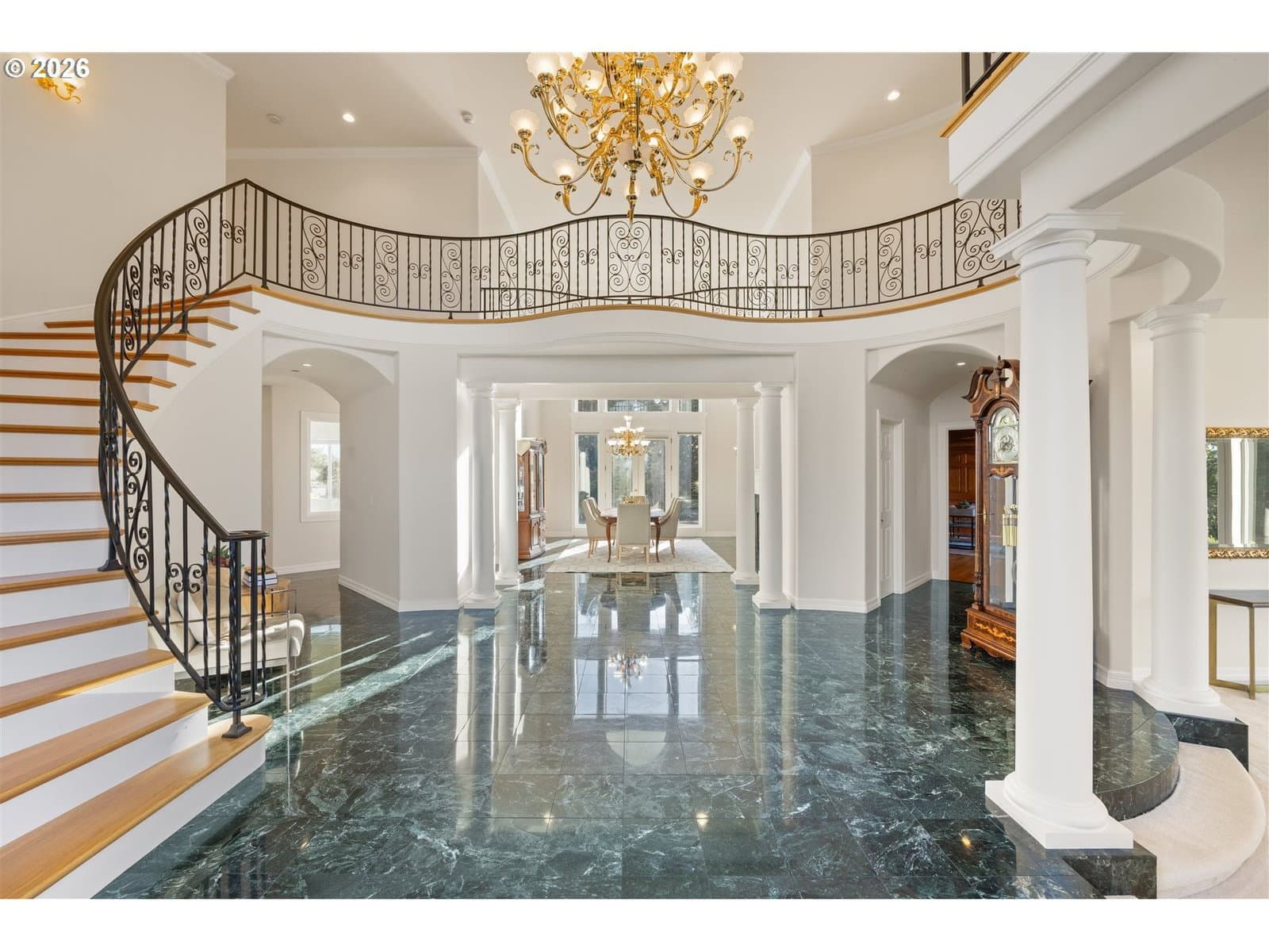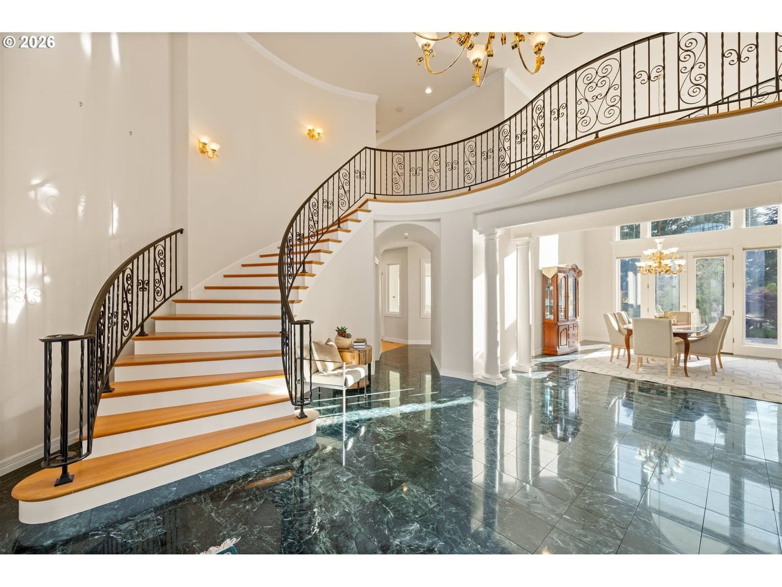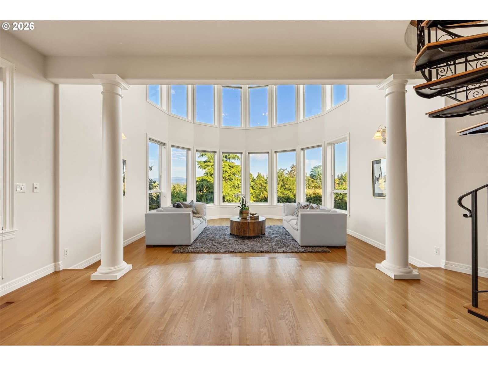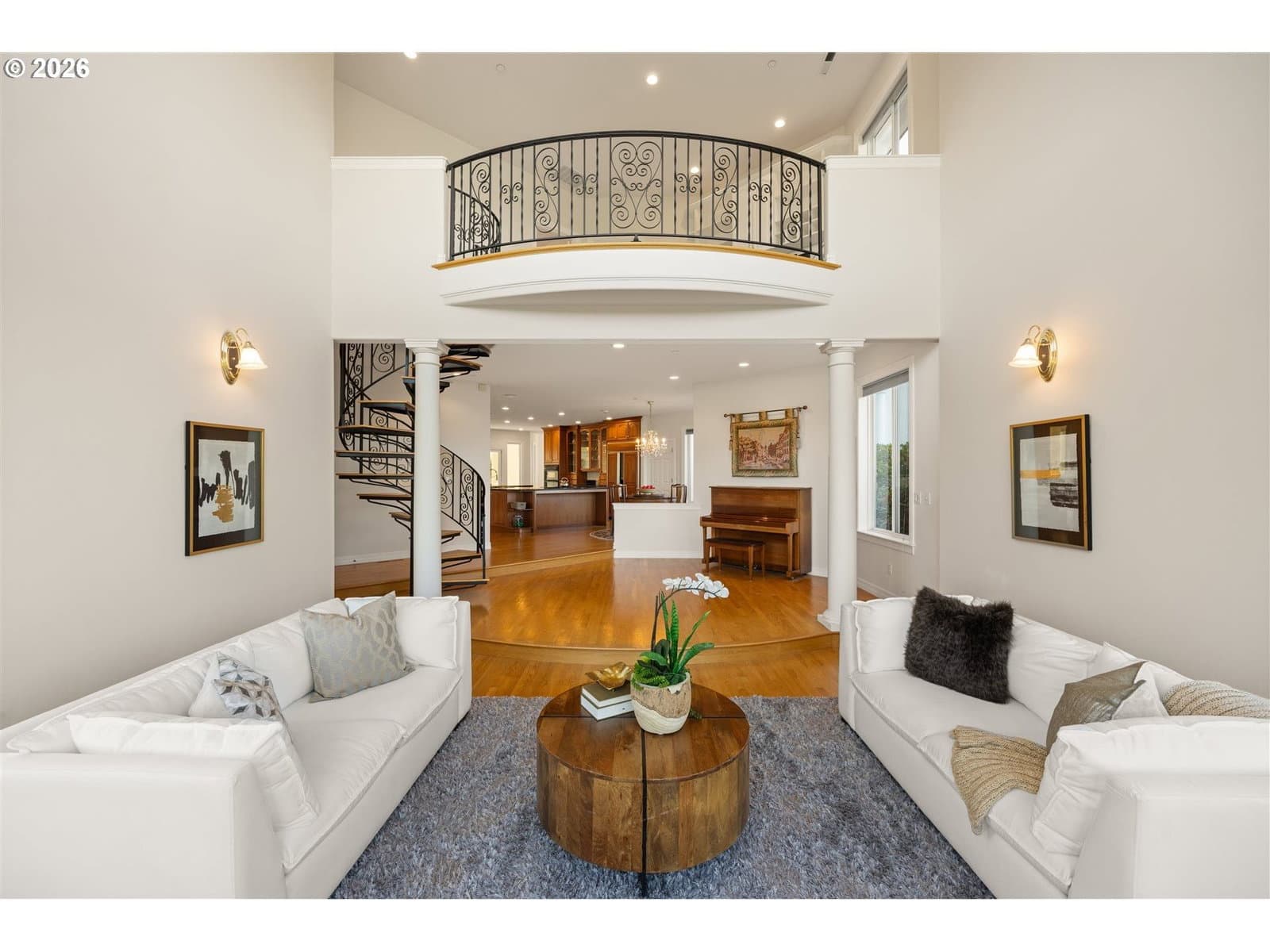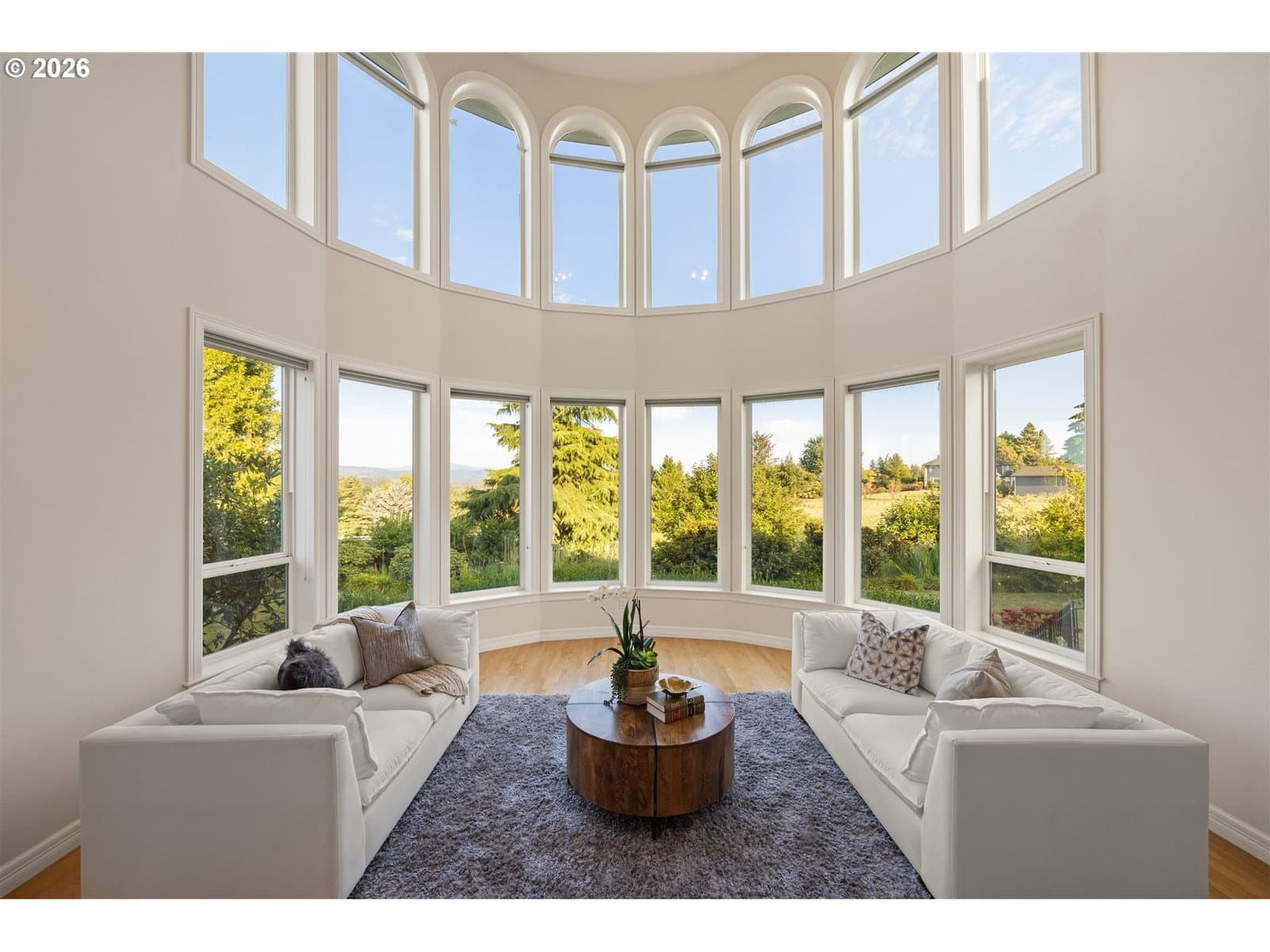 Timeless elegance meets Spanish-inspired charm in this stunning Ridgefield estate perched above the Lewis River. Set on 15 acres of level grounds, the home showcases classic stucco, concrete tile roofing, graceful arches, and expansive picture windows framed to capture sweeping views of Mt. St. Helens, Mt. Adams and Mt. Hood and the river valley from nearly every room. Enter through a dramatic marble foyer and staircase into formal living and dining rooms and a private office, all detailed with intricate moldings and custom mantles. The living room centers on a grand fireplace with a postcard view of Mt. St. Helens. The U-shaped kitchen offers abundant counter and cabinet space, blending functionality with timeless design.Generous bedrooms provide peaceful retreats; the primary suite is a true sanctuary with a fireplace, walk-in closet, luxurious en-suite bath and jetted tub, and unforgettable vistas of the Lewis River Valley and Mt. St. Helens. Guests will delight in choosing which panoramic view—Helens or Hood—wins their vote.Outdoors, 15 acres invite endless possibilities for gardening, recreation, or simply enjoying serene privacy, while still being minutes from I-5 and Ridgefield’s growing retail amenities. An attached shop adds practical space for hobbies and projects. Elegant, comfortable, and exceptional—this property delivers a luxurious, tranquil lifestyle.