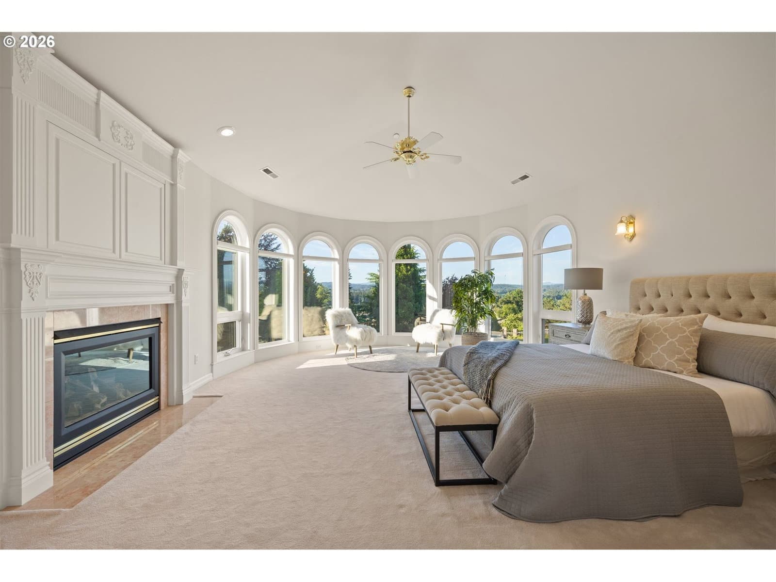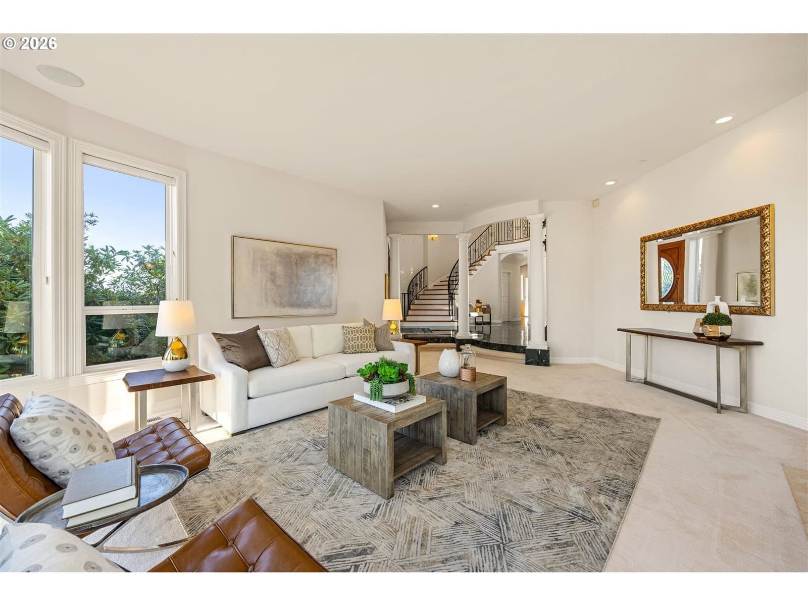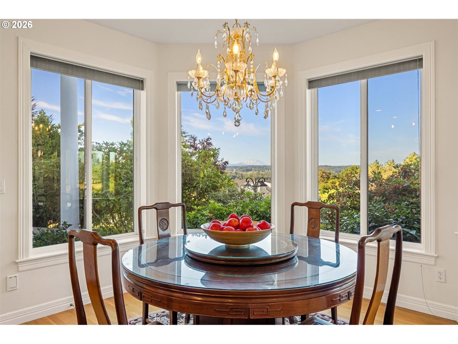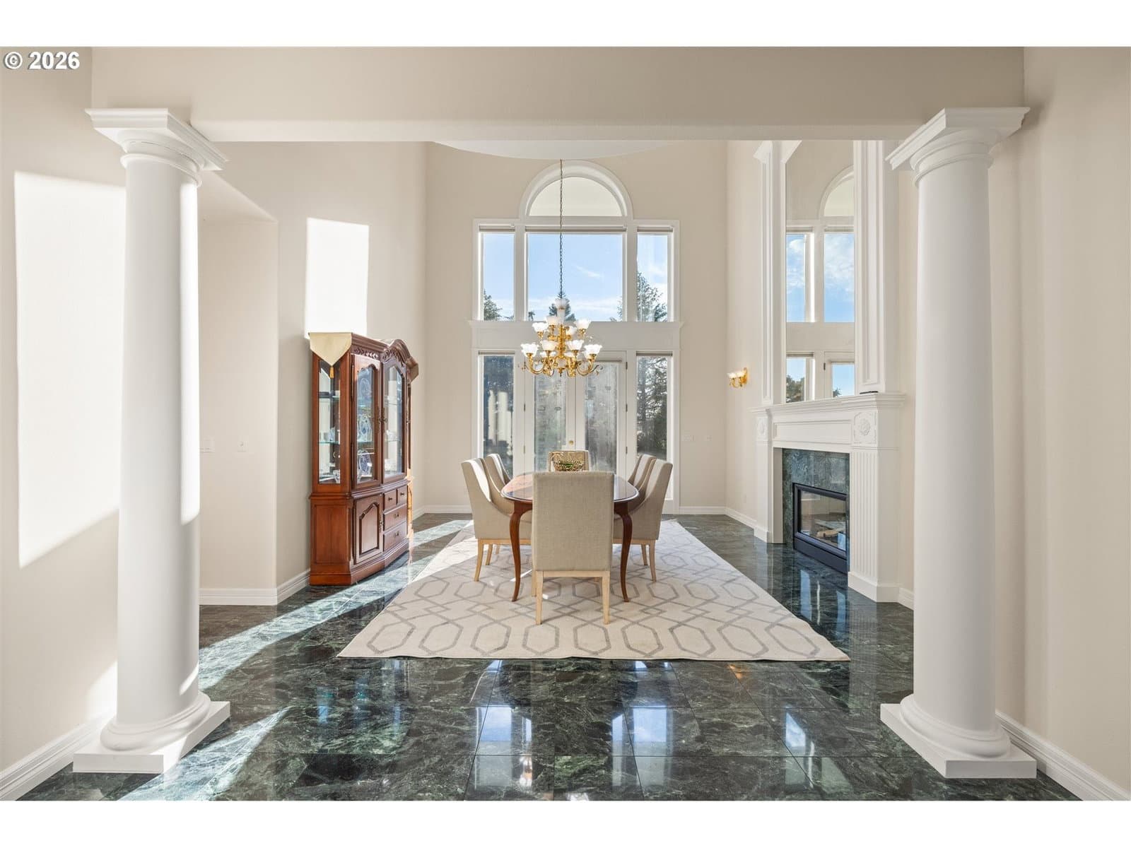Timeless elegance meets Spanish-inspired charm in this stunning Ridgefield estate perched above the Lewis River. Set on 15 acres of level grounds, the home showcases classic stucco, concrete tile roofing, graceful arches, and expansive picture windows framed to capture sweeping views of Mt. St. Helens, Mt. Adams and Mt. Hood and the river valley from nearly every room. Enter through a dramatic marble foyer and staircase into formal living and dining rooms and a private office, all detailed with intricate moldings and custom mantles. The living room centers on a grand fireplace with a postcard view of Mt. St. Helens. The U-shaped kitchen offers abundant counter and cabinet space, blending functionality with timeless design.Generous bedrooms provide peaceful retreats; the primary suite is a true sanctuary with a fireplace, walk-in closet, luxurious en-suite bath and jetted tub, and unforgettable vistas of the Lewis River Valley and Mt. St. Helens. Guests will delight in choosing which panoramic view—Helens or Hood—wins their vote.Outdoors, 15 acres invite endless possibilities for gardening, recreation, or simply enjoying serene privacy, while still being minutes from I-5 and Ridgefield’s growing retail amenities. An attached shop adds practical space for hobbies and projects. Elegant, comfortable, and exceptional—this property delivers a luxurious, tranquil lifestyle.