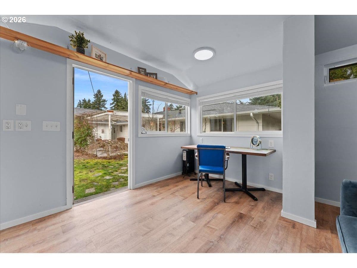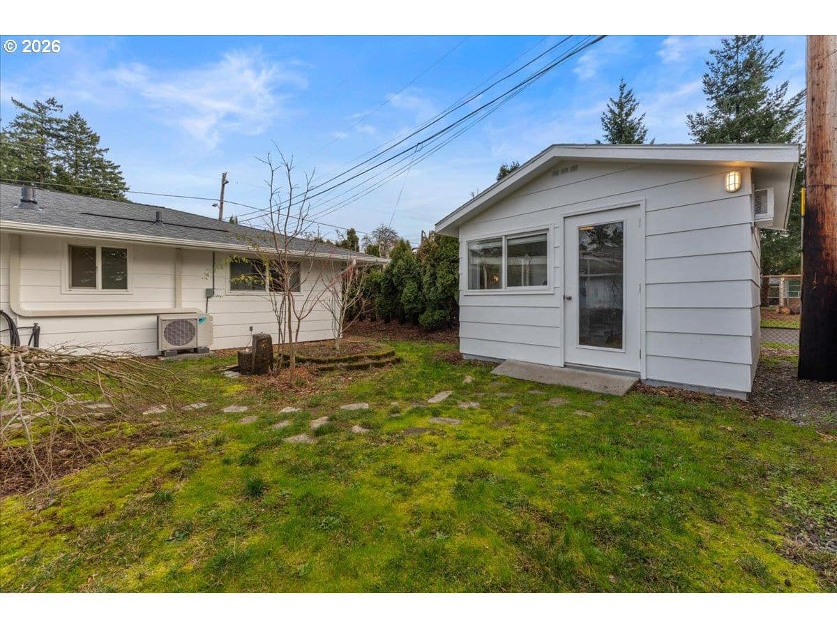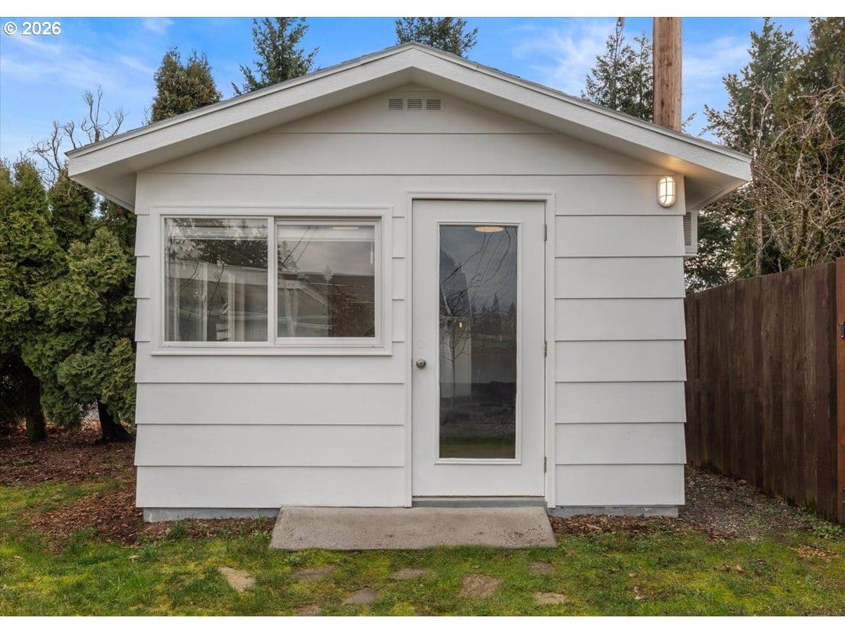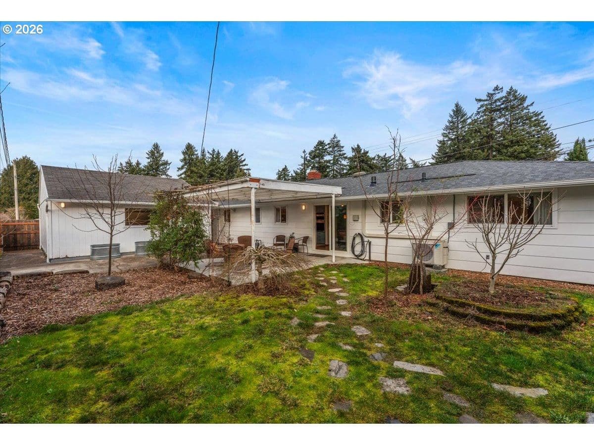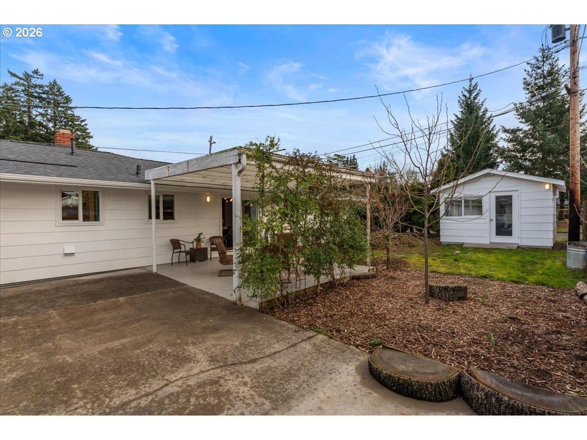 The ideal home for a car enthusiast, maker, or anyone needing serious workspace — paired with the comfort of a bright mid-century modern retreat. Inside, you’ll find hardwood floors, a brick fireplace, remodeled kitchen and bathrooms, a new roof and gutters, and comfortable room sizes throughout. The property offers two garages: a traditional attached two-car garage with built-ins, plus a standout oversized detached garage built for real projects. This impressive shop space includes hard-piped compressed air lines, 240V power, and its own separately metered commercial electrical service — perfect for restoration work, hobby builds, or a home-based workspace.The backyard feels like a private oasis, with a covered patio, extra seating space, and a newly renovated home office with large windows overlooking a fountain where birds love to gather. Raised garden beds and established fruiting plants add color, life, and seasonal beauty.RV parking provides additional flexibility. Conveniently located by David Douglas High School and just a short few minutes to nearby parks. [Home Energy Score = 8. HES Report at https://rpt.greenbuildingregistry.com/hes/OR10244135] The beautiful detached garage offers hard-piped comressed air lines, 240V power, and it's own separately metered commercial electrical service.