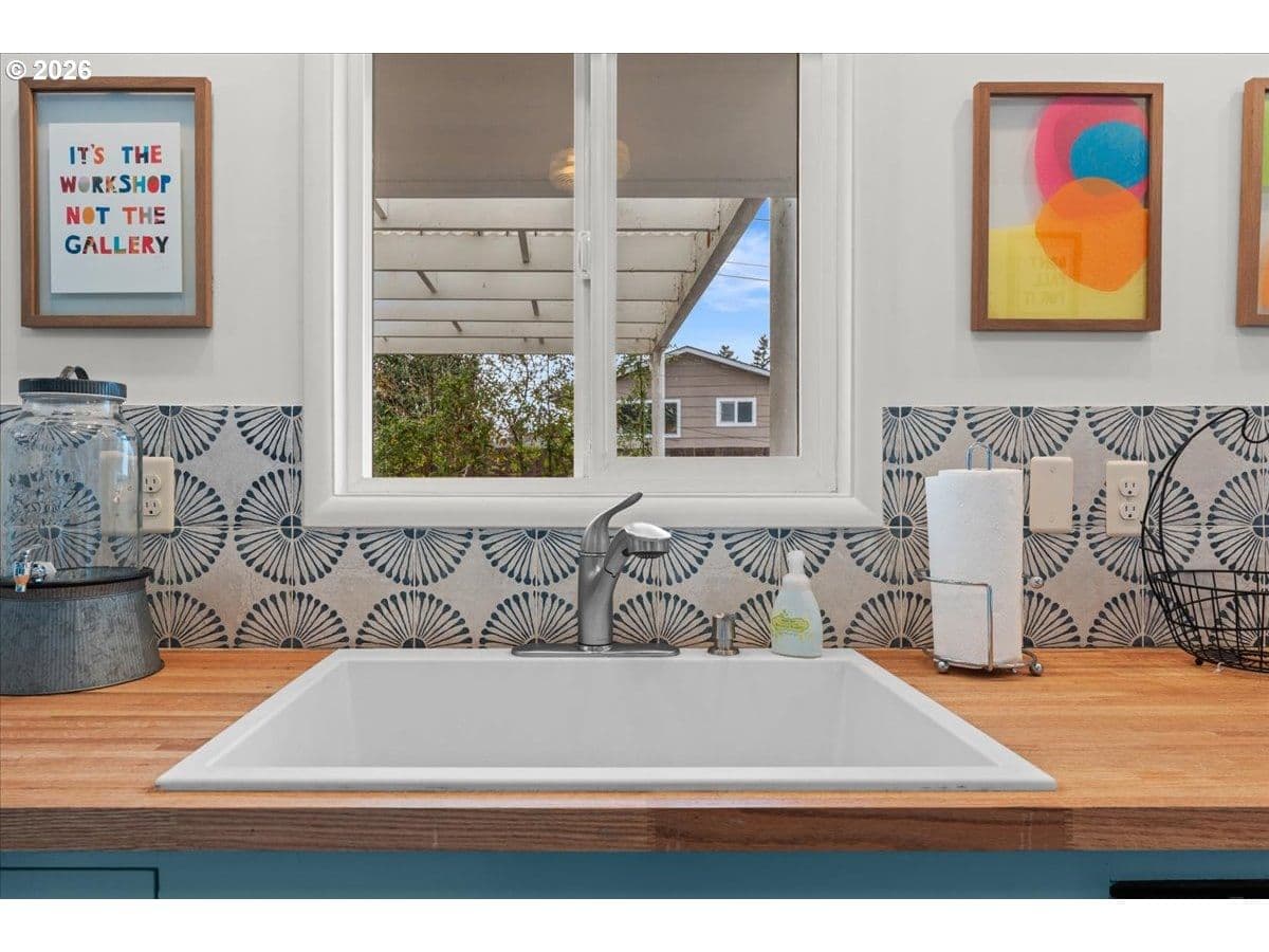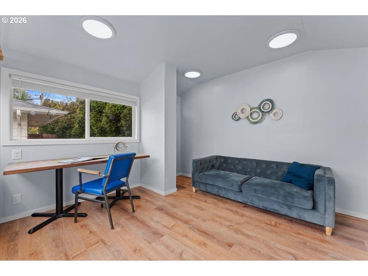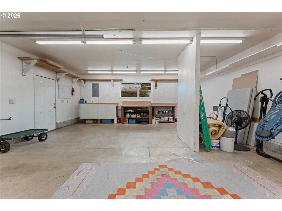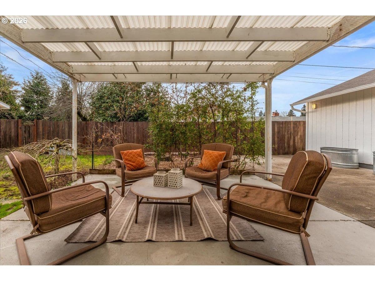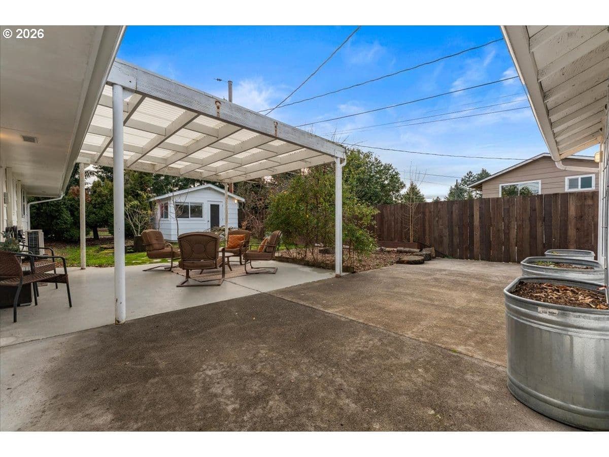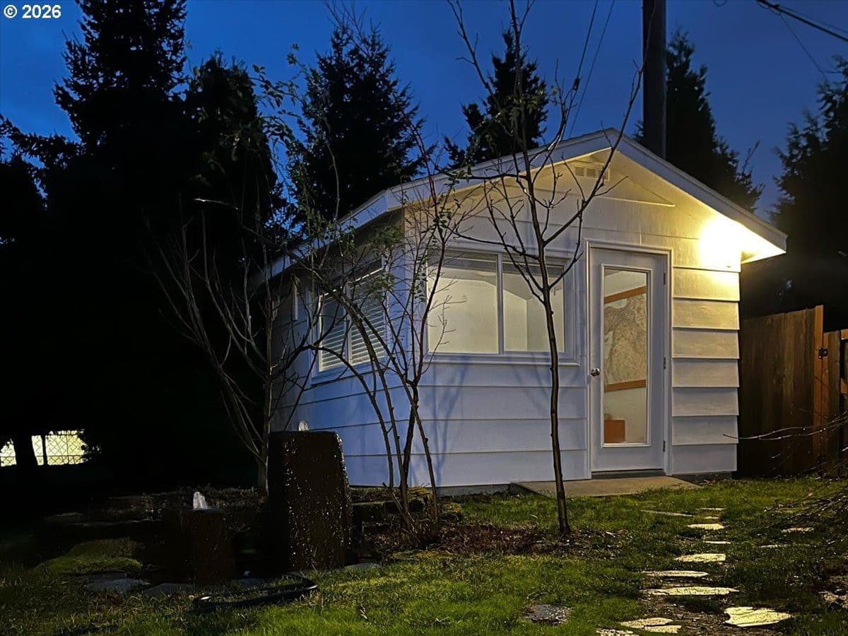 The ideal home for a car enthusiast, maker, or anyone needing serious workspace — paired with the comfort of a bright mid-century modern retreat. Inside, you’ll find hardwood floors, a brick fireplace, remodeled kitchen and bathrooms, a new roof and gutters, and comfortable room sizes throughout. The property offers two garages: a traditional attached two-car garage with built-ins, plus a standout oversized detached garage built for real projects. This impressive shop space includes hard-piped compressed air lines, 240V power, and its own separately metered commercial electrical service — perfect for restoration work, hobby builds, or a home-based workspace.The backyard feels like a private oasis, with a covered patio, extra seating space, and a newly renovated home office with large windows overlooking a fountain where birds love to gather. Raised garden beds and established fruiting plants add color, life, and seasonal beauty.RV parking provides additional flexibility. Conveniently located by David Douglas High School and just a short few minutes to nearby parks. [Home Energy Score = 8. HES Report at https://rpt.greenbuildingregistry.com/hes/OR10244135] The beautiful detached garage offers hard-piped comressed air lines, 240V power, and it's own separately metered commercial electrical service.
