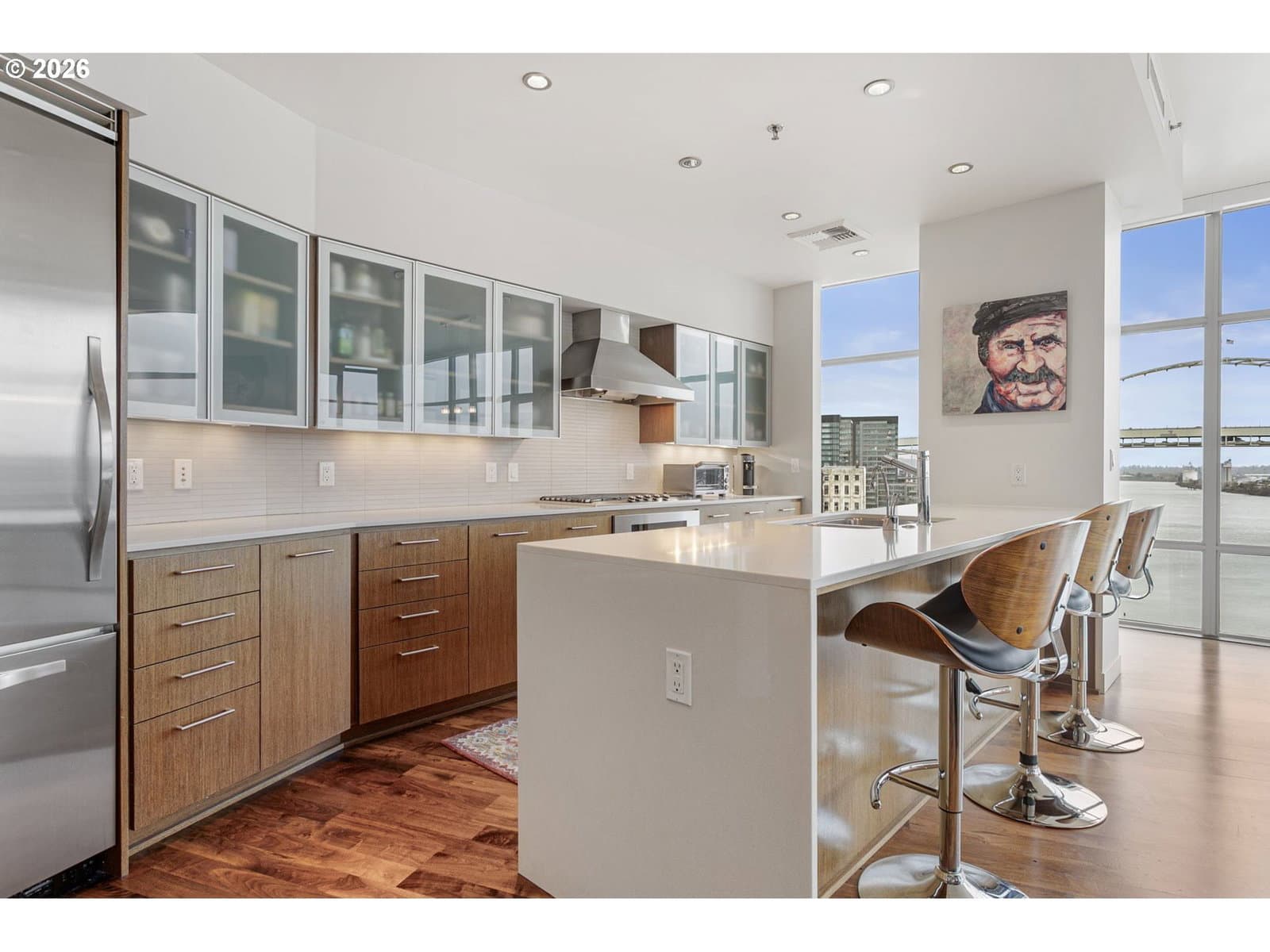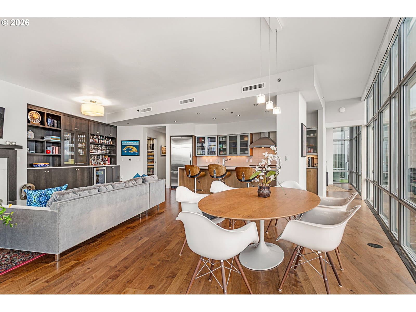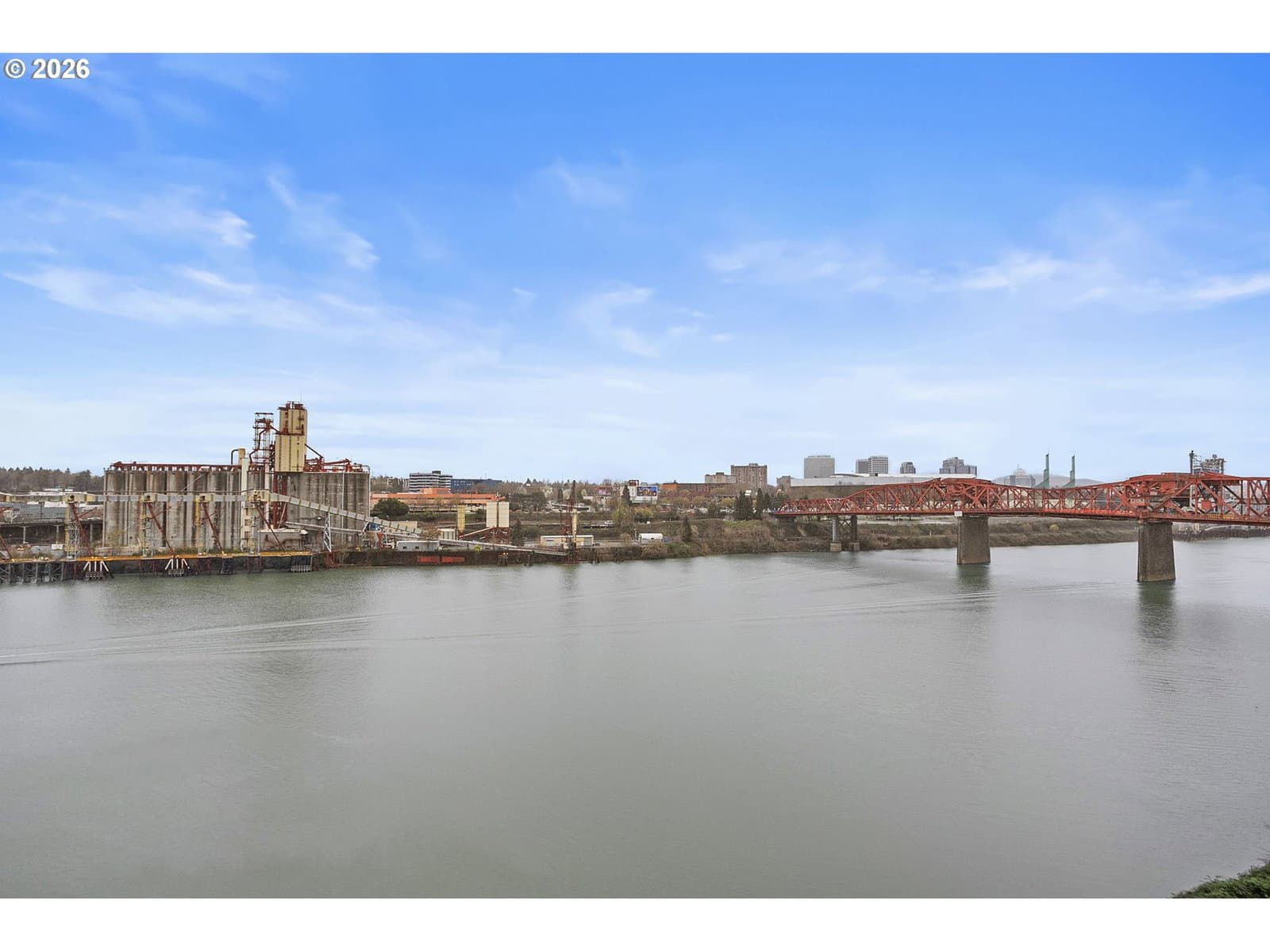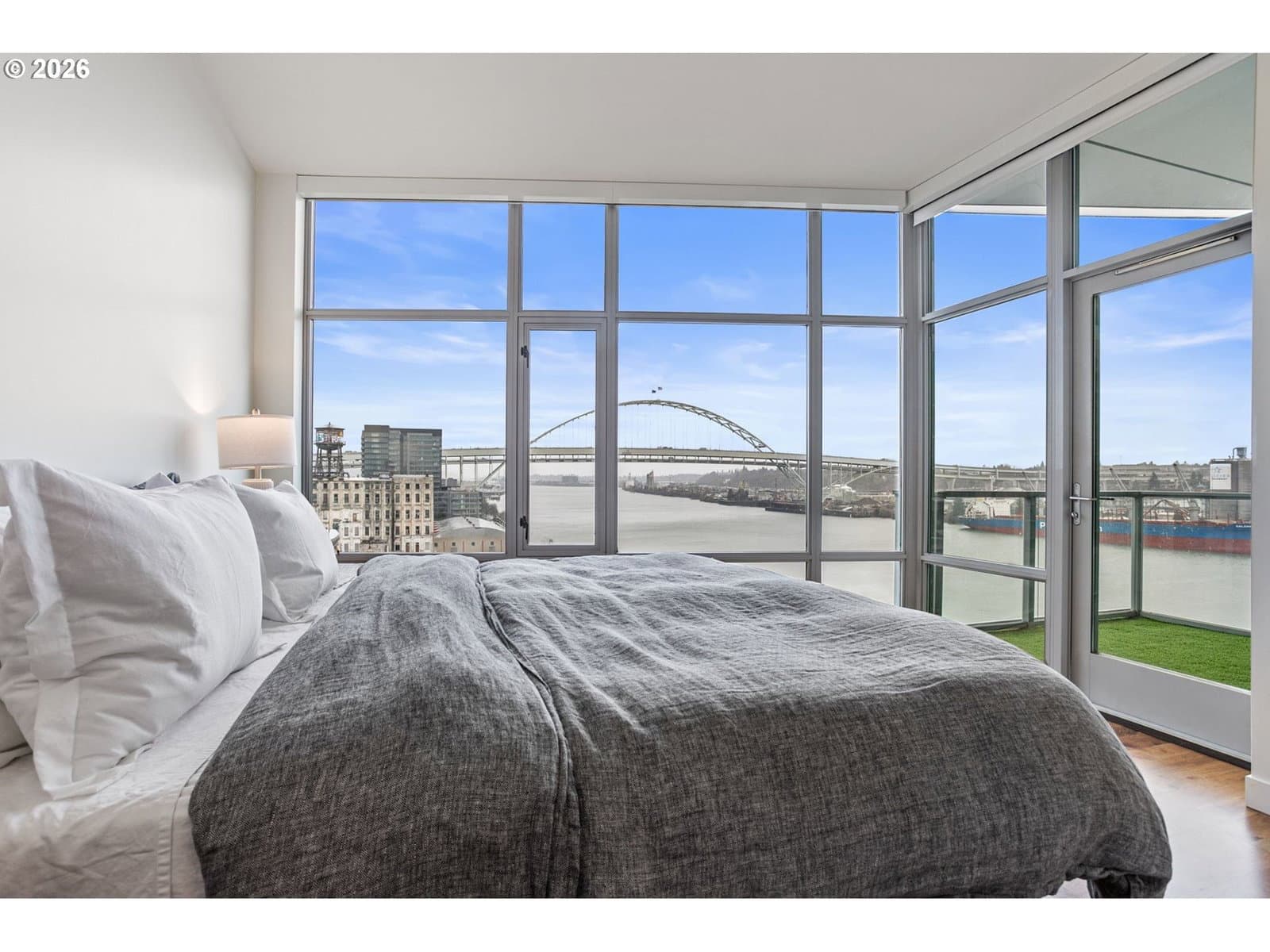 Welcome to an exquisite top-floor penthouse at Waterfront Pearl, offering an unparalleled waterfront living experience. This 1,927-square-foot residence features two bedrooms, two and a half bathrooms, + a versatile den. Enjoy unobstructed north-facing views of the river and city from every room! The spacious living area boasts extra high ceilings and a cozy fireplace, complemented by two private patios perfect for relaxation. The modern kitchen is equipped with premium Viking appliances and a convenient bar area. Custom closets provide ample storage, while power blinds add a touch of luxury. This property includes two parking spaces with EV charging capabilities and additional private storage unit. Building amenities include 24/7 security, a fully equipped gym and sauna. Experience the perfect blend of privacy and connectivity in this prime location, with easy access to the best of Portland!