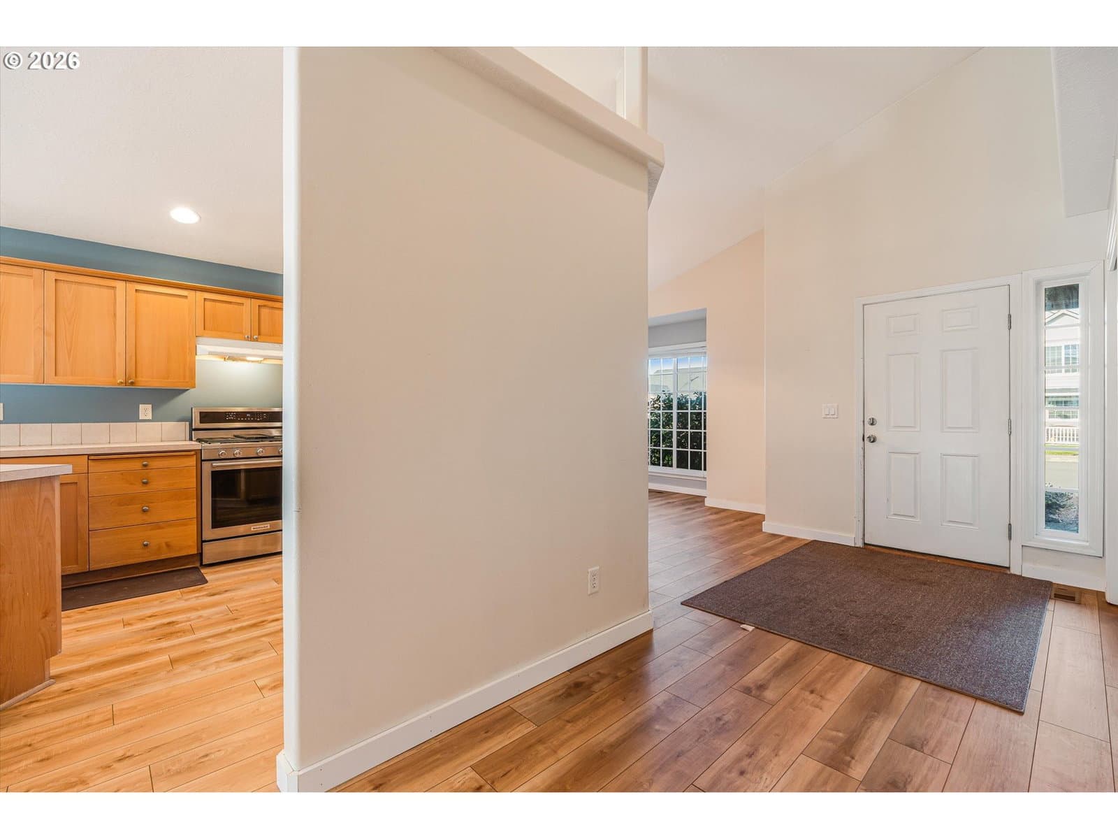 Dynamite one-level home, move-in ready. Newer luxury vinyl plank flooring throughout with newer carpet in the bedrooms. Newer AC.Refrigerator included; TV and mounts stay. Easy-care yard for low-maintenance living. Vaulted ceilings enhance multiple living spaces, creating an open, airy feel. The kitchen opens to the family room and features stainless steel KitchenAid appliances, gas range, eating bar, and pantry. Vaulted primary suite includes a walk-in closet and private full bath. Sliding doors from the family room lead to a spacious concrete patio, ideal for outdoor enjoyment. Additional features include forced-air gas heat, gas water heater, fiber-cement siding, and an attached two-car garage.