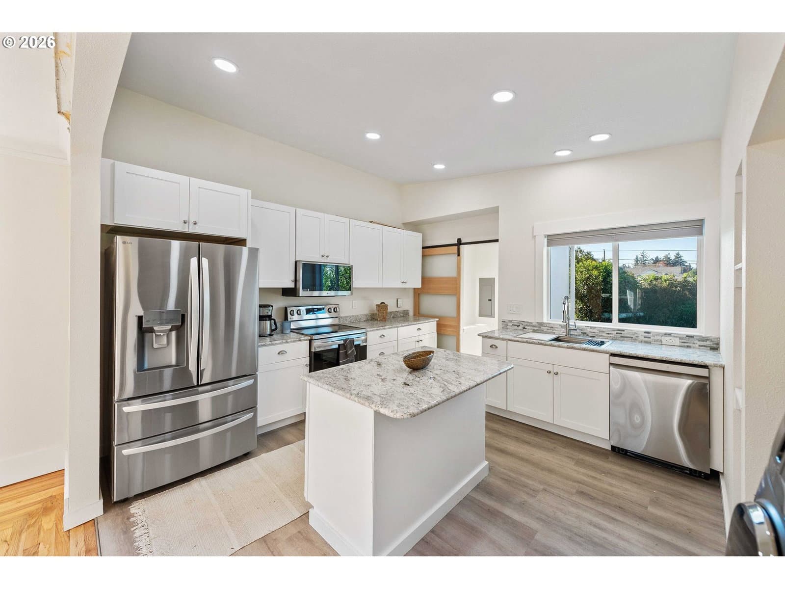 Charming 2-bedroom 1 bath home has been renovated and brought back to life. Classic hardwood floors throughout, new kitchen with granite countertops, cabinets, sink, flooring, lighting and appliances. All new windows, NEW ROOF and new sewer line from house to city connection. Heat is kerosene forced air heater as well as wood burning fireplace. Property is nestled in a quiet neighborhood with a lovely greenbelt and partial view of the bay. Full RV hookup is on the side of the home. Plenty of parking in the back of the lot, as well as alley access.