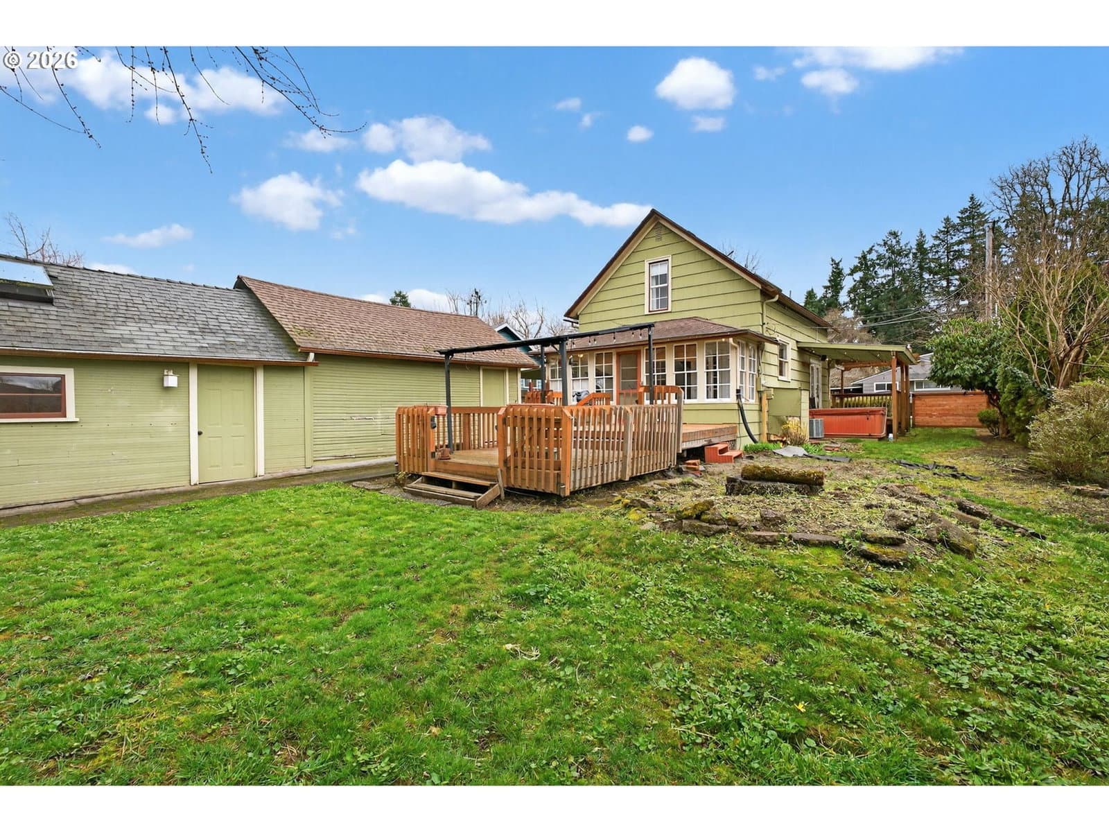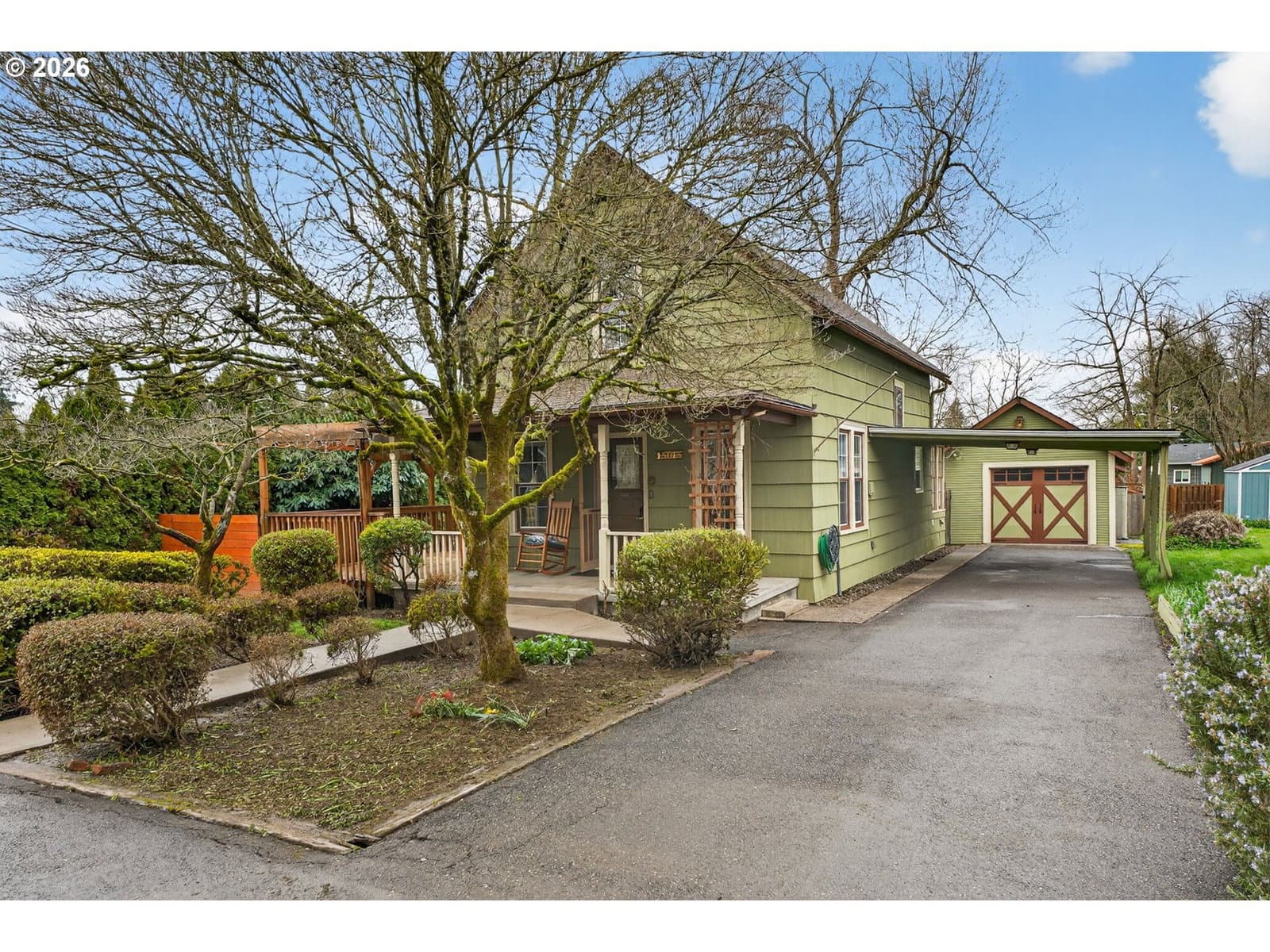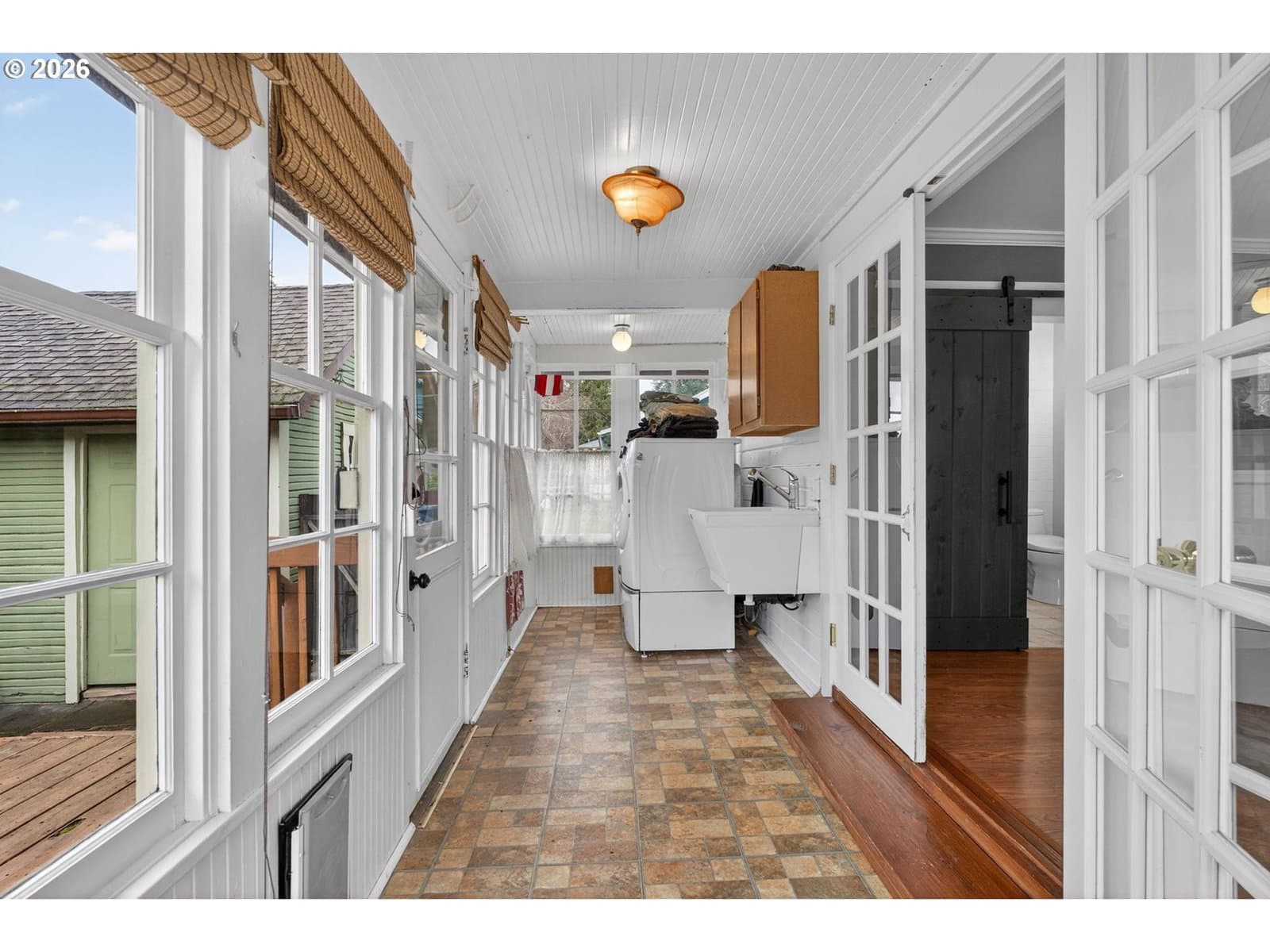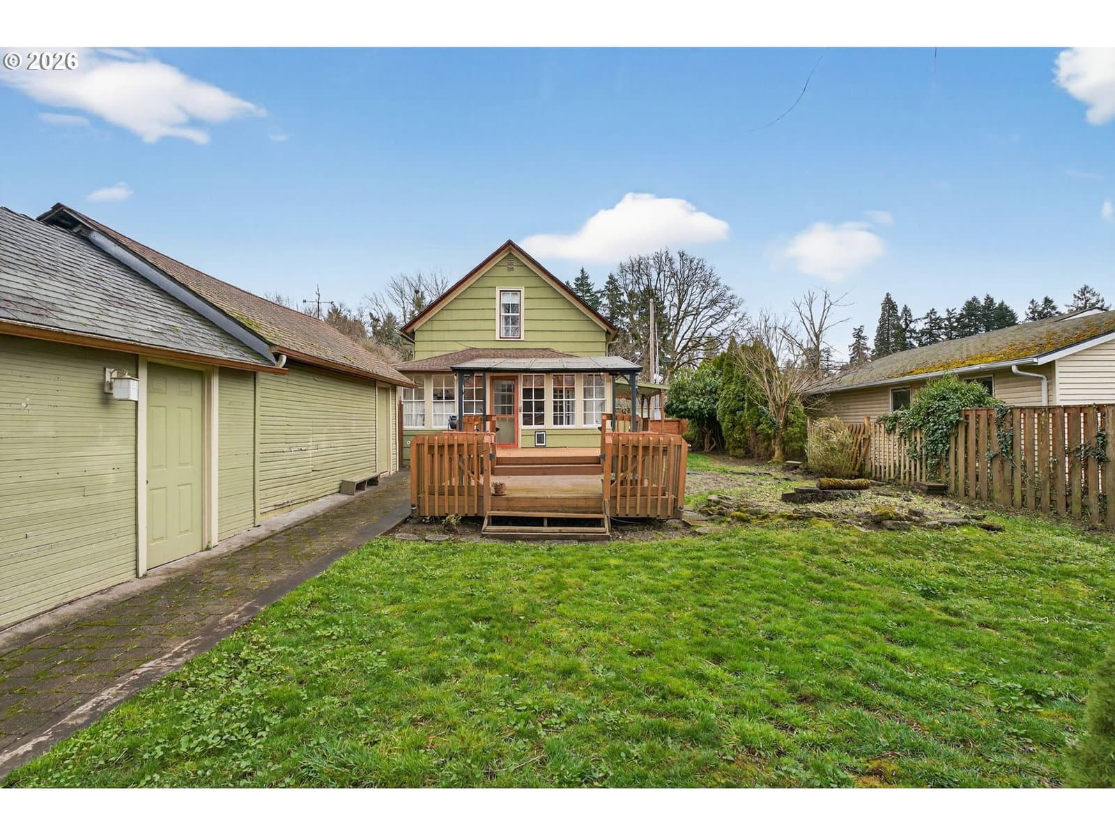 Sweet vintage vibe farmhouse with an incredible backyard retreat! This Milwaukie jewel box blends an open, light-filled floor plan with timeless charm and thoughtful modern updates. The generous living room offers abundant windows, great flexibility, and views of the inviting wraparound sitting porch. The open eat-in kitchen is ideal for everyday living or entertaining, featuring newer wood cabinets, an eating island, and full appliance package. Guests will love the remodeled main-floor bath showcasing a modern soaking tub, quartz vanity, fresh wainscoting, and a stylish barn door. The converted sunporch creates a delightful laundry space with a sink, built-ins, and three walls of paned windows. Enjoy effortless indoor/outdoor living with direct kitchen access to the backyard—perfect for BBQs and alfresco dining! Upstairs, two ample bedrooms feature cozy carpet and generous closets. The upper full bath includes a tub/shower combo, tile flooring, and a large skylight for natural illumination. Outside, fall in love with the fully fenced backyard offering covered and uncovered decks, a paver patio, and a large studio attached to the garage—ideal for projects, work, or creative pursuits. Mature trees provide shade, while sunny areas are perfect for gardening. The yard has well established perennial plants and trees with potential for lots more. A spacious shed keeps tools, gear, and toys neatly stored. Central air conditioning. 2 year old electric water heater. Located in a peaceful, friendly neighborhood within walking distance of two beautiful parks and nearby schools. Conveniently close to shopping and freeway access for an easy commute. A deep driveway offers abundant off-street parking for guests!