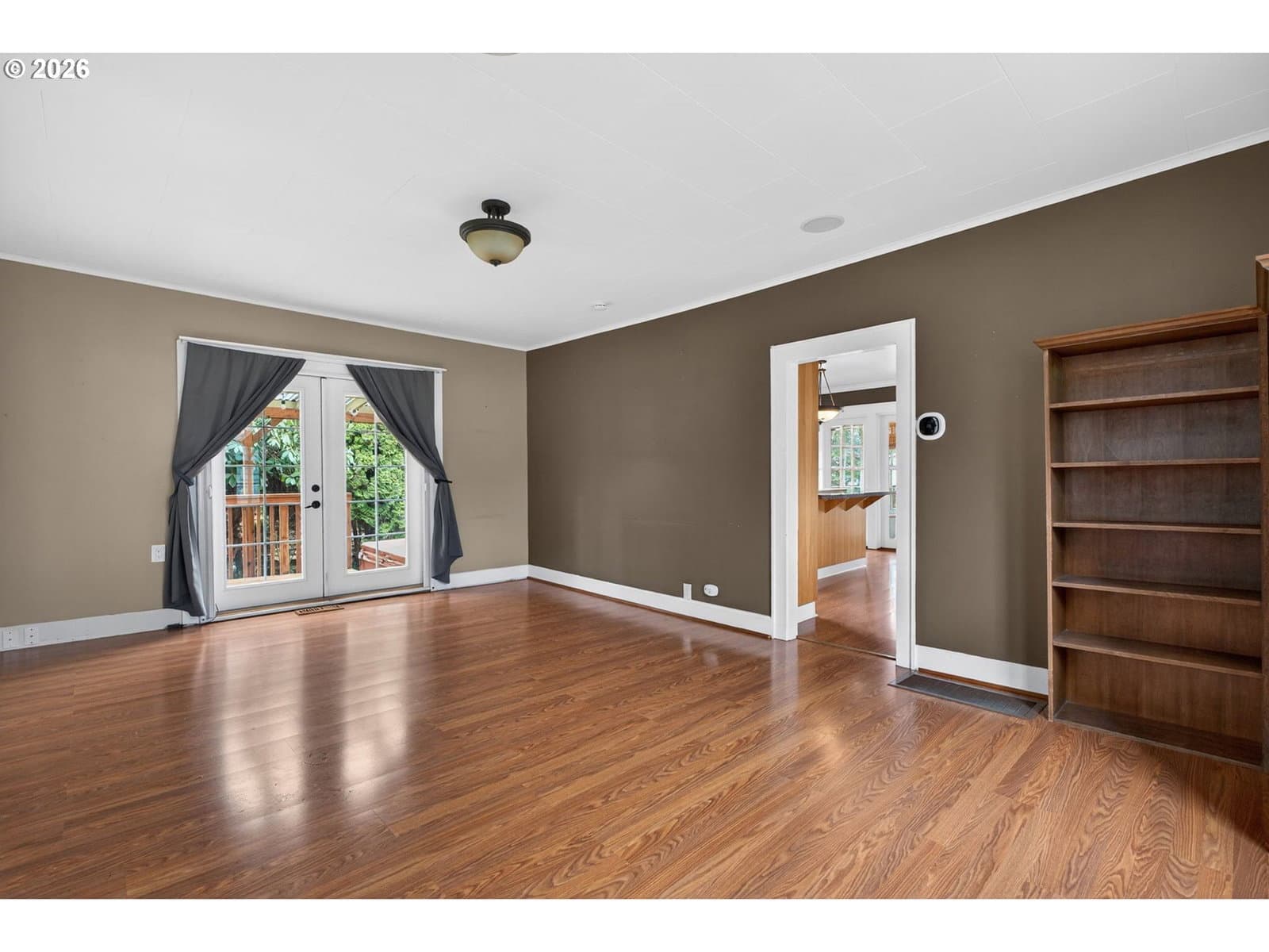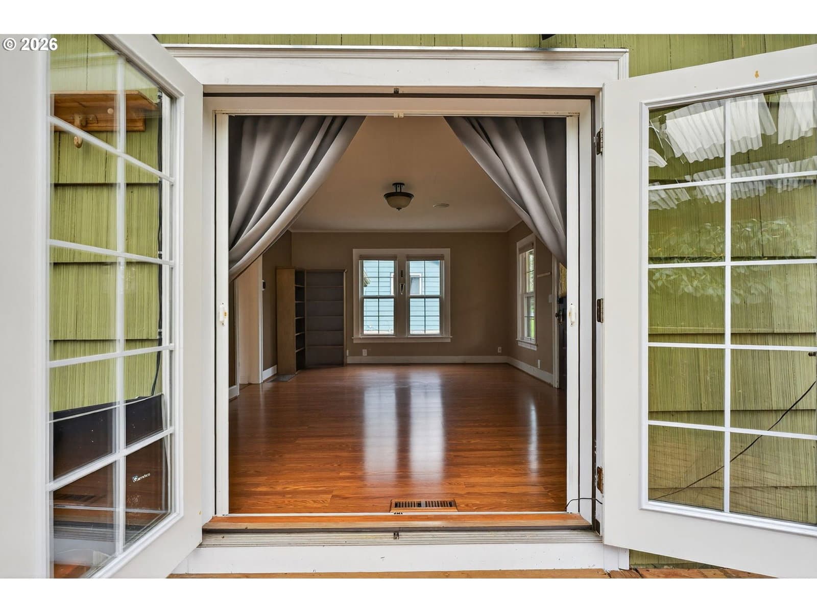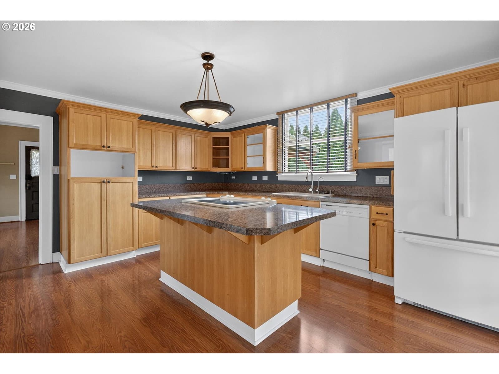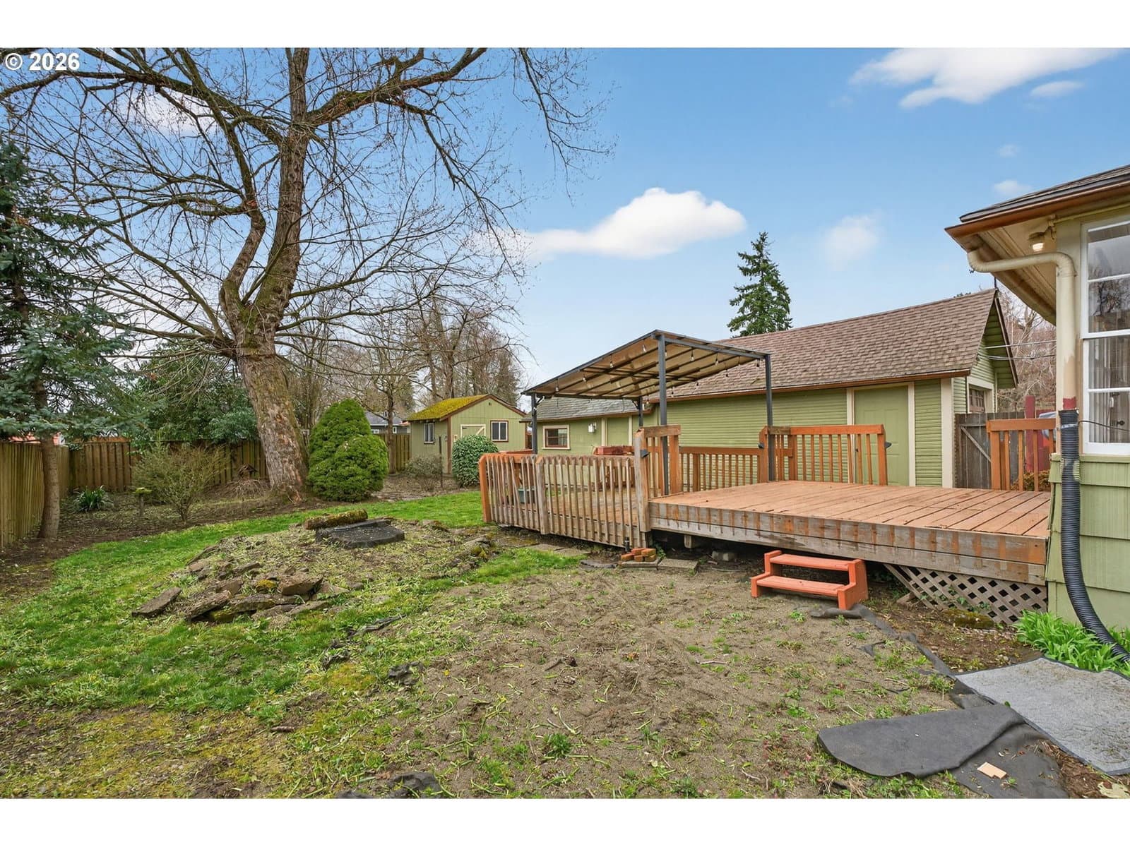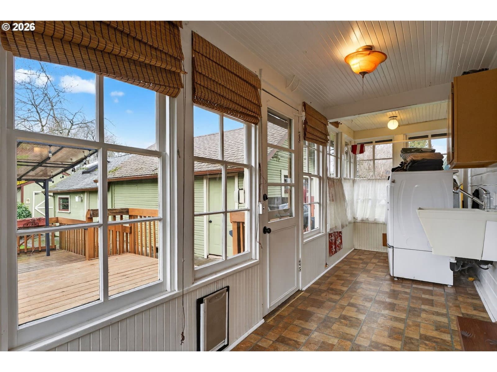Sweet vintage vibe farmhouse with an incredible backyard retreat! This Milwaukie jewel box blends an open, light-filled floor plan with timeless charm and thoughtful modern updates. The generous living room offers abundant windows, great flexibility, and views of the inviting wraparound sitting porch. The open eat-in kitchen is ideal for everyday living or entertaining, featuring newer wood cabinets, an eating island, and full appliance package. Guests will love the remodeled main-floor bath showcasing a modern soaking tub, quartz vanity, fresh wainscoting, and a stylish barn door. The converted sunporch creates a delightful laundry space with a sink, built-ins, and three walls of paned windows. Enjoy effortless indoor/outdoor living with direct kitchen access to the backyard—perfect for BBQs and alfresco dining! Upstairs, two ample bedrooms feature cozy carpet and generous closets. The upper full bath includes a tub/shower combo, tile flooring, and a large skylight for natural illumination. Outside, fall in love with the fully fenced backyard offering covered and uncovered decks, a paver patio, and a large studio attached to the garage—ideal for projects, work, or creative pursuits. Mature trees provide shade, while sunny areas are perfect for gardening. The yard has well established perennial plants and trees with potential for lots more. A spacious shed keeps tools, gear, and toys neatly stored. Central air conditioning. 2 year old electric water heater. Located in a peaceful, friendly neighborhood within walking distance of two beautiful parks and nearby schools. Conveniently close to shopping and freeway access for an easy commute. A deep driveway offers abundant off-street parking for guests!