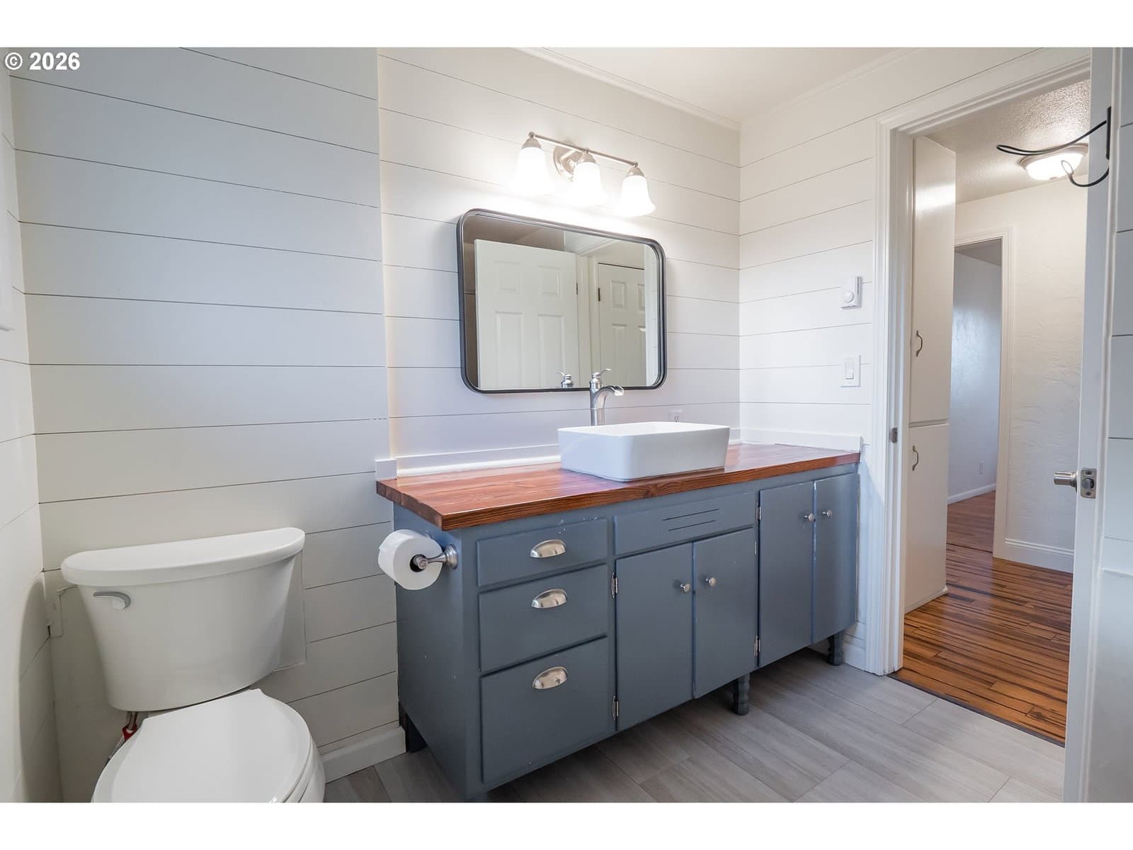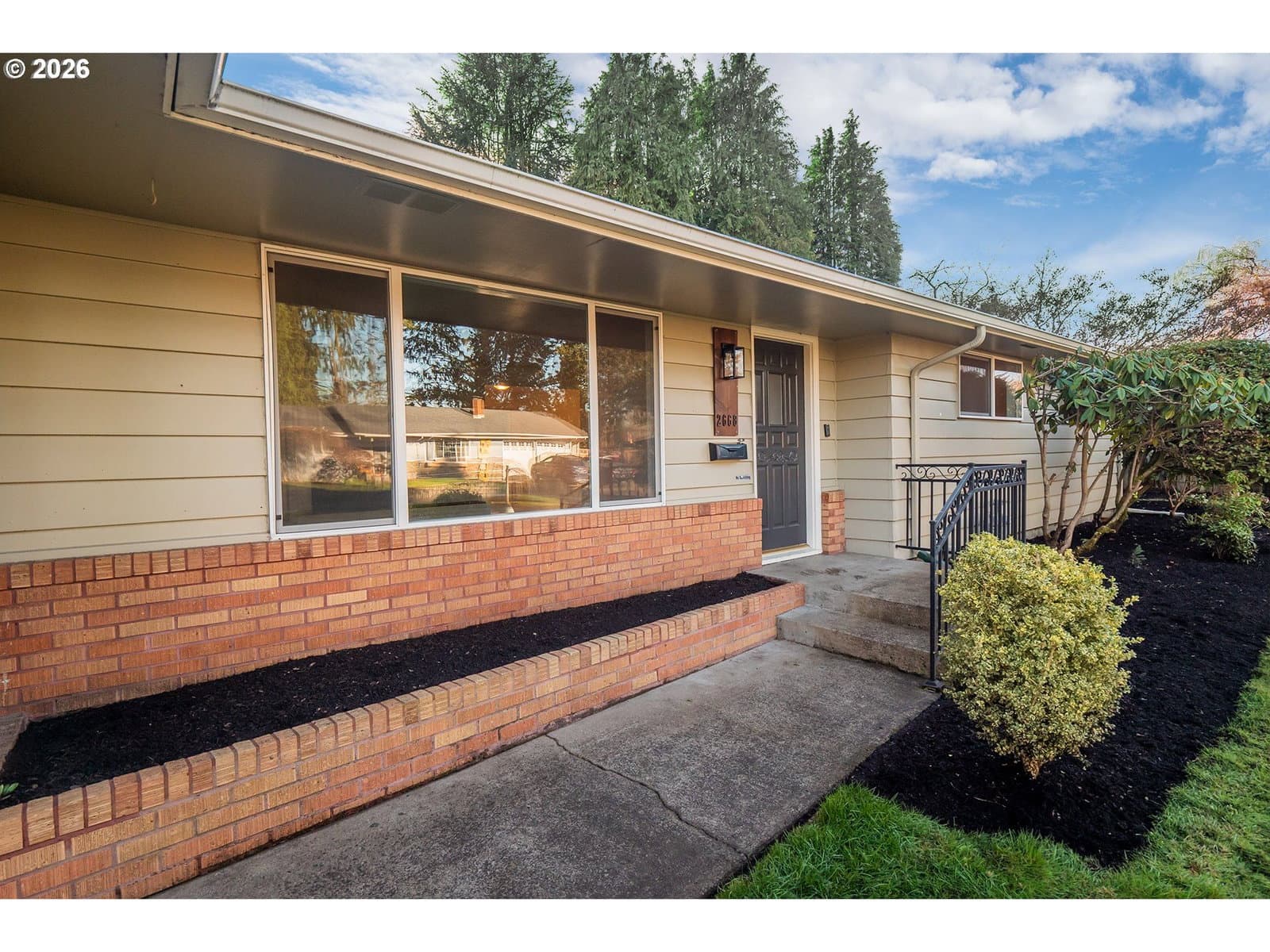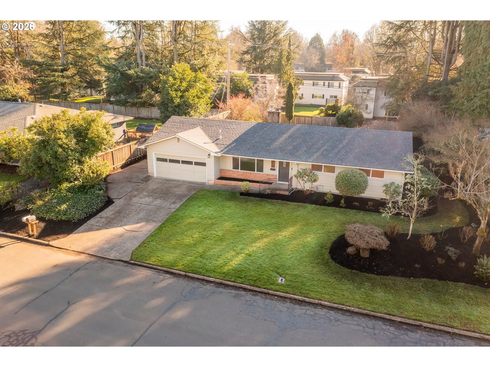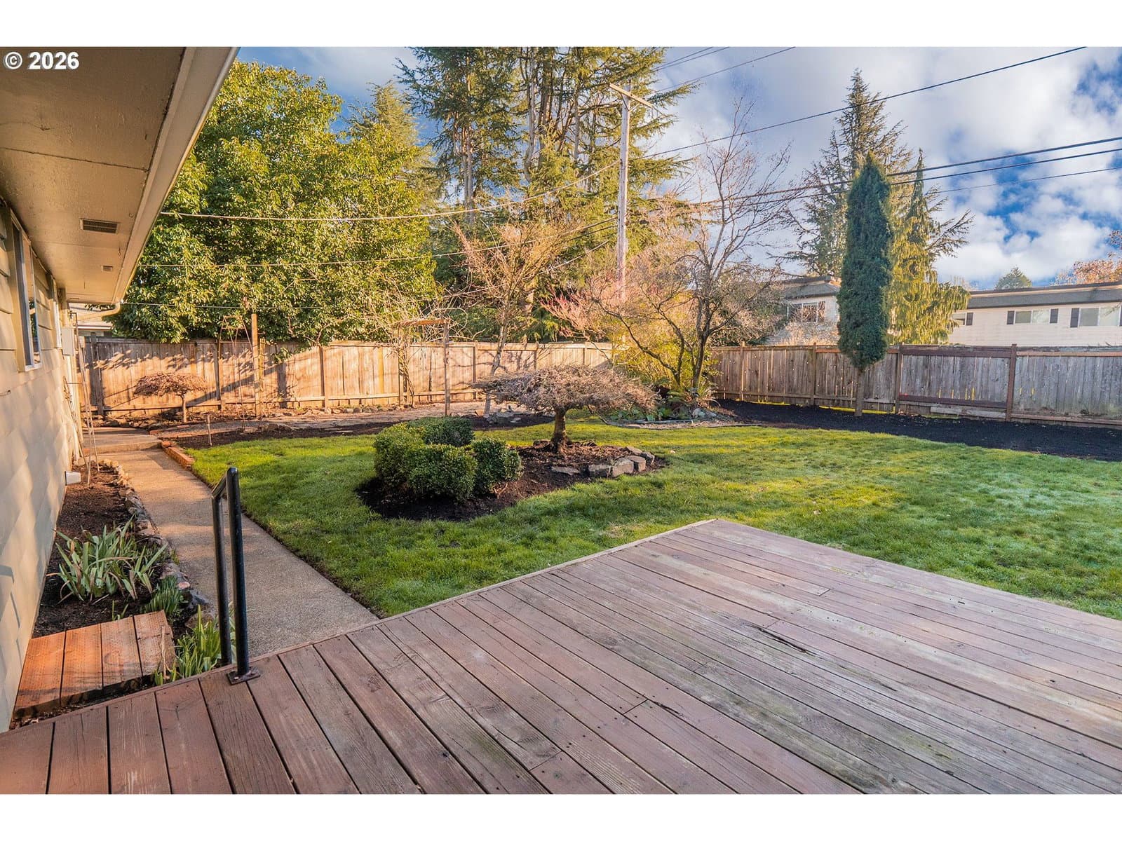 Mid-century ranch charm with thoughtful modern updates throughout! Improvements include newer vinyl windows, updated light fixtures, and new toilets, along with a newer roof for added peace of mind. Fresh interior paint, newer exterior paint, and classic hardwood flooring, this home is comfortable with updated thermostats, both gas and wood-burning fireplaces, enhancing ambiance and function. The classic kitchen features well-maintained original cabinets, built-in range and built-in oven and includes stainless steel appliances. The slider leads to a beautifully landscaped backyard with an expansive deck-perfect for relaxing or entertaining. The bedrooms are warm and inviting with refinished hardwood flooring. Bathrooms are refreshed with laminate vinyl tile flooring and modern wall board accent. An attic loft offers versatile flex space ideal for a home office, playroom or extra storage. Electrical updates include a 200-amp panel installed in 2016, and the garage is pre-wired for an electric car charger. The location of this home is unbeatable. Close to all the favorite stores and restaurants, schools and parks!