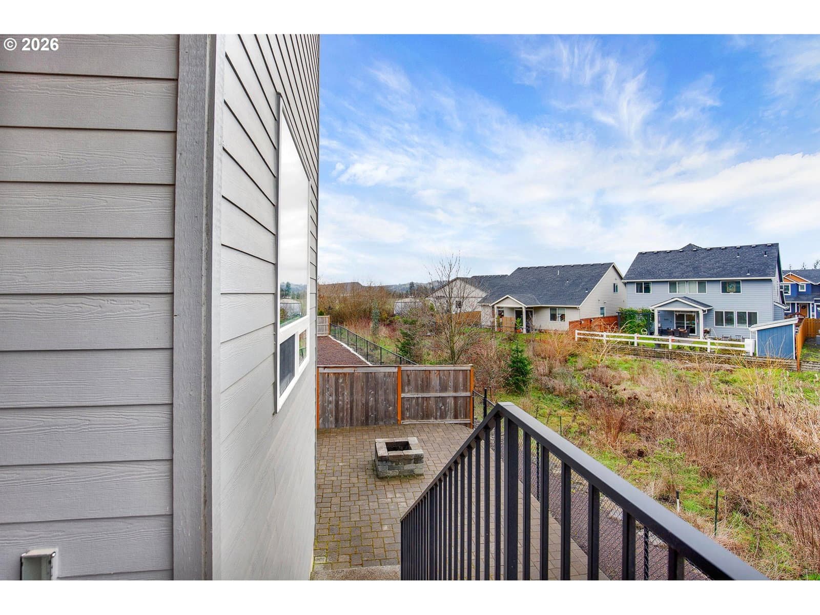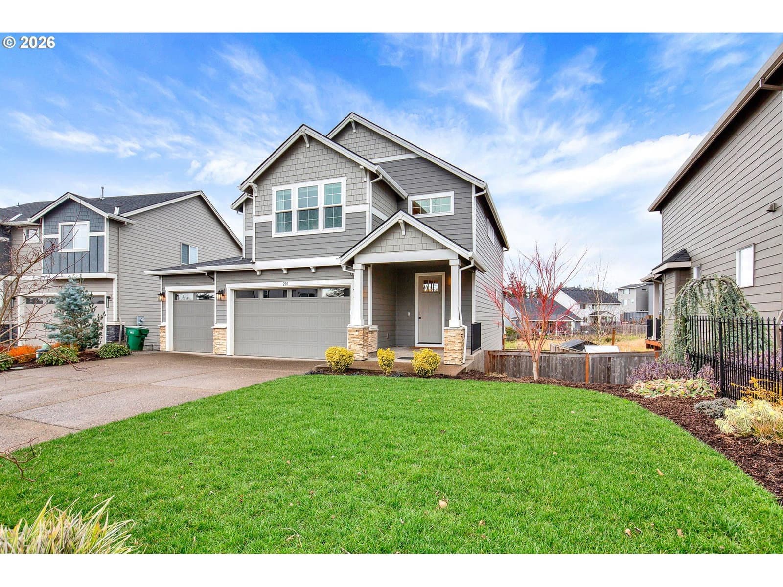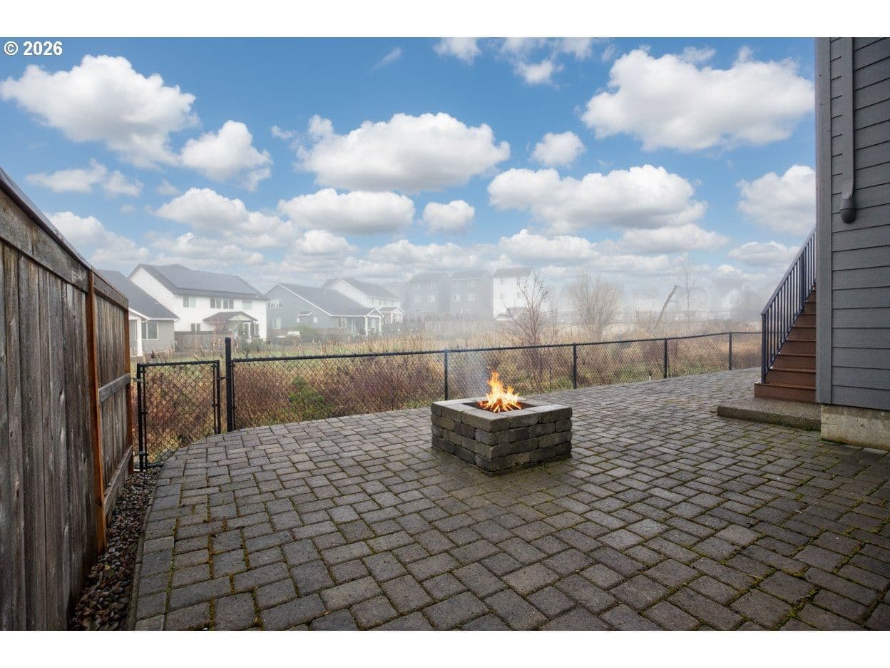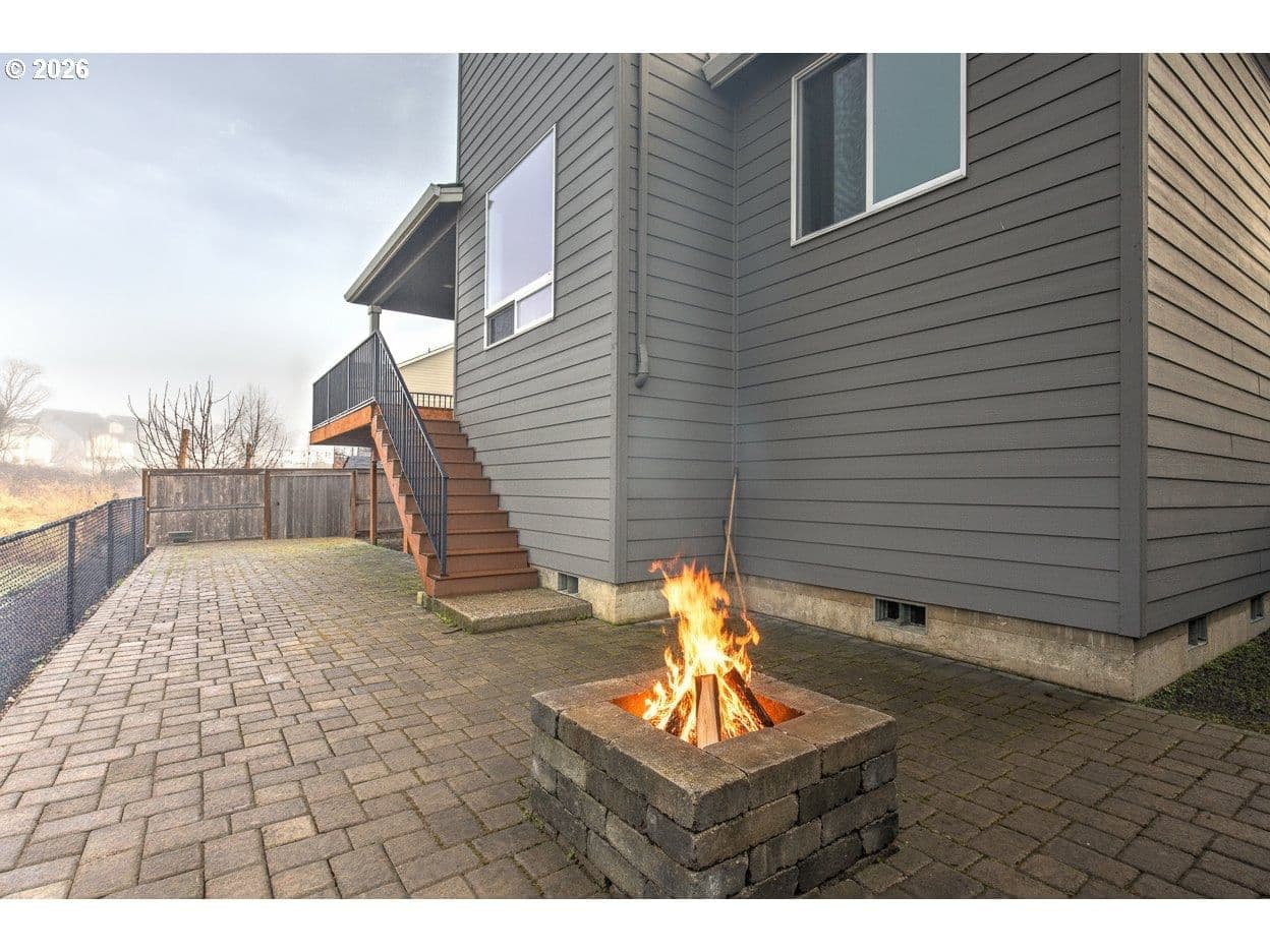 Absolutely Gorgeous! Completed in 2022, this beautifully designed 5-bedroom, 3-bath home offers modern comfort, thoughtful upgrades, and an exceptional cul-de-sac location. Ideally placed on a premium lot, this is the premier spot on the street, with a trail access point just a few steps from the front door—ideal for daily walks and easy access to the nearby softball field and popular looped walking trail. The main level features a light-filled great room layout centered around a chef-inspired kitchen with gas cooking, quartz countertops, a large island, and an inviting dining area. A bedroom and full bath on the main floor provide flexibility for guests, multi-generational living, or a home office. The striking open staircase leads to the upper level, where four additional bedrooms await, including a spacious primary suite with a walk-in closet and a luxurious private bath. Each upstairs bedroom has a walk-in closet. The backyard has been thoughtfully upgraded into a fully paved, level outdoor living space, creating a low-maintenance retreat with no lawn to mow. Fully fenced for pets, the yard opens to peaceful wetland views where the sounds of red-winged blackbirds add a serene, natural backdrop. Custom pavers, a built-in fire pit, and a large deck make this space perfect for both relaxing and entertaining. Exceptionally well maintained and truly move-in ready, this gorgeous home combines privacy, natural beauty, and modern living in one of Newberg’s most desirable settings. You will love it! URL & phone to be provided