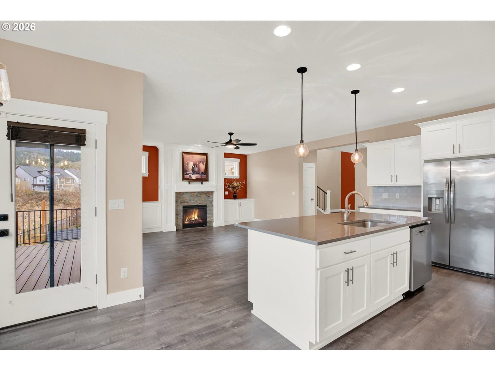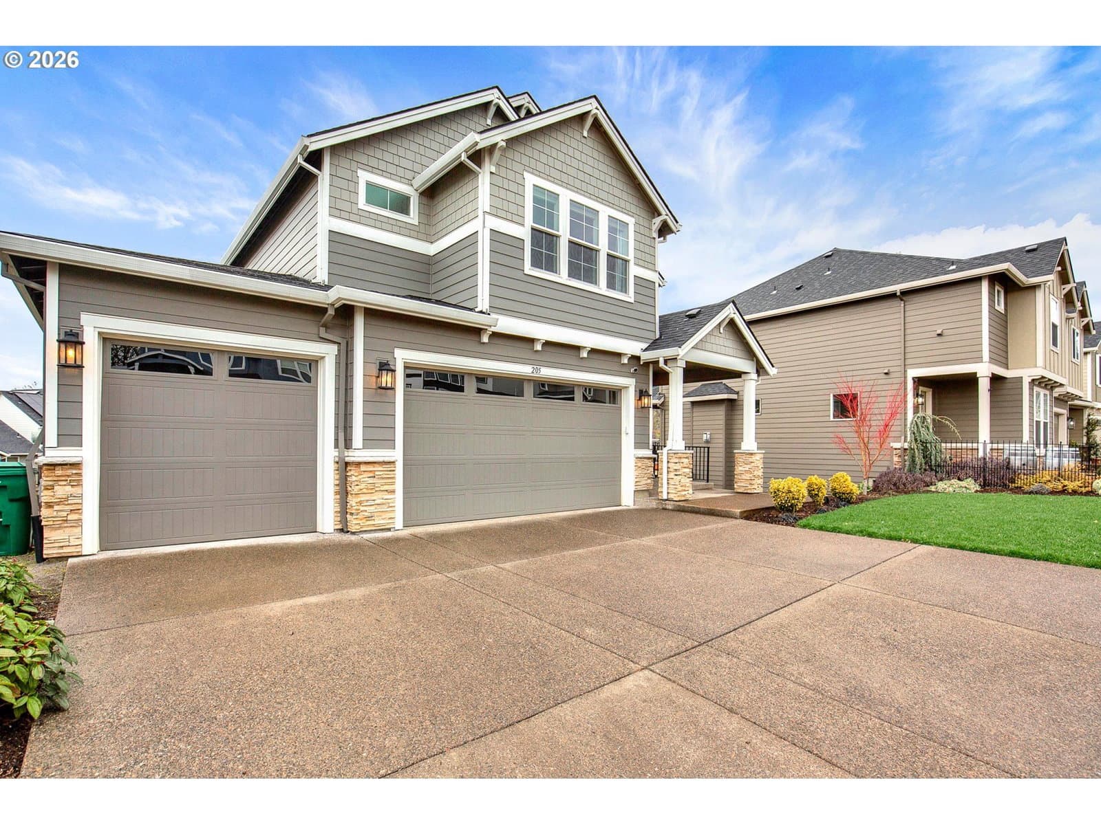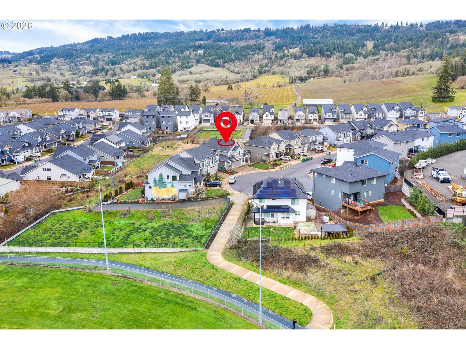 Absolutely Gorgeous! Completed in 2022, this beautifully designed 5-bedroom, 3-bath home offers modern comfort, thoughtful upgrades, and an exceptional cul-de-sac location. Ideally placed on a premium lot, this is the premier spot on the street, with a trail access point just a few steps from the front door—ideal for daily walks and easy access to the nearby softball field and popular looped walking trail. The main level features a light-filled great room layout centered around a chef-inspired kitchen with gas cooking, quartz countertops, a large island, and an inviting dining area. A bedroom and full bath on the main floor provide flexibility for guests, multi-generational living, or a home office. The striking open staircase leads to the upper level, where four additional bedrooms await, including a spacious primary suite with a walk-in closet and a luxurious private bath. Each upstairs bedroom has a walk-in closet. The backyard has been thoughtfully upgraded into a fully paved, level outdoor living space, creating a low-maintenance retreat with no lawn to mow. Fully fenced for pets, the yard opens to peaceful wetland views where the sounds of red-winged blackbirds add a serene, natural backdrop. Custom pavers, a built-in fire pit, and a large deck make this space perfect for both relaxing and entertaining. Exceptionally well maintained and truly move-in ready, this gorgeous home combines privacy, natural beauty, and modern living in one of Newberg’s most desirable settings. You will love it! URL & phone to be provided