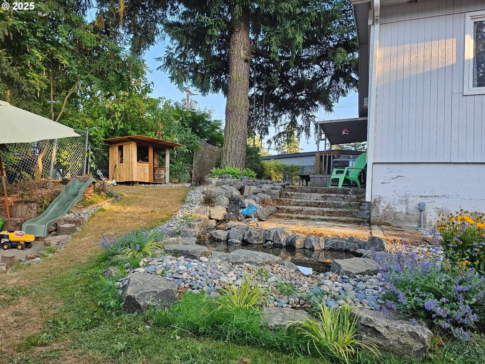Charming Gladstone Cottage with Modern Upgrades & Backyard Retreat with fresh exterior paint. Set on a generous 0.18-acre lot, this light-filled, move-in-ready cottage offers the perfect blend of charm, updates, and outdoor living. Inside, you'll find three full bedrooms and one full bathroom, along with an open-concept kitchen, cozy dining nook, and inviting living room.The spacious primary bedroom opens directly to a covered deck—ideal for enjoying your morning coffee or evening unwind. Major upgrades include a new roof and HVAC heat pump system (2021), as well as a new oven, dishwasher, water heater, vapor barrier, and new fencing (front and side with two gates).Outside, the terraced backyard features a fire pit, raised garden beds, chicken coop, and a man-made pond and stream, creating a peaceful retreat right at home. There’s also ample parking for RVs, boats, or multiple vehicles. Conveniently located near shopping and local amenities, this updated cottage is full of possibilities and ready to welcome you home.