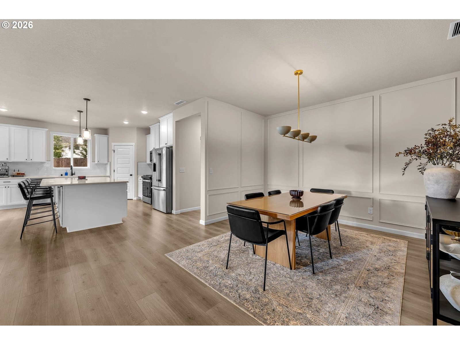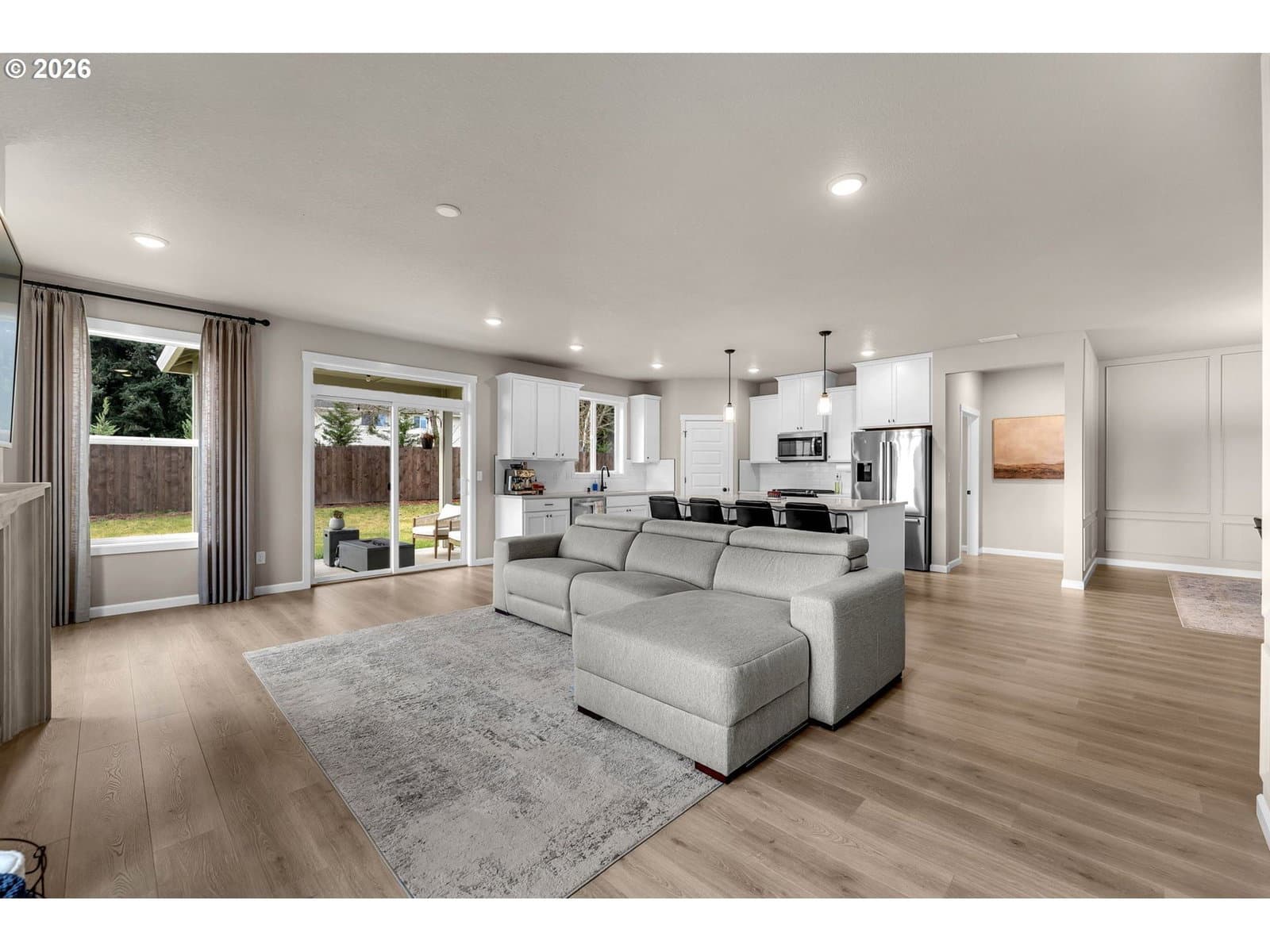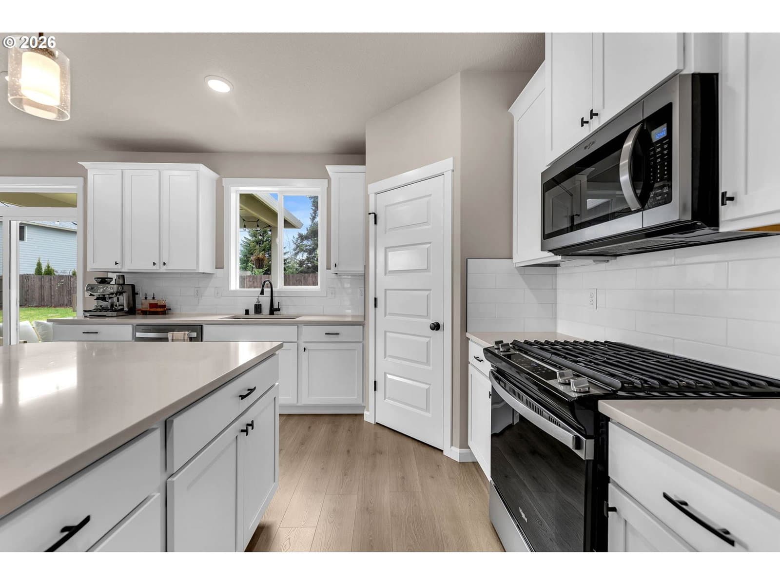 Extra-large 10,468 sqft lot. Single Level with Over-Sized Kitchen Island. Custom Added Wall Paneling in the Dining Room and Living Room. Custom Limestone Plaster Fireplace Surround and Mantel. Added Garage Cabinets for Storage. Amenities include a Covered Patio (with gas hook-up), 9ft Ceilings, Painted White Cabinets, Quartz Slab Countertops in Kitchen and Bathrooms/Laundry, Stainless Gas Appliances, Full Height 4 by 16-Inch Subway Style Backsplash, Under Cabinet and Pendant Lighting, Linear Style fireplace in the Great Room, Laundry Cabinets with Sink, Laminate Plank Flooring throughout. Tile Bathroom Floors and Master Shower. Upgraded flooring in the primary bedroom and closet. Full landscaping, Yard sprinkler system, fencing, garage door opener, and an electric car charger plug. Schedule a showing today! 3D Scan and Tour available. All installed appliances stay! Aho Construction