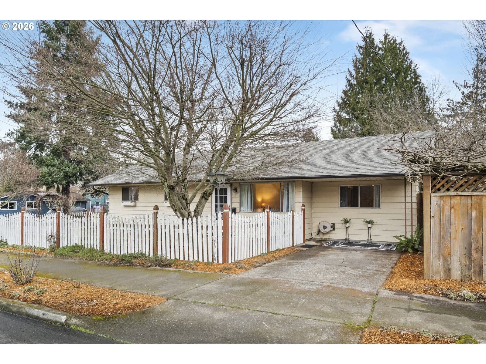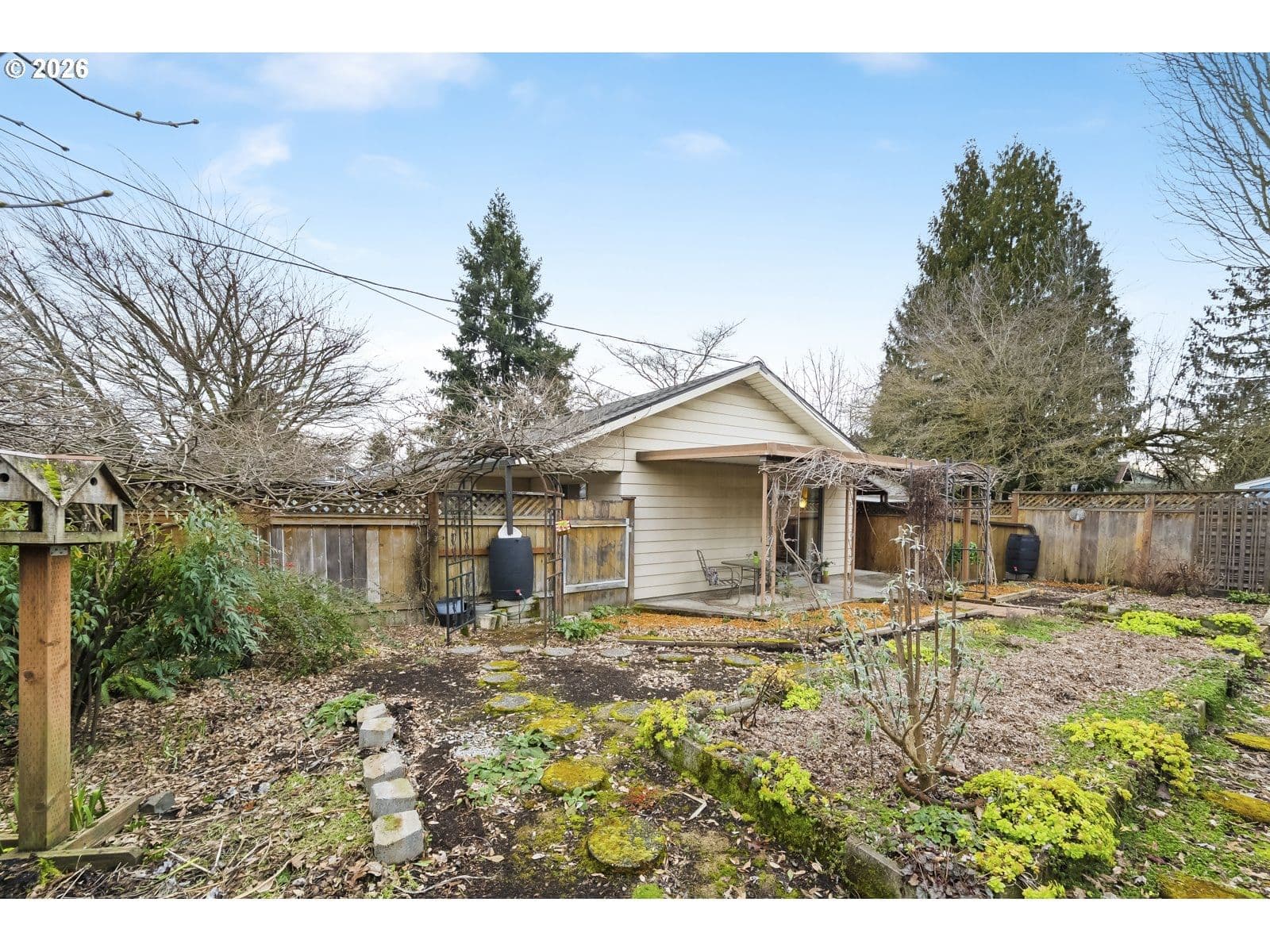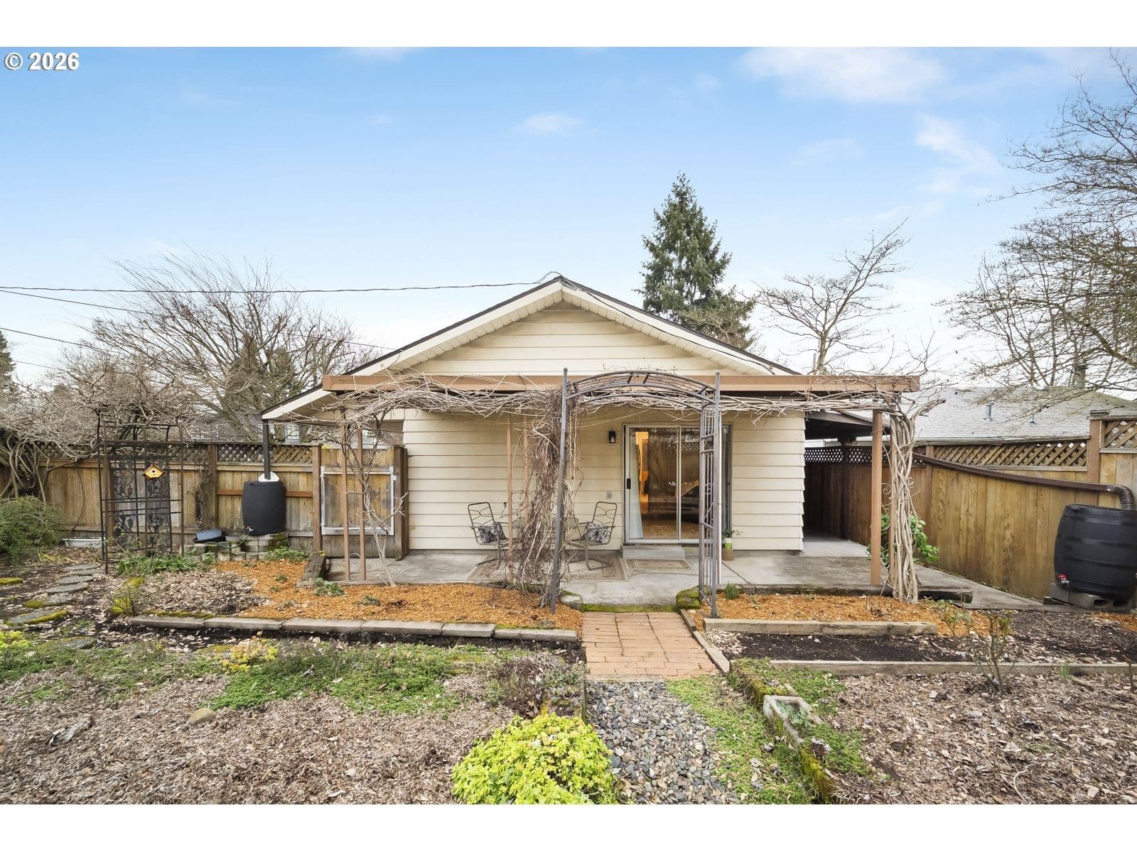 This sweet St. Johns ranch has been lovingly cared for by one owner since it was built in 1964! Located on a well-landscaped, fully fenced corner lot with an alley on the other side, this home feels like a private gardener's paradise with raised beds, japanese maples, hydrangeas, roses, and a spectacular wisteria that's a neighborhood favorite. Inside, find a spacious living room with original hardwood floors and a big picture window that flows into the dining space and comfortable kitchen. The family room is an excellent place to watch movies and relax after a long day, or create your ideal game room or creative space with direct access to the garden. The full bathroom and two spacious bedrooms are in their own wing of the house- enjoy having an oversized primary bedroom, or easily convert this space back into two separate rooms to make a three bedroom home. This special property exudes warmth and care- enjoy the peace of mind that comes with a brand new electrical panel, newer (2021) hot water heater, and a newer (2023) roof! [Home Energy Score = 3. HES Report at https://rpt.greenbuildingregistry.com/hes/OR10244024]