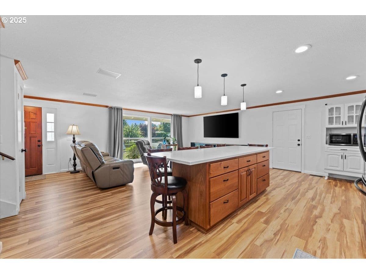 Welcome to your dream retreat! This stunning home sits on an extra-large, beautifully landscaped corner lot—perfect for those who crave privacy, and versatility. Whether you have a boat, RV, or extra vehicles, there's plenty of room to park them all, plus a separate shop for storage or hobbies. Step inside to a light-filled Great Room that seamlessly connects indoor and outdoor living, thanks to expansive front windows and a glass door leading to the huge, covered deck—ideal for year-round entertaining. The backyard is a tranquil oasis, complete with a zen-inspired water feature that invites relaxation including a Koi Pond. The kitchen boasts a large island, sleek stainless steel appliances, & ample space for gathering. On the lower level, you'll find a spacious daylight basement family room, walk-in closet, & convenient laundry room. Upstairs, a Primary Suite offers flexibility for guests or multi-generational living, along with additional bedrooms for family or office space.