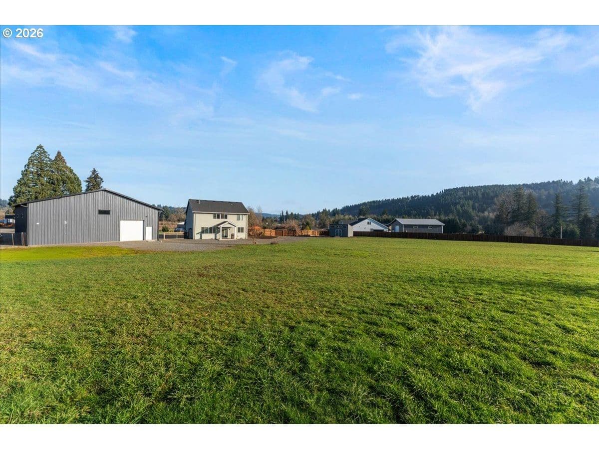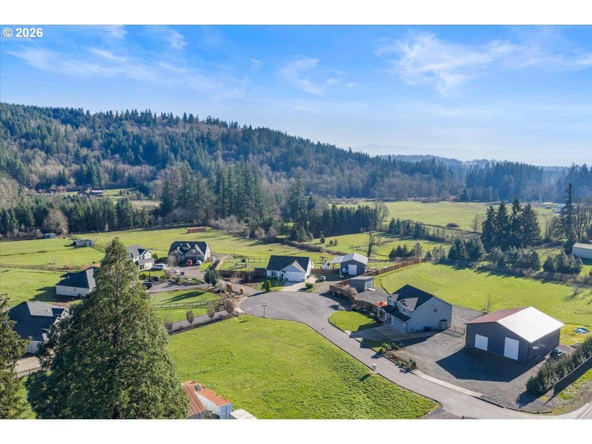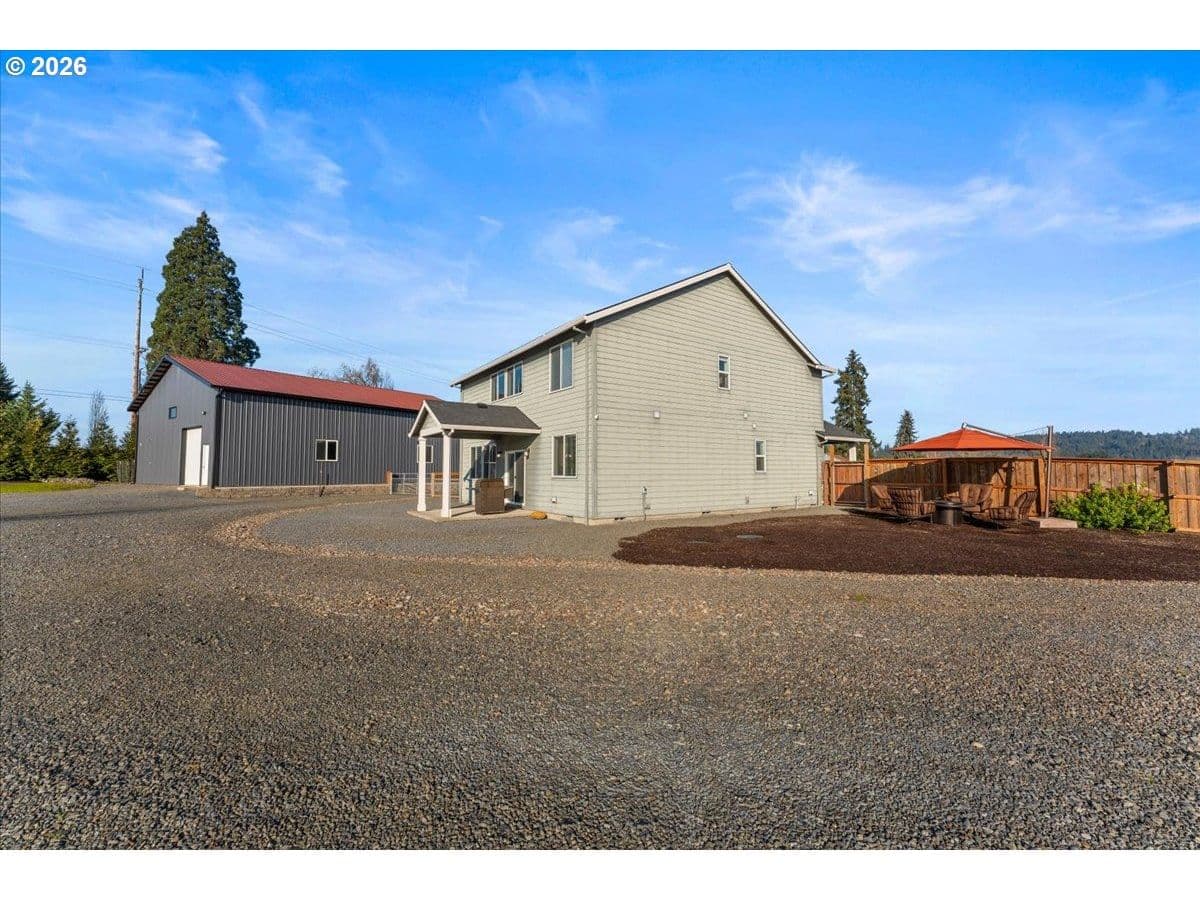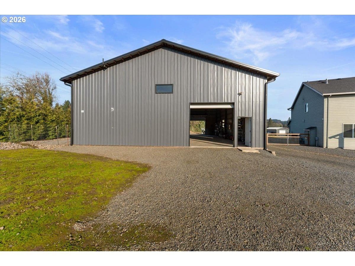 An exceptional property set on a level 2 acres offers a rare combination of a beautiful custom home, expansive grounds & an absolutely incredible shop! Contractors, hobbyists, car collectors, mechanics & entrepreneurs alike will appreciate the massive workshop equipped for serious use. The 45’x54’ shop features 3 roll-up doors, allowing drive-through access. Ideal for RVs, boats, car collections, inventory storage & creative pursuits. The shop includes it’s own bathroom w/tile shower, tankless water heater, utility sink + is prepped for HVAC installation. Sun-drenched & spotless, the house is completely move-in ready! Work from home in style in a bright, private office at the front of the house. Designed for both form & function, the generous kitchen will delight your inner chef, featuring wood cabinetry, sleek quartz countertops, walk-in pantry & modern engineered hardwood floors. The 2023 stainless steel KitchenAid suite includes a 5-burner gas range + built-in electric oven, all surrounding a generous island & eat-in bar. The heart of the home is the expansive, open-concept great room—ideal for hosting lively dinner parties, or curling up on a massive sectional for cozy movie nights. Escape to the primary suite w/high ceilings, generous walk-in closet, f/s tub, shower & 2 single vanities. A flexible 4th bedroom makes an excellent office, playroom, or craft space. Upstairs laundry adds everyday convenience (2023 Samsung washer & dryer included). Storage abounds throughout the home, shop & backyard shed. Set perfectly between Oregon City, Molalla, and Canby, w/access to Hwy 213, shopping, dining & major medical, while maintaining a peaceful small-town feel. Level, securely fenced w/garden & fruit trees & endless possibilities for a pool, sports court or play area. Located on a private cul-de-sac loop with friendly neighbors, colorful sunsets & no through traffic. This is a truly special property offering space, flexibility & exceptional amenities—inside and out!