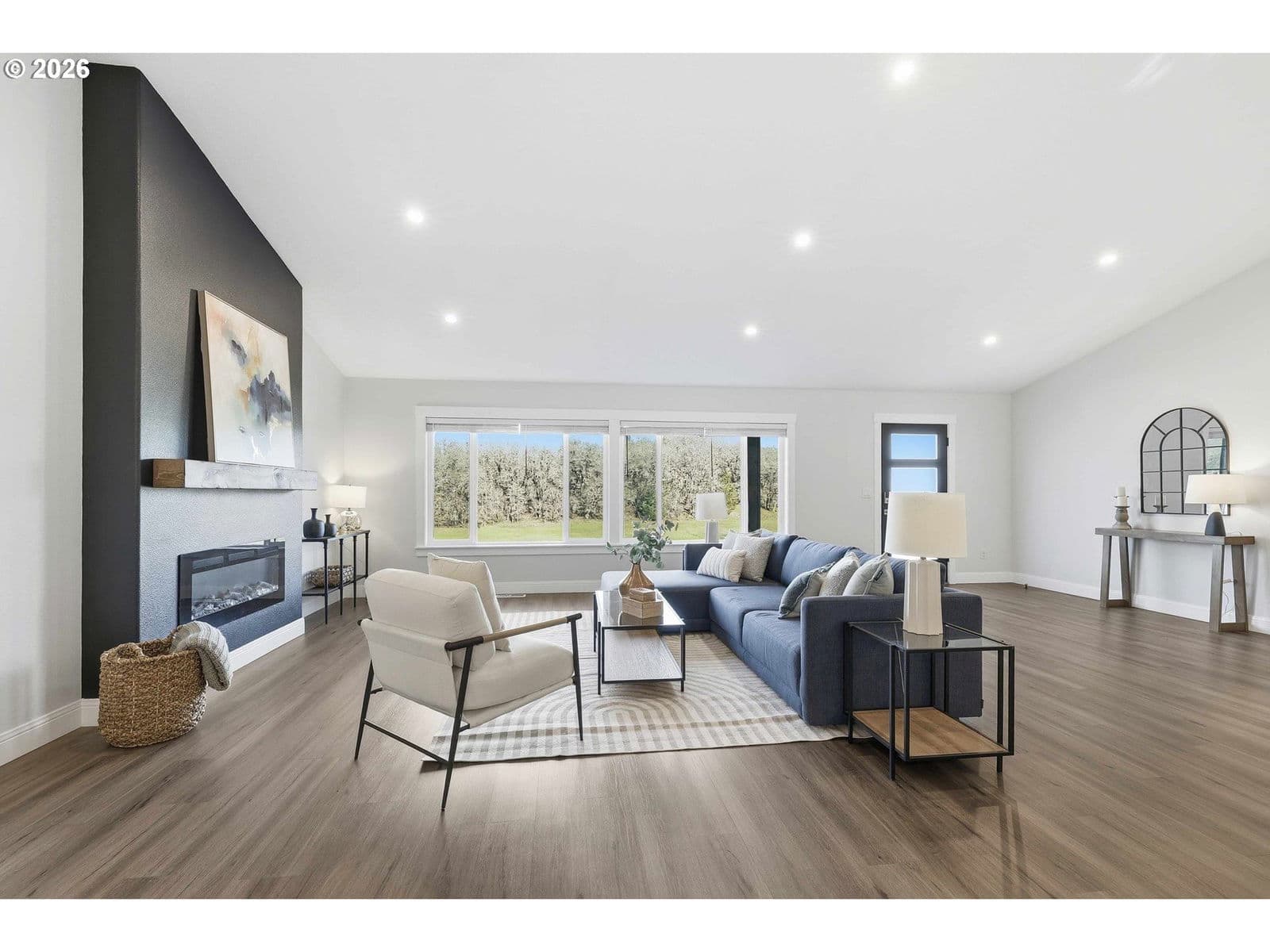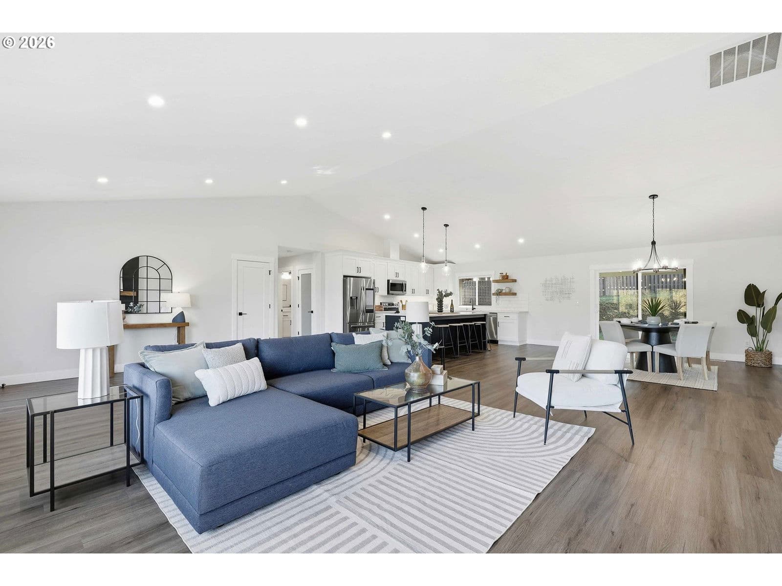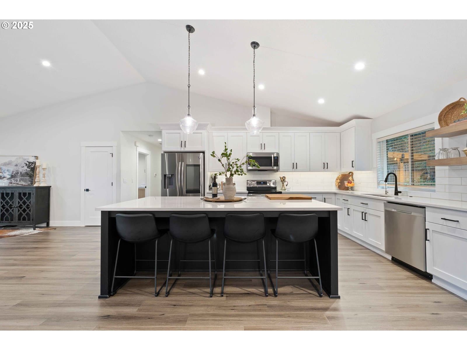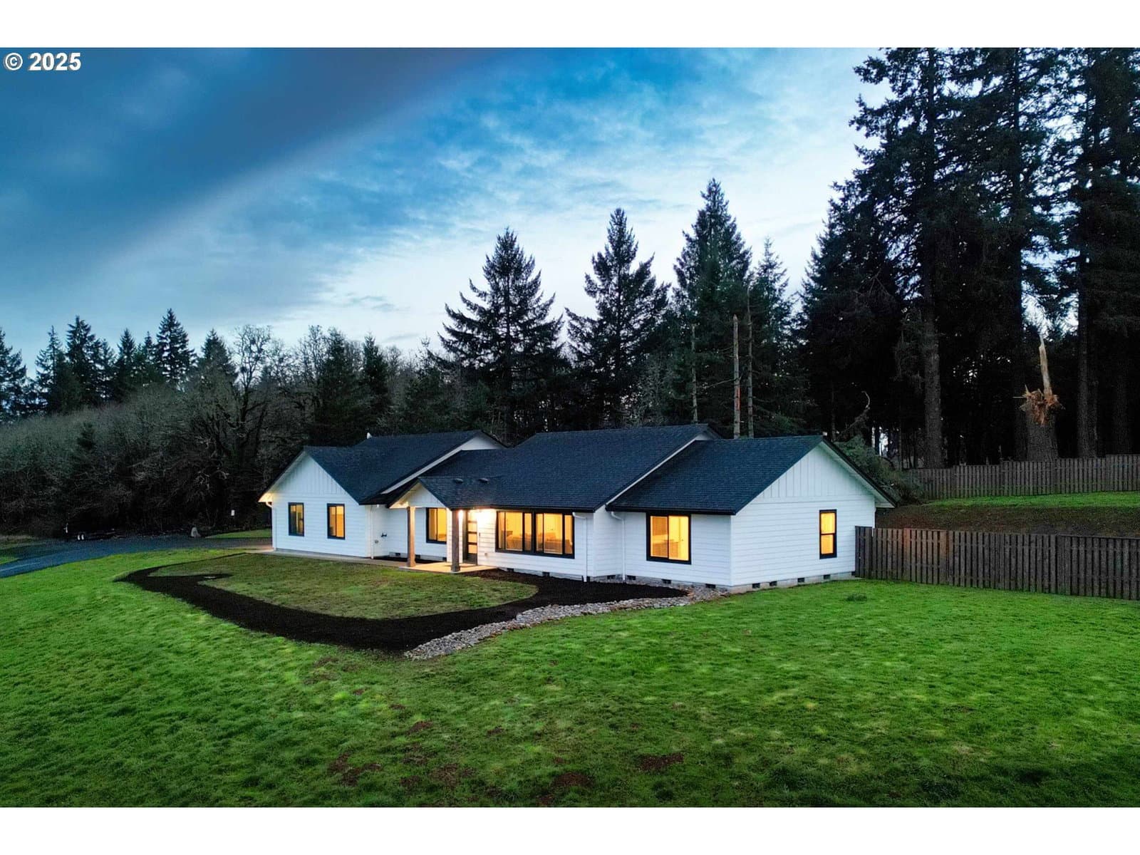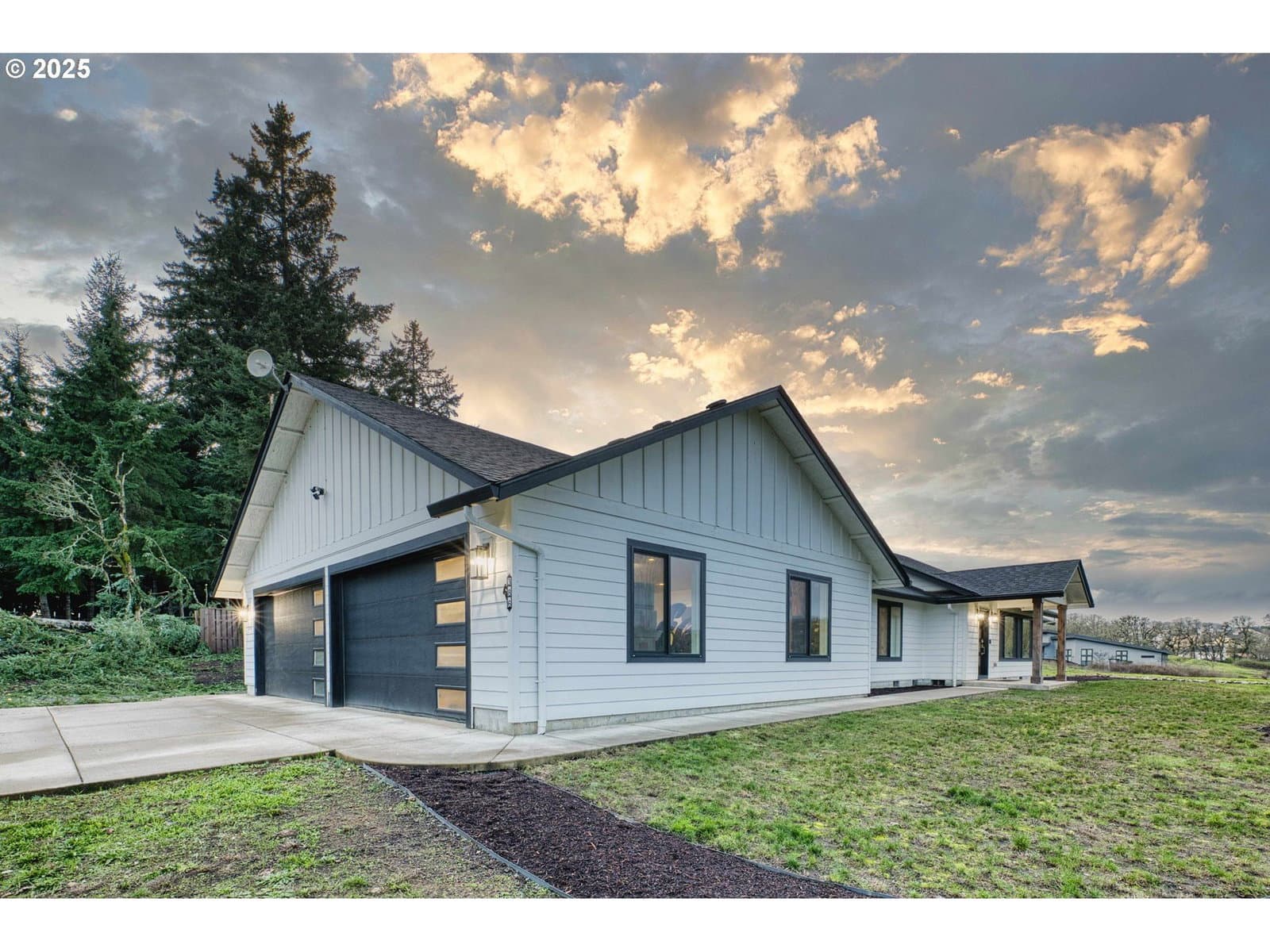 Exquisite single-level luxury home built in 2021, offering three bedrooms and two baths on five acres. This refined residence showcases a chef’s kitchen with high-end finishes, a large pantry, vaulted and soaring ceilings, and a thoughtfully designed open floor plan. The primary suite is a private retreat, complete with a spa-inspired walk-in shower, dual sinks, quartz countertops, and a generous walk-in closet. The backyard is designed for both relaxation and recreation, featuring a fenced area, covered patio, and a hot tub. A spacious 1,200 (40x30) sqft finished four-car garage adds both convenience and functionality, while the expansive acreage provides privacy, space, and endless possibilities—all wrapped in effortless one-level living. Fully paved drive to the home. Peaceful living with convenient access to restaurants, shopping, parks and local amenities.