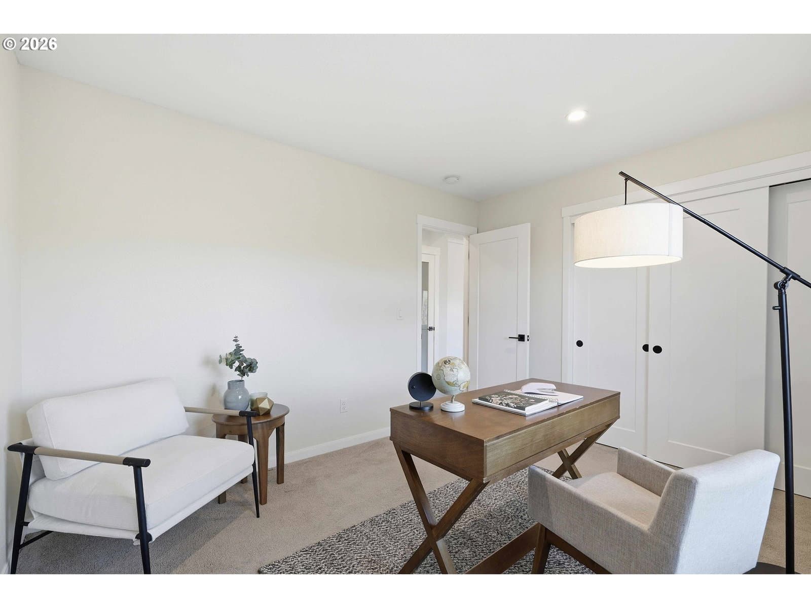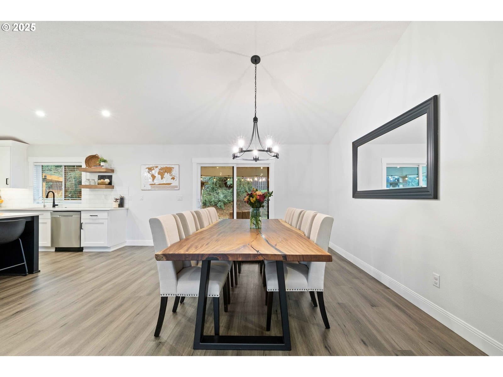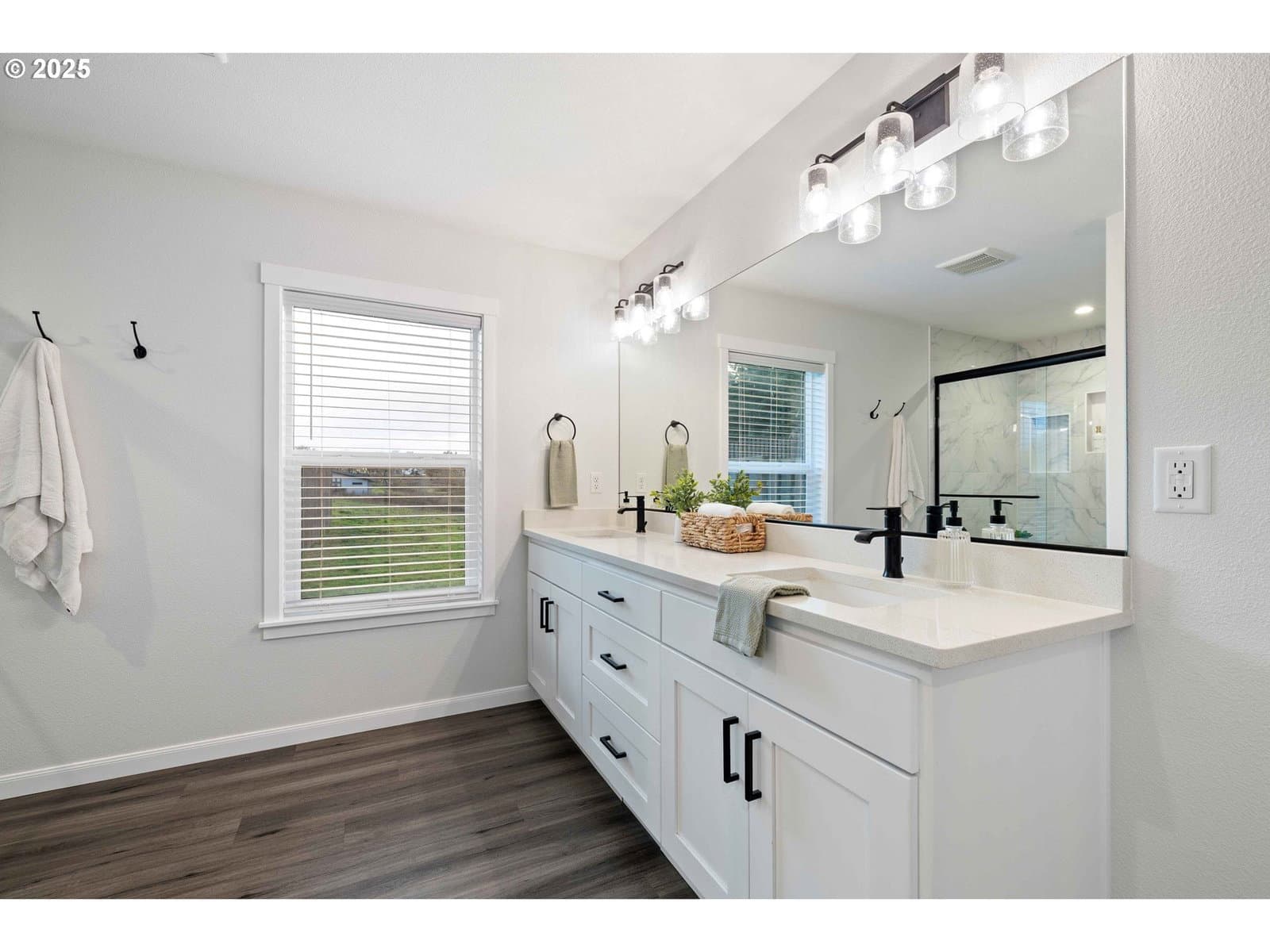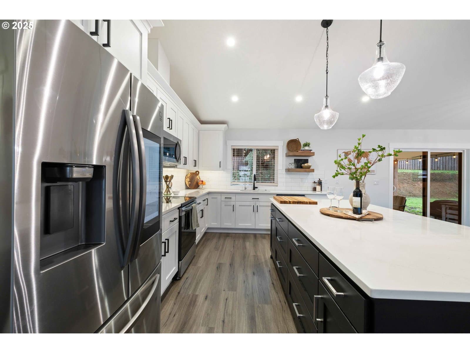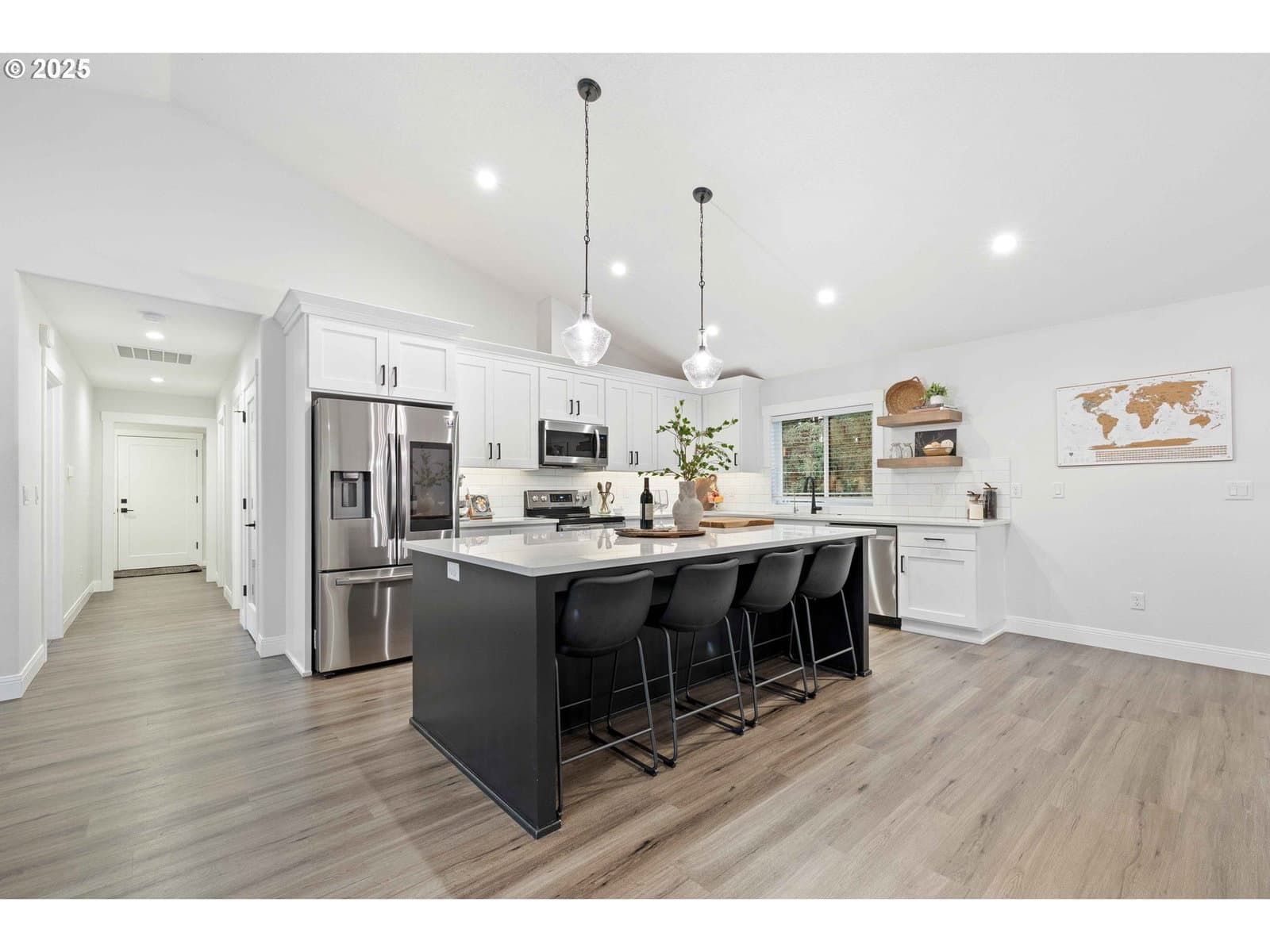 Exquisite single-level luxury home built in 2021, offering three bedrooms and two baths on five acres. This refined residence showcases a chef’s kitchen with high-end finishes, a large pantry, vaulted and soaring ceilings, and a thoughtfully designed open floor plan. The primary suite is a private retreat, complete with a spa-inspired walk-in shower, dual sinks, quartz countertops, and a generous walk-in closet. The backyard is designed for both relaxation and recreation, featuring a fenced area, covered patio, and a hot tub. A spacious 1,200 (40x30) sqft finished four-car garage adds both convenience and functionality, while the expansive acreage provides privacy, space, and endless possibilities—all wrapped in effortless one-level living. Fully paved drive to the home. Peaceful living with convenient access to restaurants, shopping, parks and local amenities.