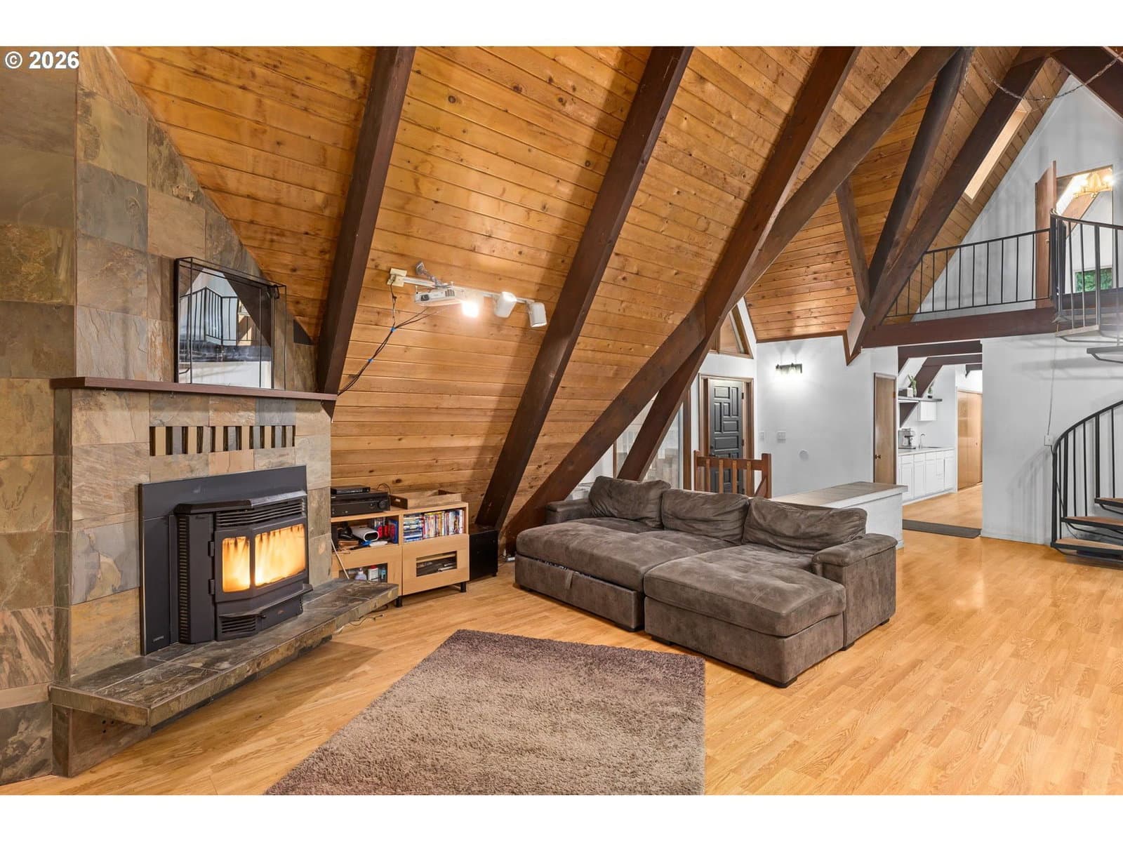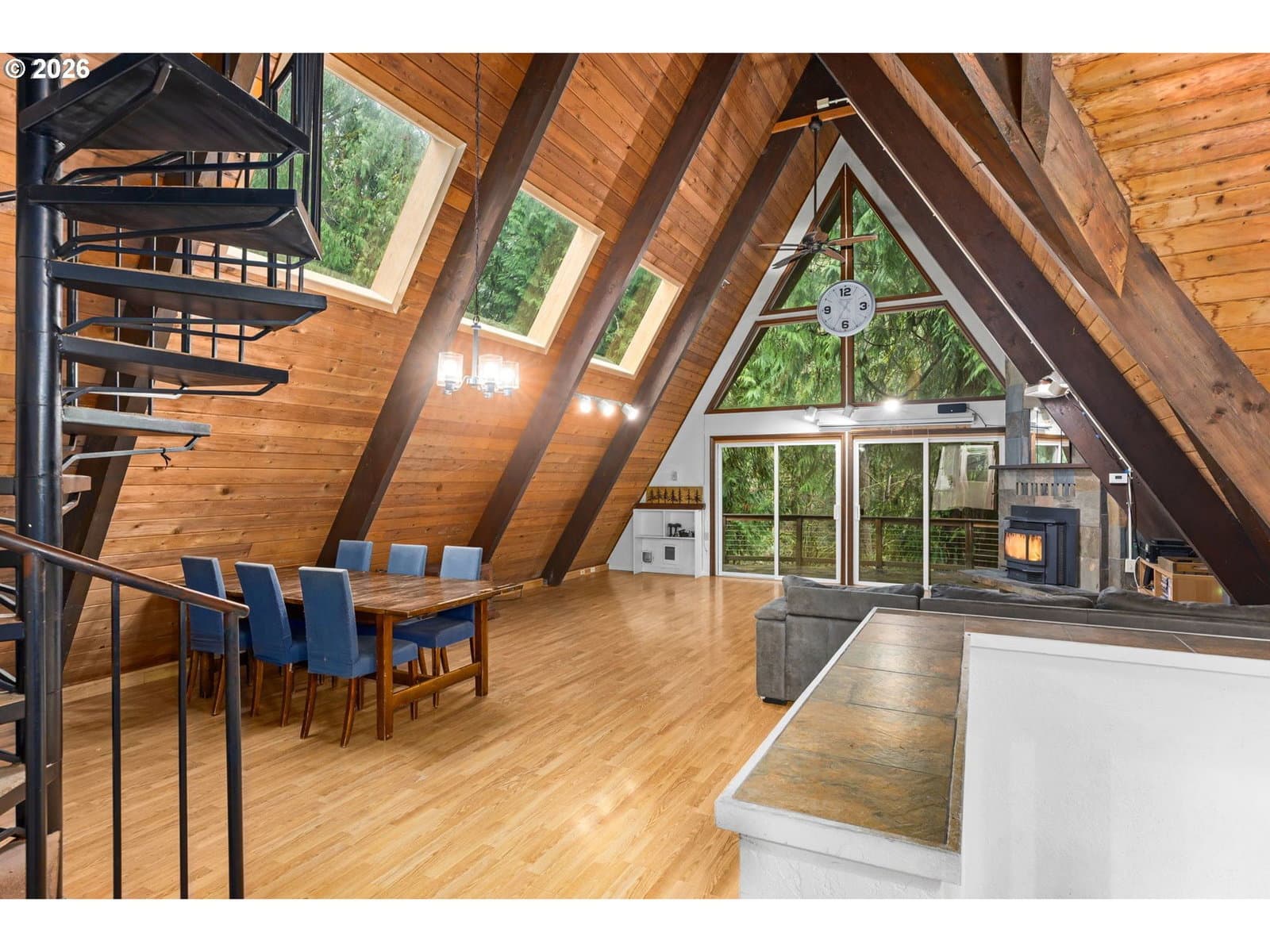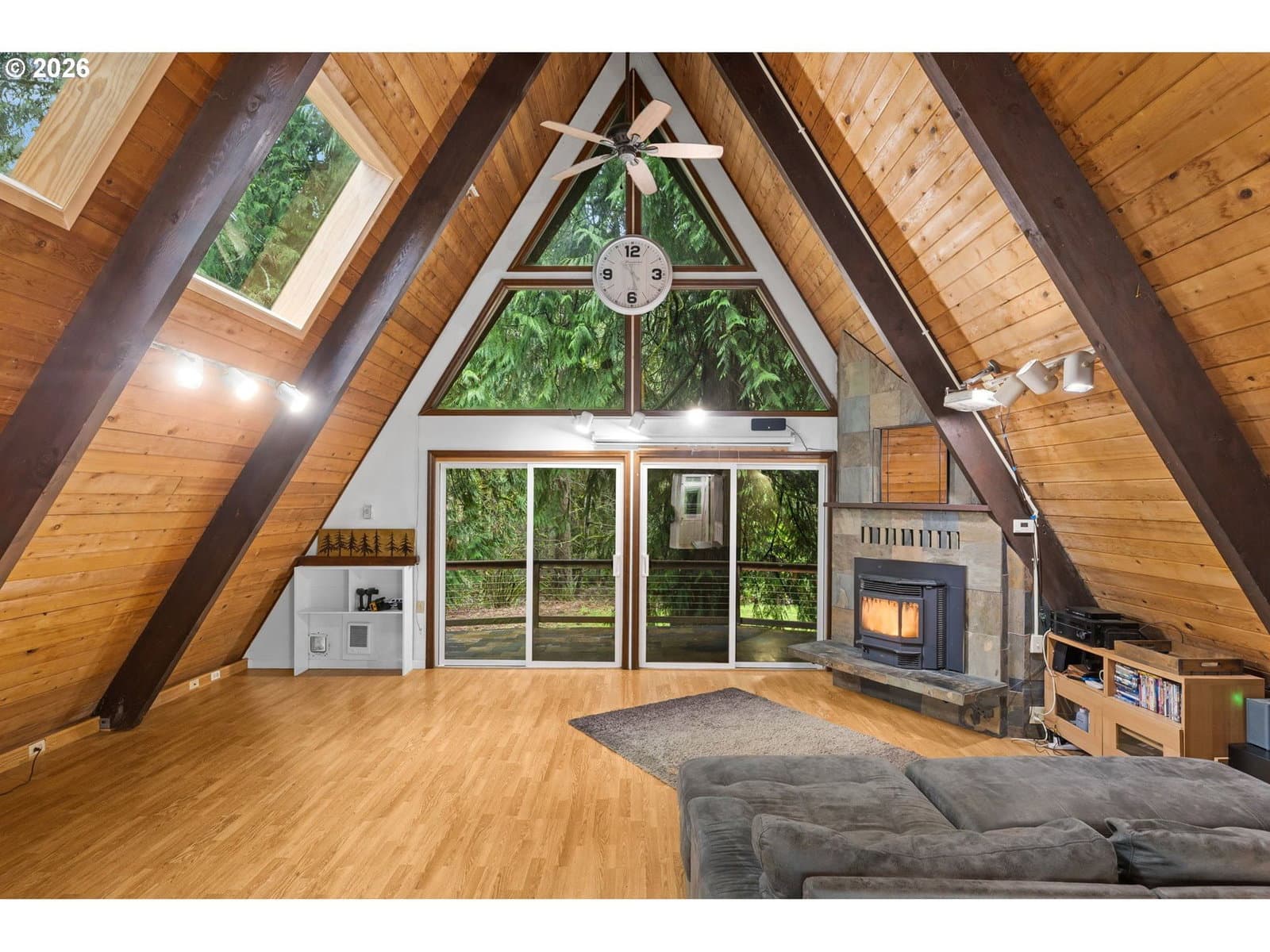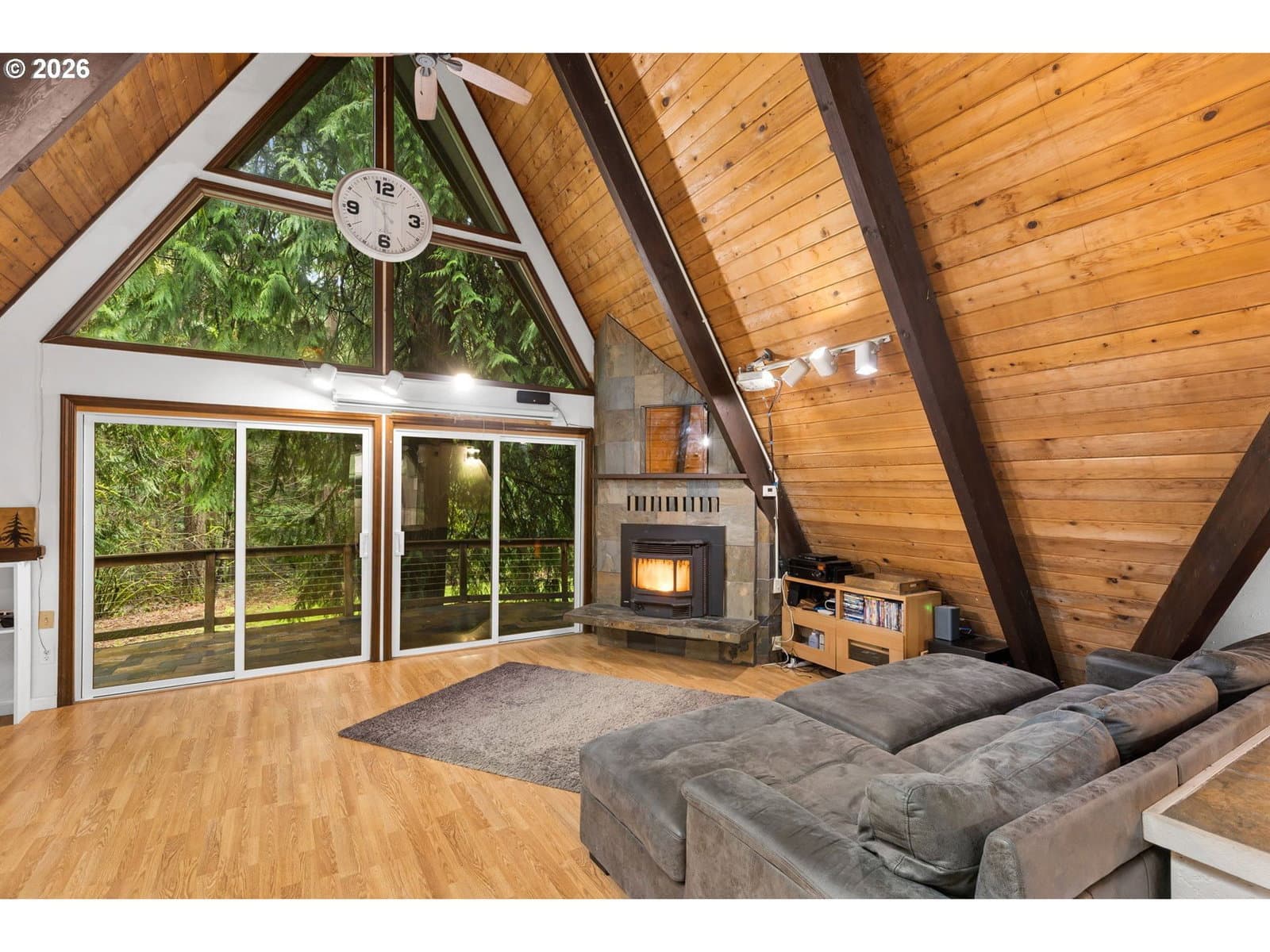Tucked away on over 2 acres, this A-frame inspired retreat offers the perfect blend of architectural character, peaceful surroundings, and everyday convenience. A soaring wall of windows with a cozy, cabin-like feel creates a true nature escape, while still being just minutes from shopping, dining, and amenities in the tight-knit Sandy community. Plus, just a 35 minute drive to PDX, and 45 minutes to Government Camp, a location ideal for both recreational enthusiasts and city living.Beyond the charm, this home was designed with room to live and play. The property features 3+ bedrooms and 3 full bathrooms, including ensuite primary, an EV ready, four-car garage, above ground pool with pool house, an outbuilding and ample space for recreational vehicles, boats, tools, and hobbies. Everything you’d want all in one place. Highlighted updates and features include: A-frame entryway, roof, sky lights, windows, sliders, paint, remodeled kitchen and pantry, pellet stove, refreshed loft flex area, garage doors, outbuildings, well pump-house and EV hookup. Rarely do homes offer this level of privacy and proximity. Schedule your showing and see why this is one that truly needs to be experienced in person.