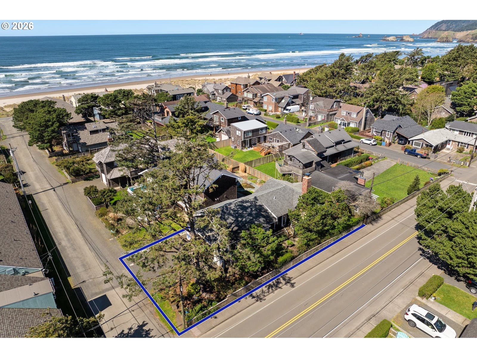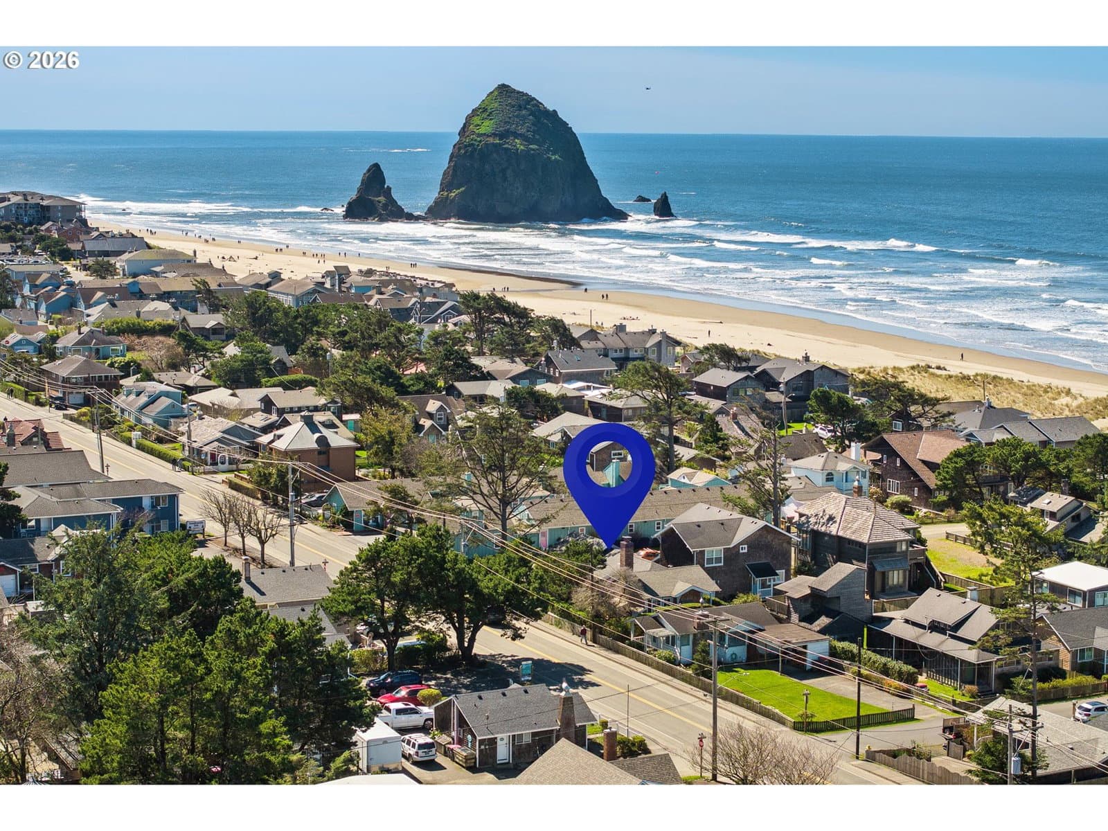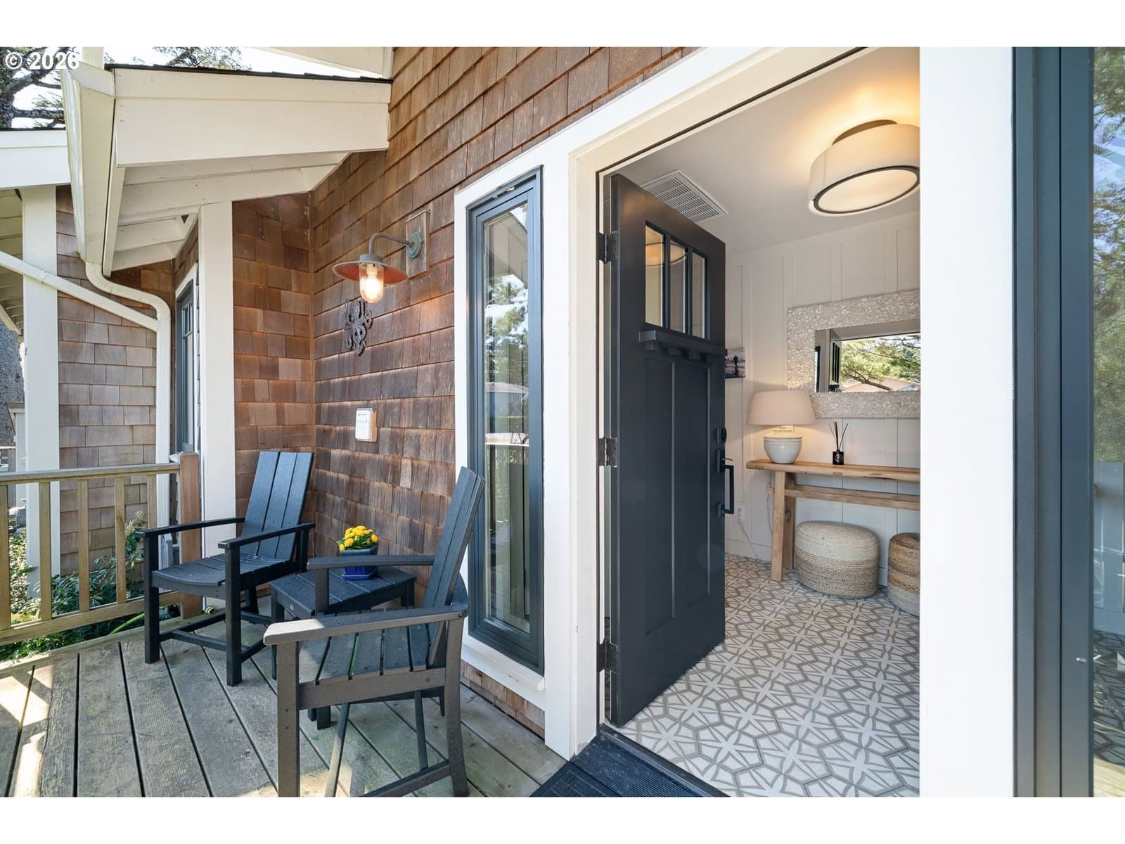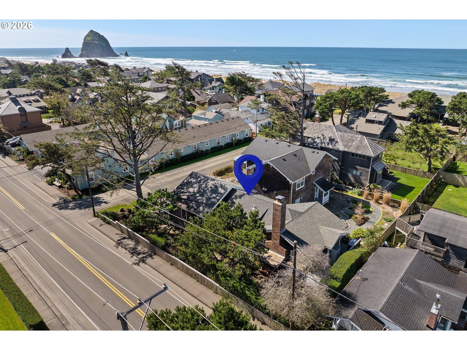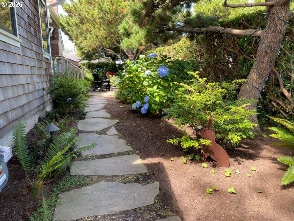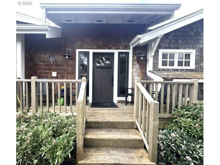 Nestled in Cannon Beach’s coveted West Presidential Street neighborhood, this fabulous one story cottage offers effortless access to both the beach and downtown’s shops and dining. Completely remodeled inside and out, the home blends coastal elegance with relaxed comfort. Vaulted beamed ceilings, beautiful Fir wood floors, and a stunning river-rock wood-burning fireplace create a warm and inviting living space.The spacious entry leads to a thoughtfully updated kitchen featuring stainless steel appliances and quartz countertops. Two en-suite bedrooms offer privacy and convenience, each with roll-in showers. Outdoors, enjoy Trex-style decking, a freestanding hot tub, and a private gated front yard complete with a fire pit and tranquil water feature—perfect for relaxing after a day at the beach.