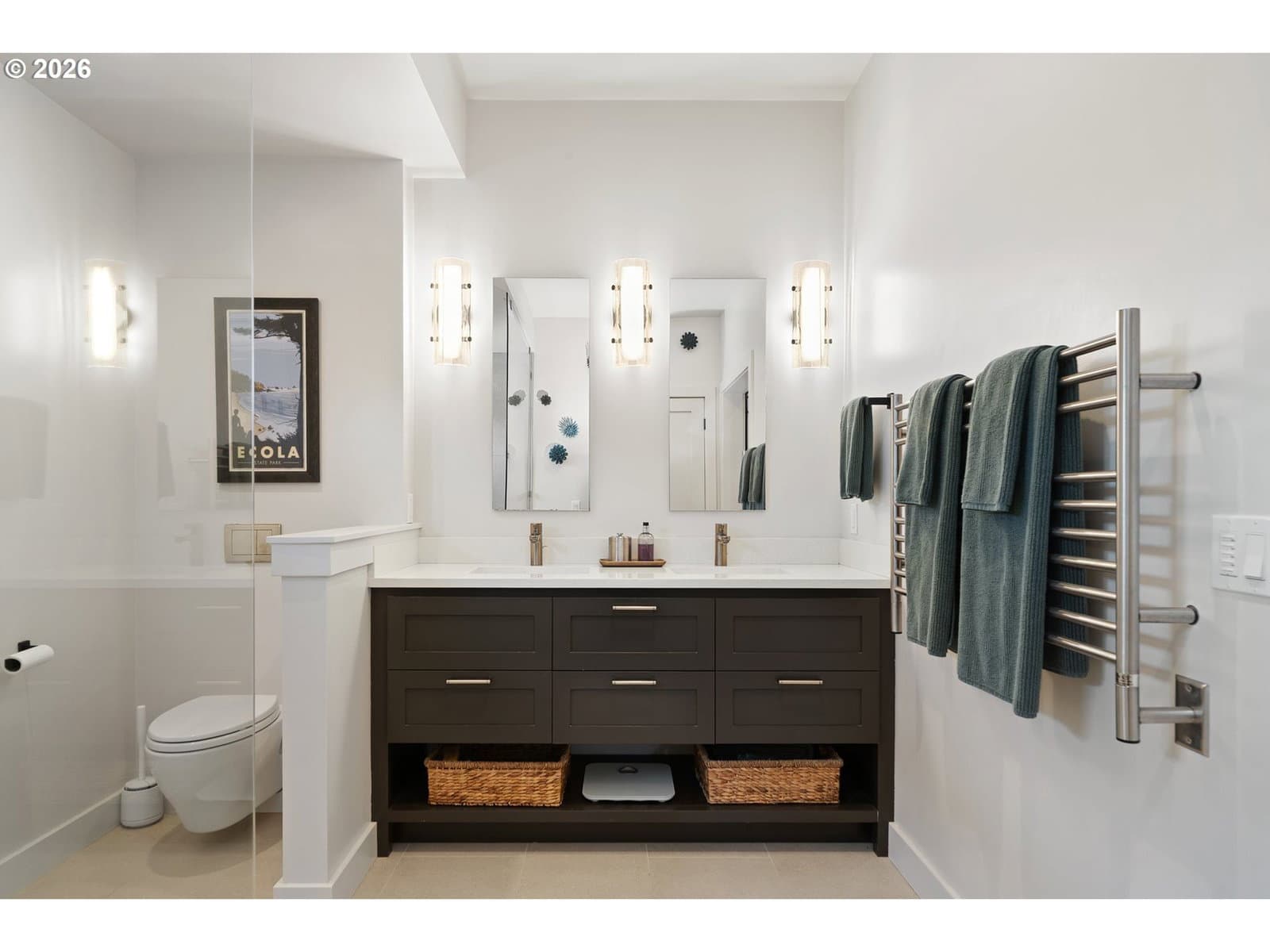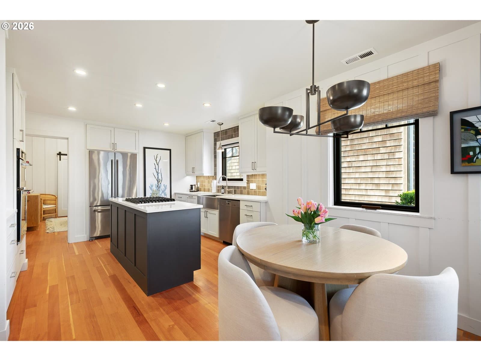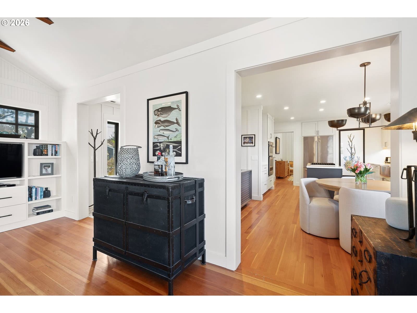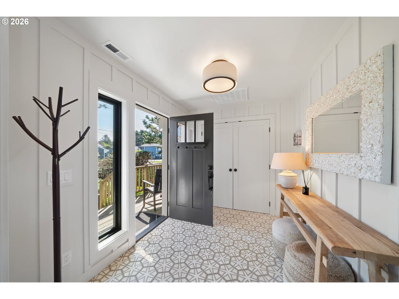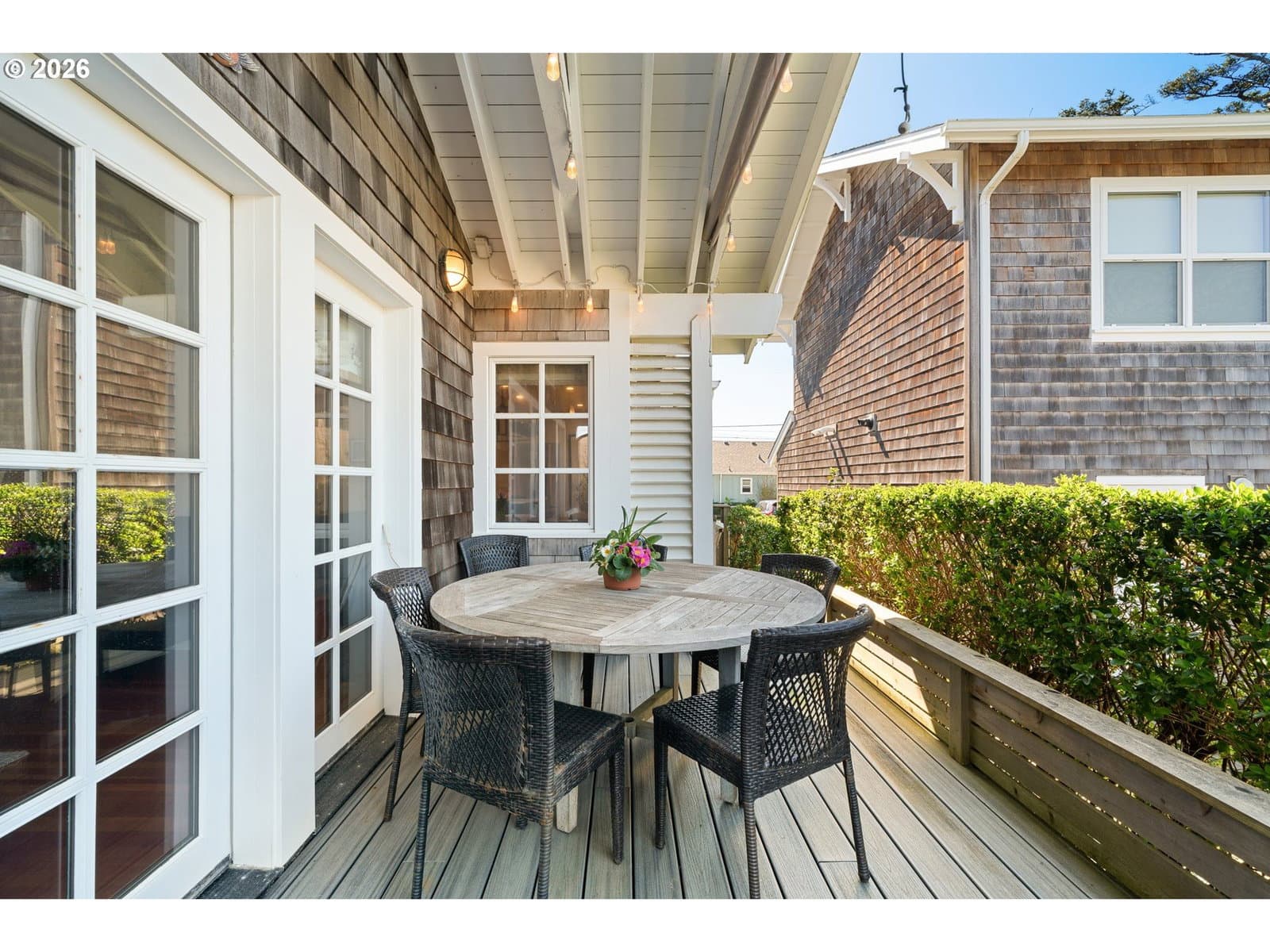 Nestled in Cannon Beach’s coveted West Presidential Street neighborhood, this fabulous one story cottage offers effortless access to both the beach and downtown’s shops and dining. Completely remodeled inside and out, the home blends coastal elegance with relaxed comfort. Vaulted beamed ceilings, beautiful Fir wood floors, and a stunning river-rock wood-burning fireplace create a warm and inviting living space.The spacious entry leads to a thoughtfully updated kitchen featuring stainless steel appliances and quartz countertops. Two en-suite bedrooms offer privacy and convenience, each with roll-in showers. Outdoors, enjoy Trex-style decking, a freestanding hot tub, and a private gated front yard complete with a fire pit and tranquil water feature—perfect for relaxing after a day at the beach.