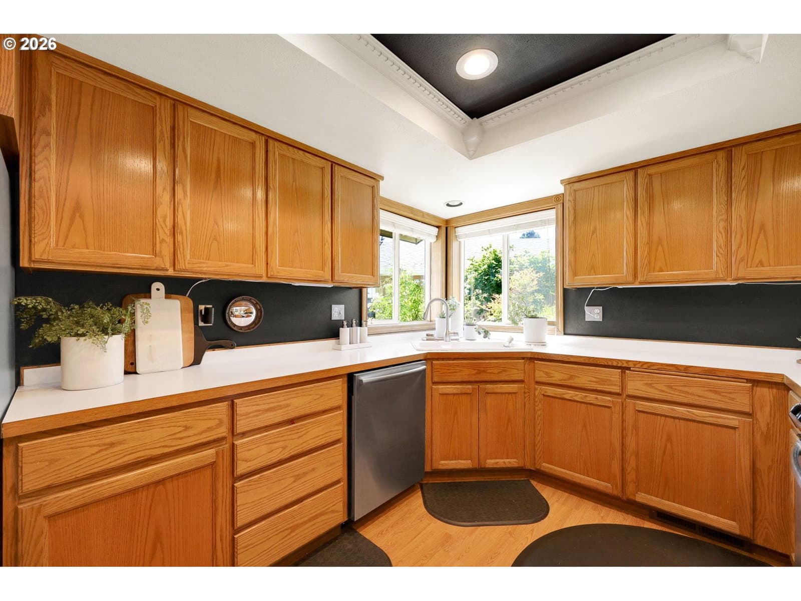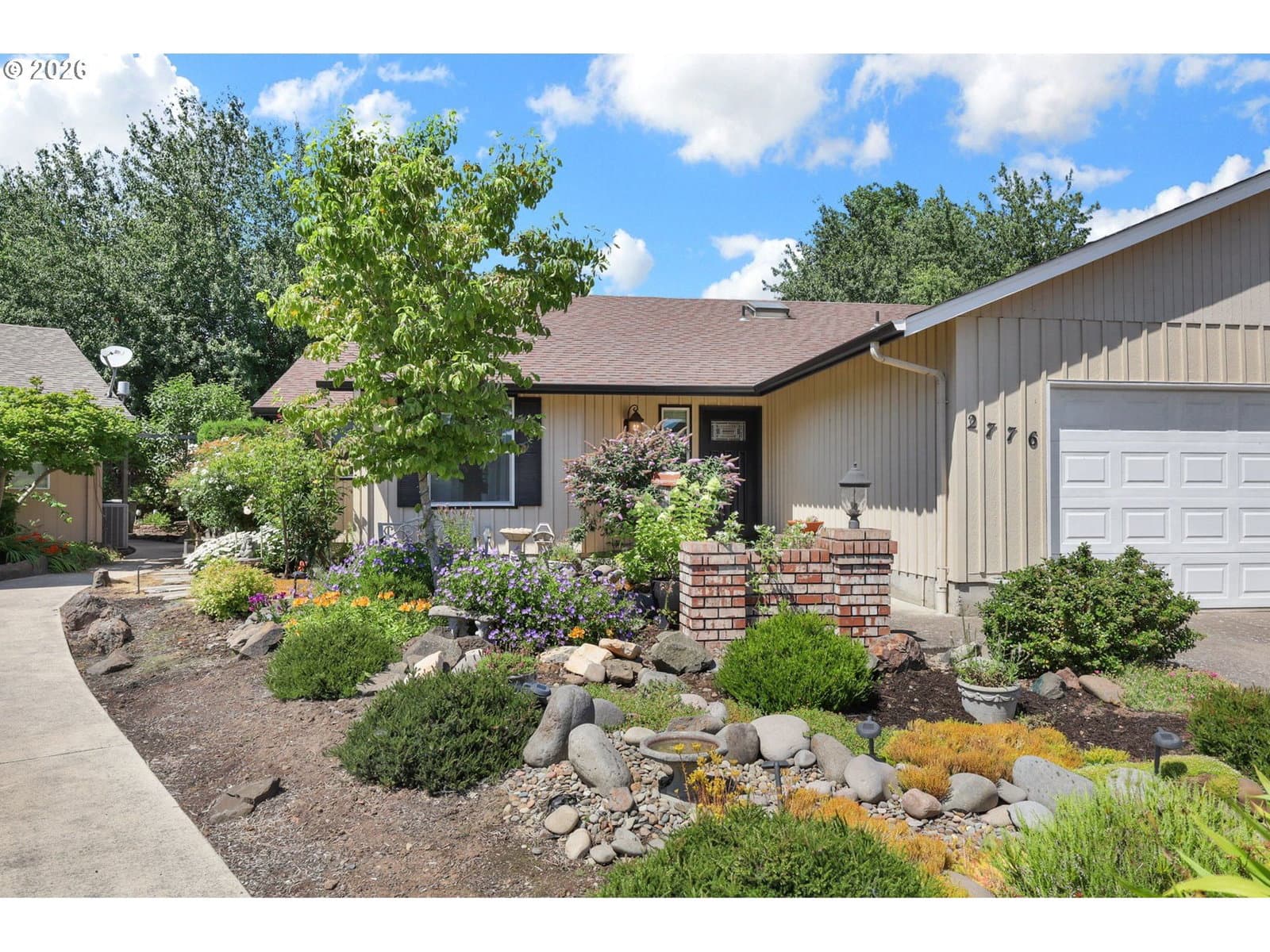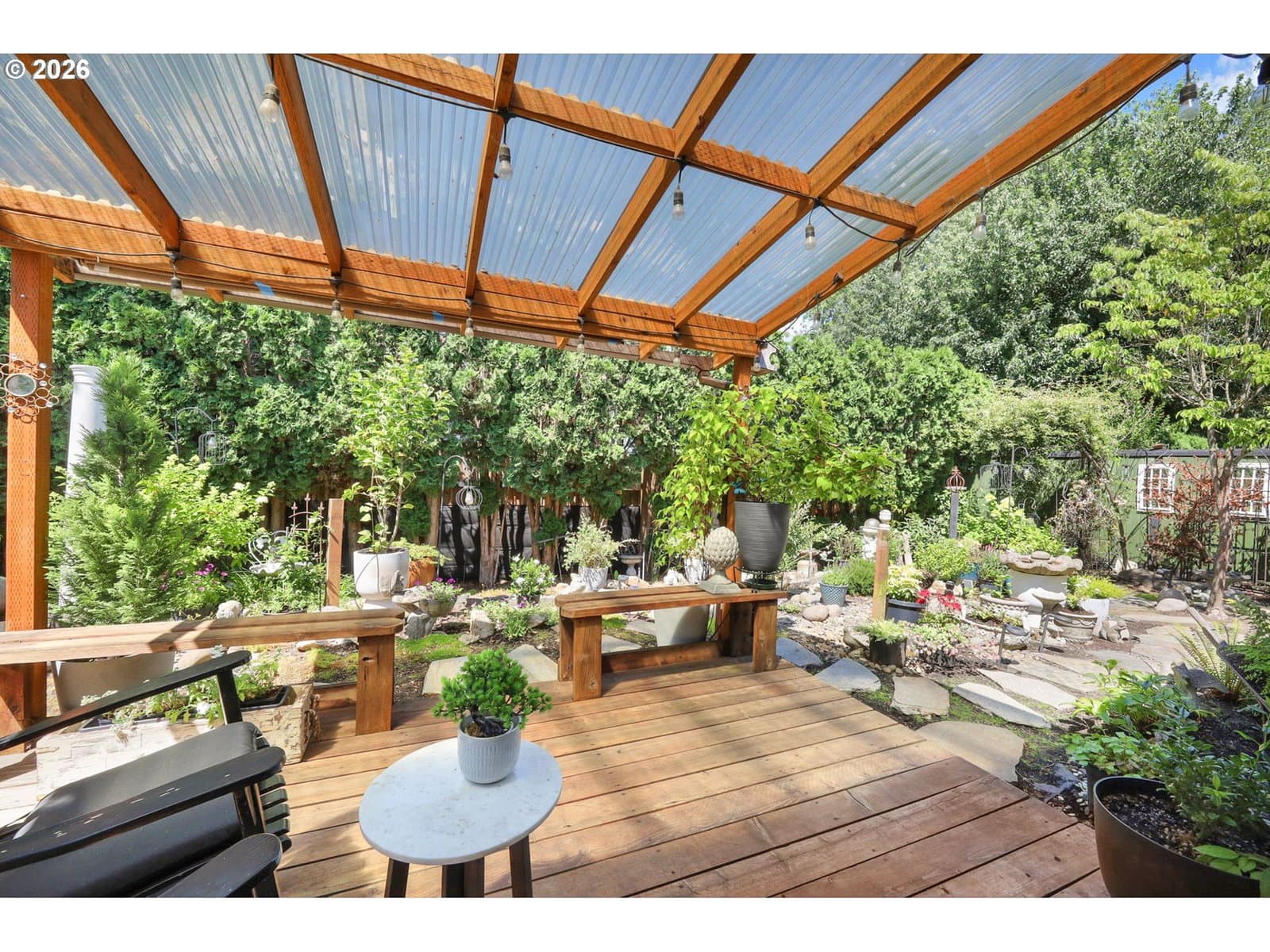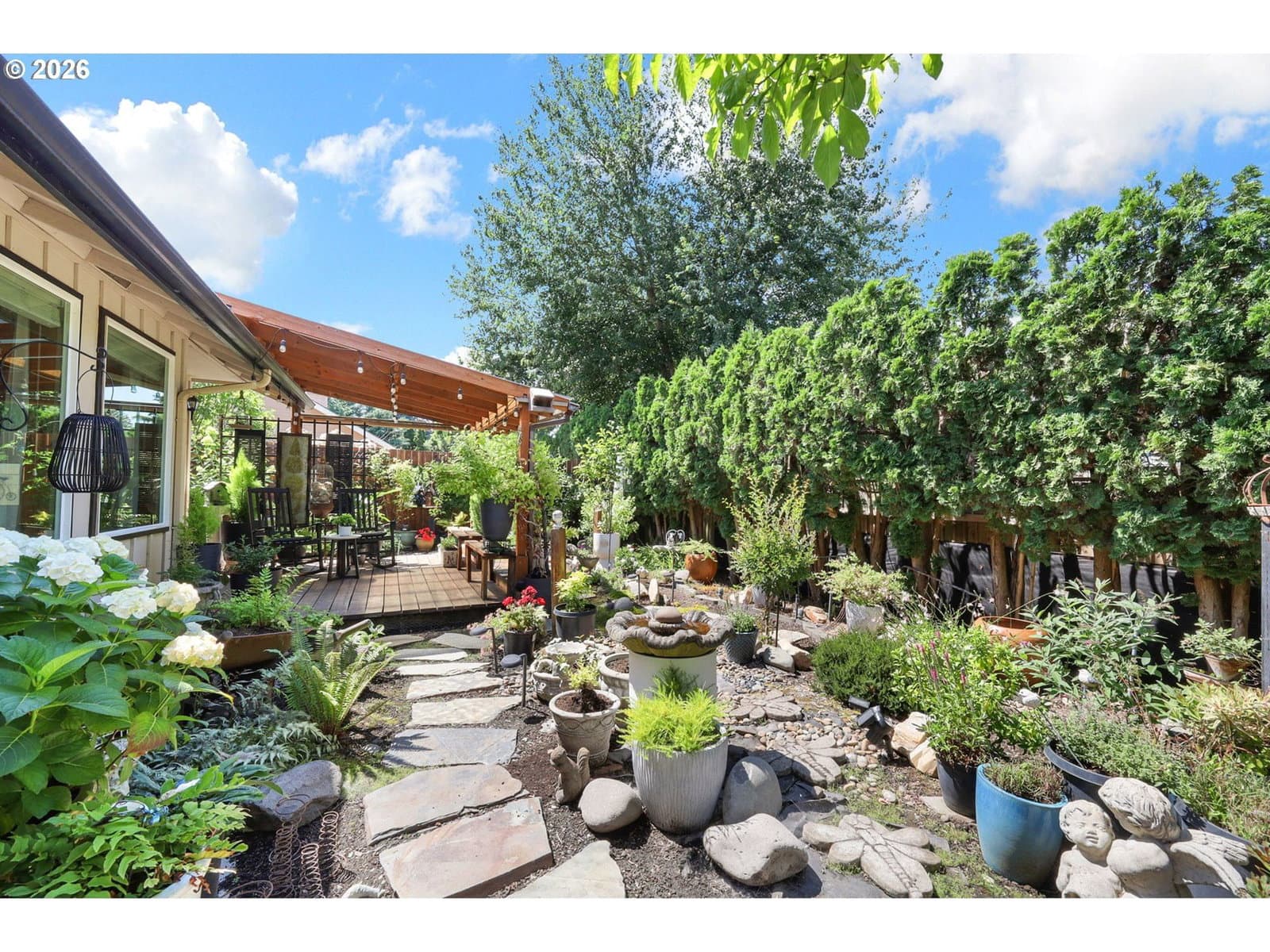 Welcome to this charming 2-bedroom, 2-bath, single-level home that blends thoughtful upgrades with serene outdoor living. A true plant lover’s dream, this property features beautifully landscaped low-maintenance front and back yards, complete with a drip irrigation system and lovely water features that create a peaceful, garden-like retreat. Inside, you’ll find numerous upgrades throughout, including fresh interior paint, remodeled bathrooms with new vanities and elegant marble countertops, and custom wainscoting in both the bedroom and living room. The living area is anchored by a stunning custom fireplace mantel with travertine marble, adding warmth and character to the space. The open kitchen with a convenient serving window is perfect for everyday living and entertaining. Major systems have already been taken care of with a new HVAC system and new roof, offering comfort and peace of mind. Step outside to enjoy the covered redwood deck, ideal for relaxing, hosting guests, or simply enjoying the tranquil surroundings.