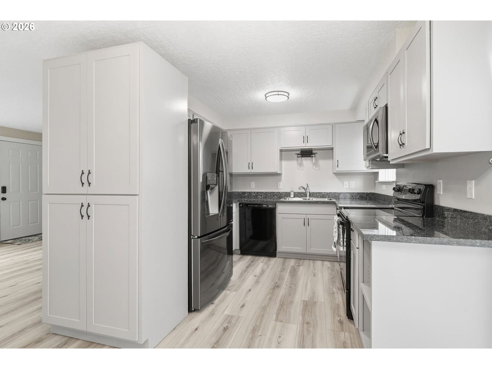 Completely remodeled inside and out within the last few years, this well-maintained property offers flexibility, space, and convenience. Enjoy low county taxes at just $2,962.19 per year and abundant parking with room for an RV, toys, or multiple vehicles. The property includes an 12x16 shed with electricity and a floorplan designed for potential separate living space upstairs. Water heater and attic fan have programable timers for efficiency. Located on a low-traffic street just half a block from Bobolink Park, featuring fruit and nut trees, and within walking distance to two elementary schools. Conveniently situated only 10 minutes from Eugene Airport and Shadow Hills Country Club, with easy access to the Beltline and NW Expressway—making it simple to avoid River Road traffic. 2020 - mini split heat pump, 2021 - 50 year shingle roof, 2022 updated kitchen and flooring, 2024 exterior paint, 2025 water heater, updated bathrooms, flooring and fence.