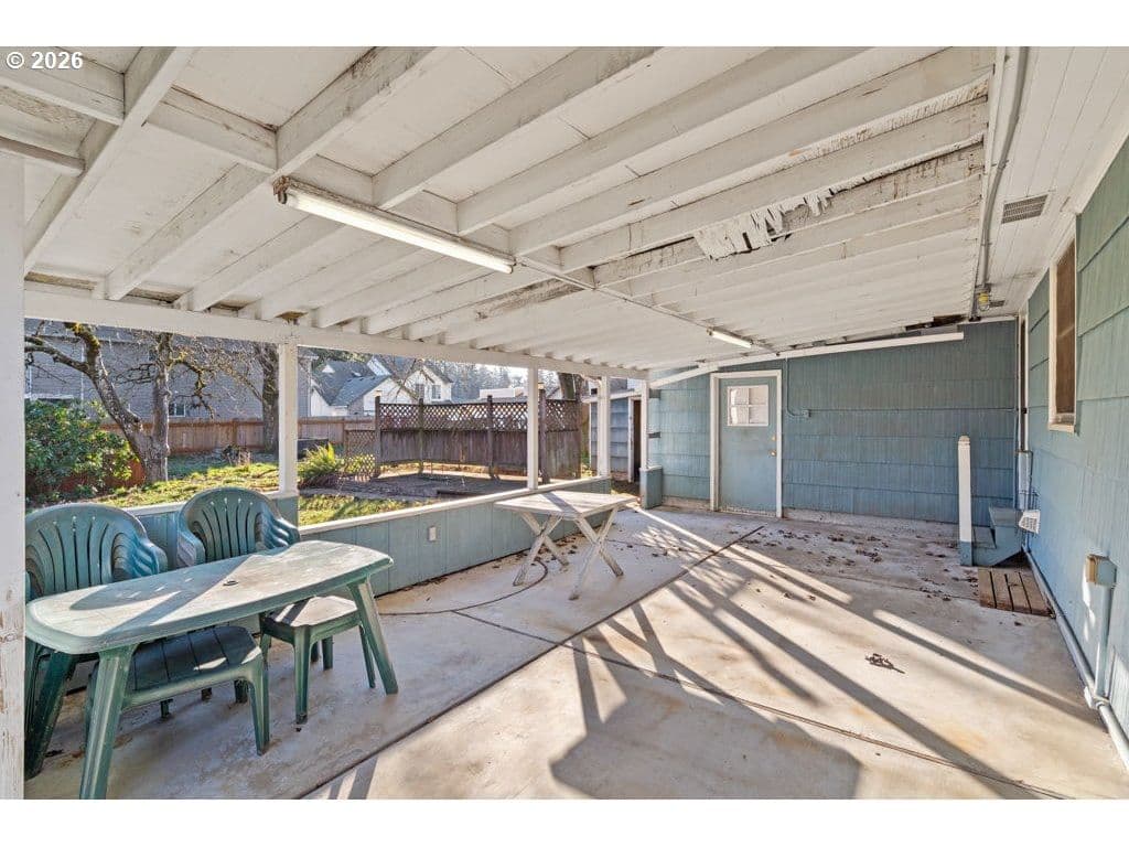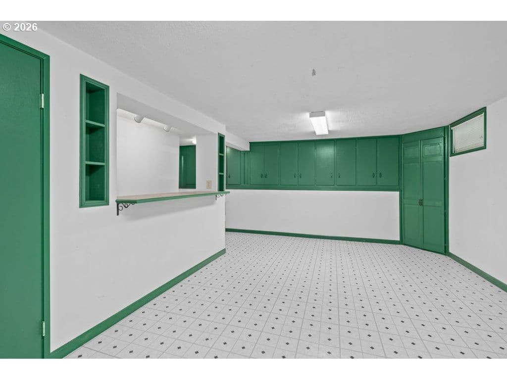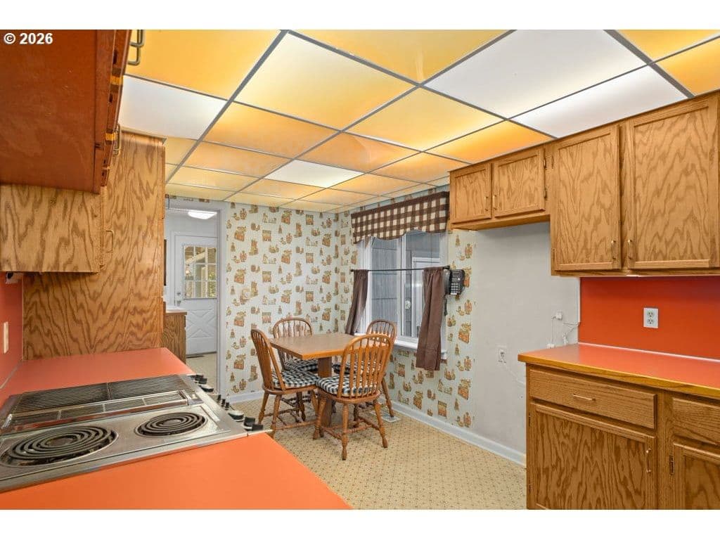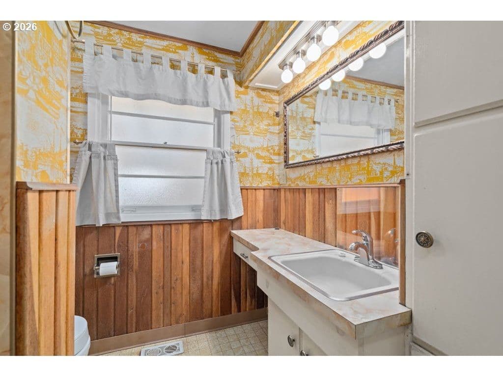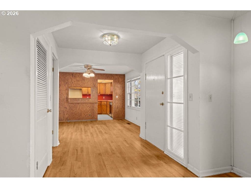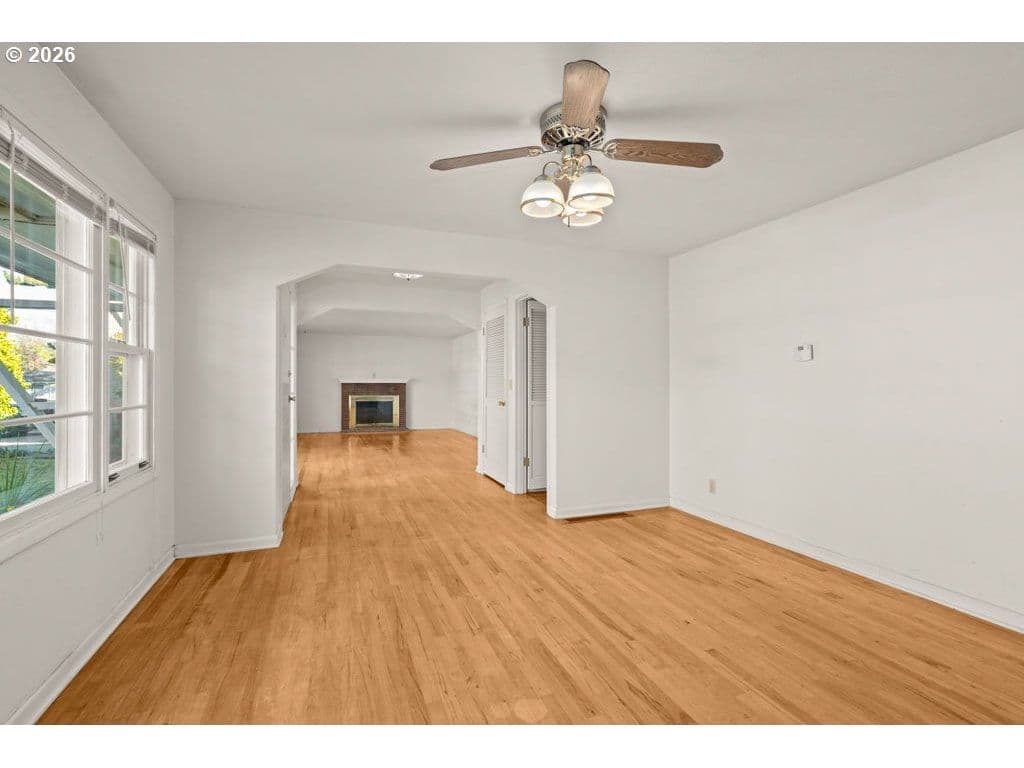 Classic Portland charm on a spacious .37-acre dividable lot with a gigantic driveway and oversized two-car garage. A formal entry with coat closet opens to a light-filled living room featuring hardwood floors and a burgundy wood-burning fireplace. The open dining room connects to a peek-a-boo eat-in kitchen with original cabinetry, pull-out shelves, and a built-in spice rack.The main level offers two bedrooms with hardwood floors and ample closet space, plus a full bathroom with tub/shower combo and vanity sink. Original hallway storage adds function and charm. The basement, accessible from the garage and laundry room, provides flexible space ideal for a 3rd bedroom or media room, guest area, or potential rental use, with a utility room, built-ins, and a bar area. Enjoy a fully fenced backyard with room to expand, garden, or develop. The oversized garage offers generous storage and overhead space. Laundry room includes sink, washer, and dryer. A rare blend of lot size, storage, and character in Portland. [Home Energy Score = 1. HES Report at https://rpt.greenbuildingregistry.com/hes/OR10244038]
