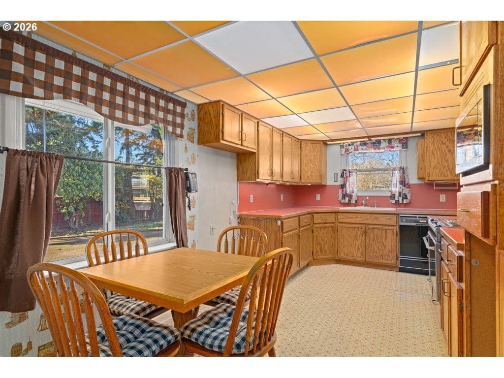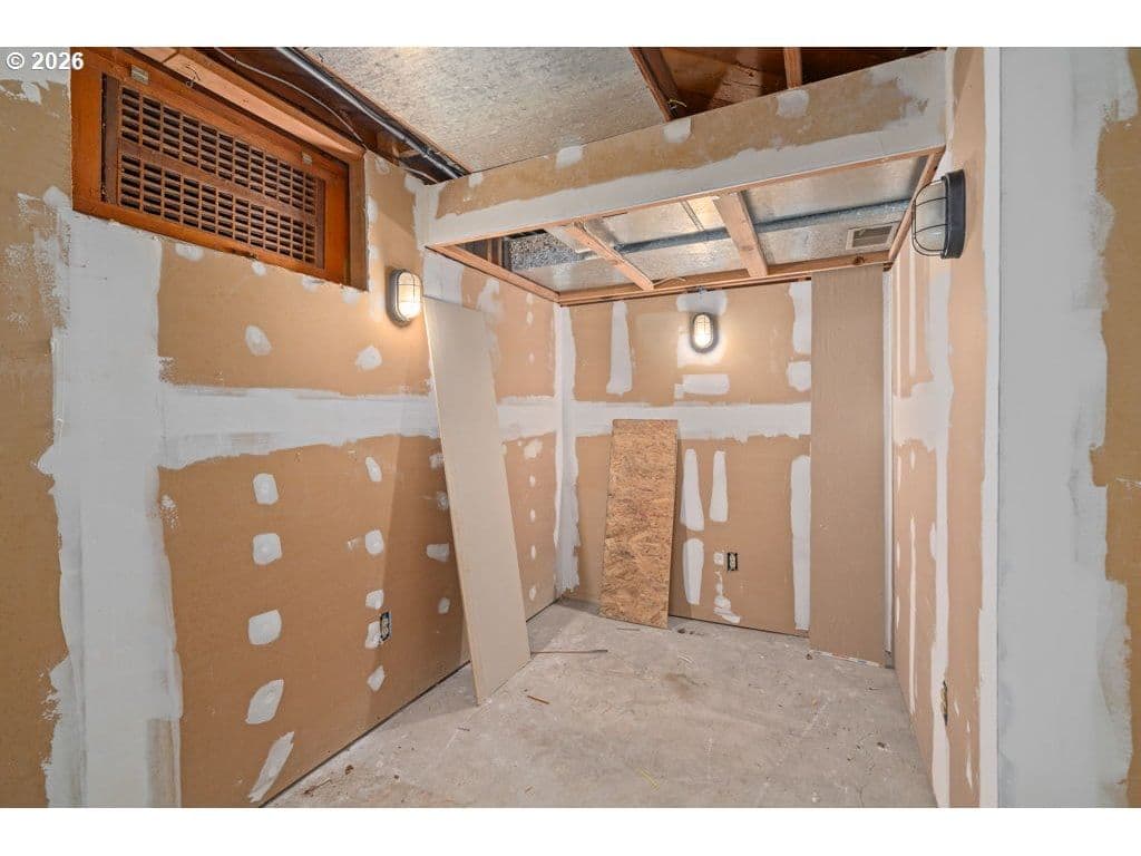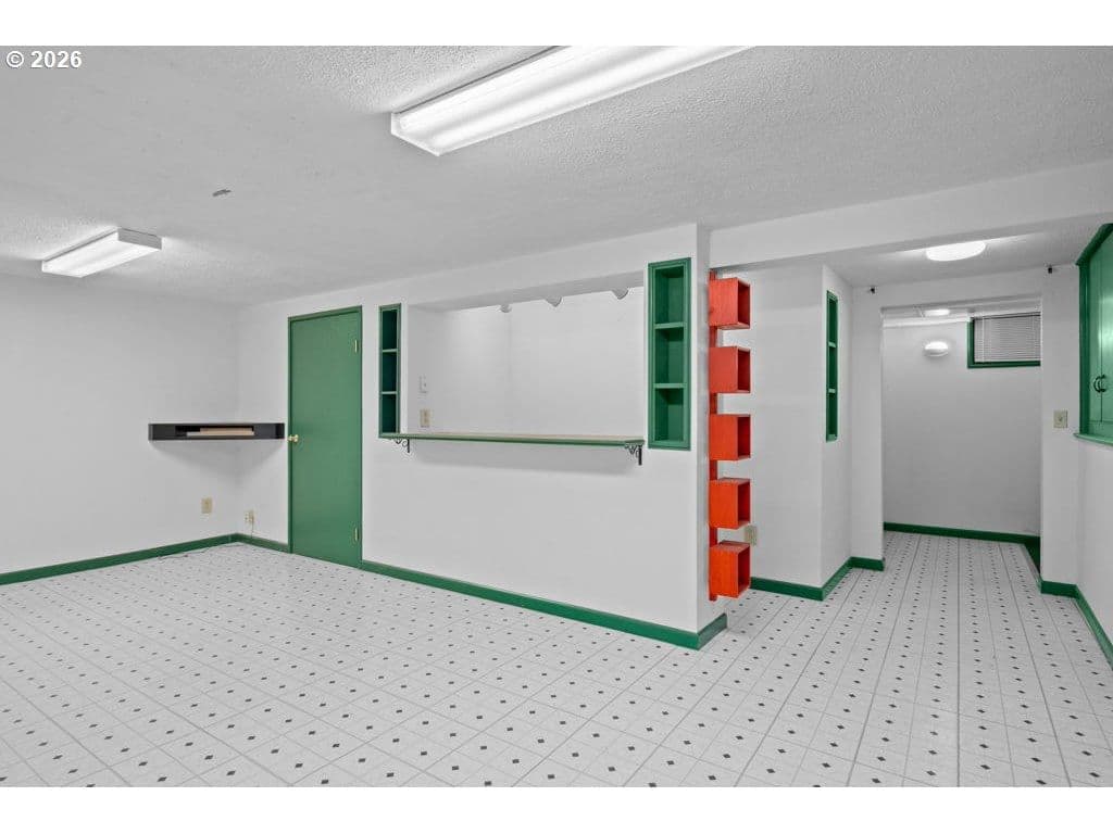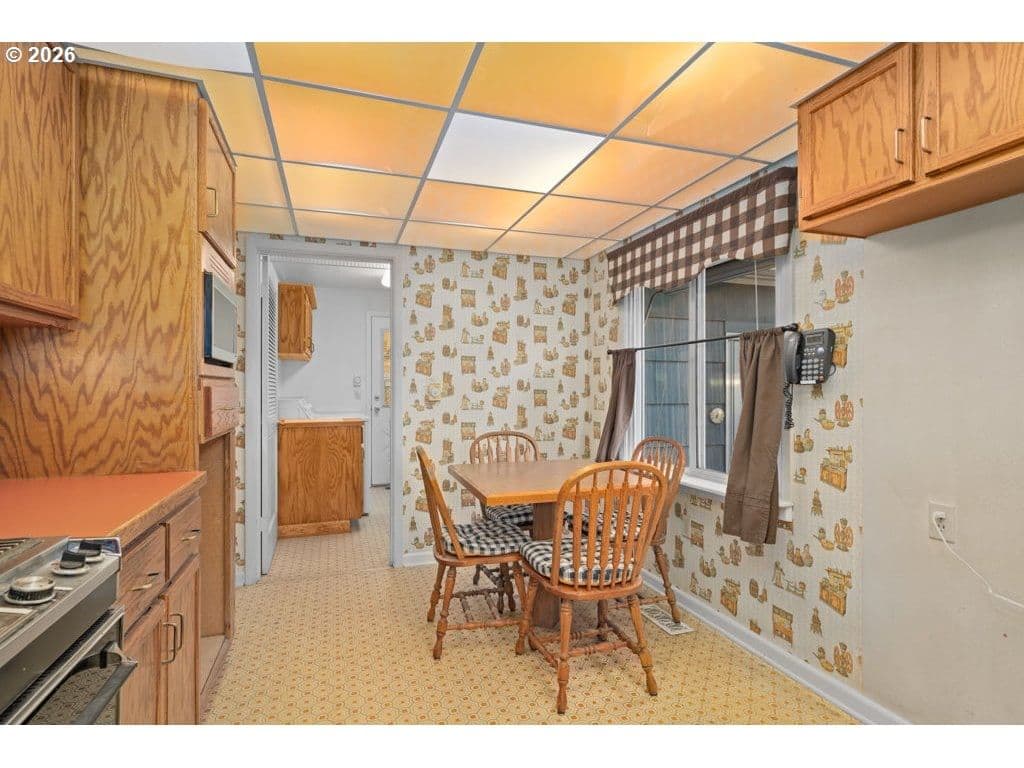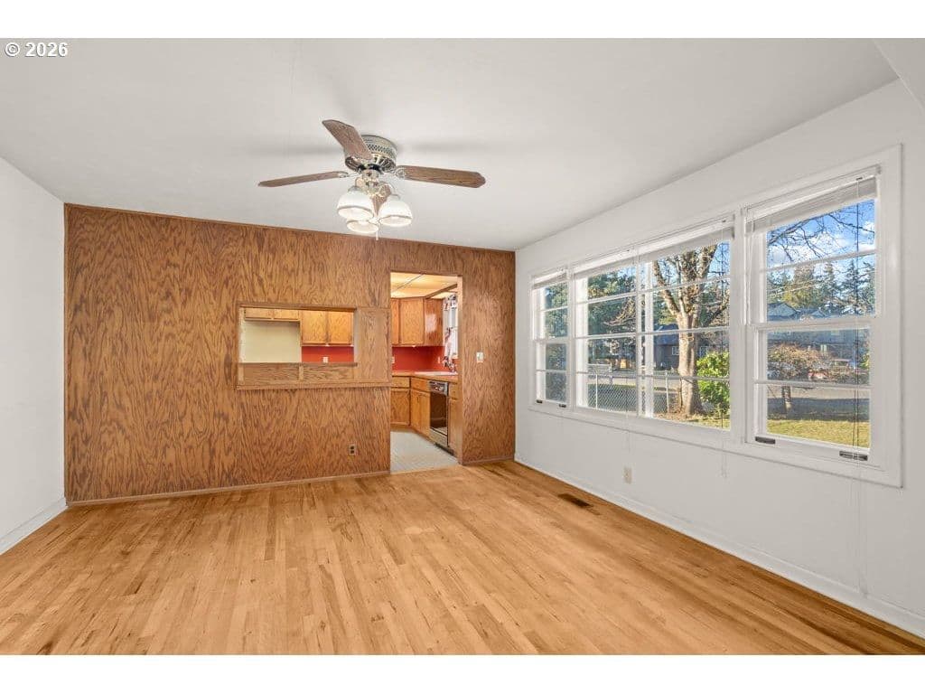 Classic Portland charm on a spacious .37-acre dividable lot with a gigantic driveway and oversized two-car garage. A formal entry with coat closet opens to a light-filled living room featuring hardwood floors and a burgundy wood-burning fireplace. The open dining room connects to a peek-a-boo eat-in kitchen with original cabinetry, pull-out shelves, and a built-in spice rack.The main level offers two bedrooms with hardwood floors and ample closet space, plus a full bathroom with tub/shower combo and vanity sink. Original hallway storage adds function and charm. The basement, accessible from the garage and laundry room, provides flexible space ideal for a 3rd bedroom or media room, guest area, or potential rental use, with a utility room, built-ins, and a bar area. Enjoy a fully fenced backyard with room to expand, garden, or develop. The oversized garage offers generous storage and overhead space. Laundry room includes sink, washer, and dryer. A rare blend of lot size, storage, and character in Portland. [Home Energy Score = 1. HES Report at https://rpt.greenbuildingregistry.com/hes/OR10244038]