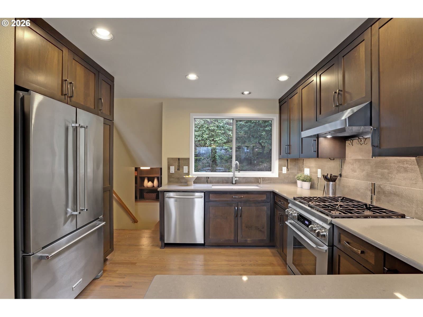 Located above John's Landing, this contemporary residence was designed to maximize panoramic views of Mt. Hood, Mt. St. Helens, and the Willamette River. Soaring ceilings, ample windows and hardwood floors make for light filled airy spaces. Fabulous updated kitchen with Dacor range, quartz counters and plenty of storage. Rooms on all floors offer flexible spaces to accommodate a range of needs for bedrooms and office spaces. Outdoors one finds a low maintenance yard with recently updated irrigation, covered patio great for all seasons and a deck positioned to take in mountain, river and territorial views. Comfortable living conveniently positioned for downtown or OHSU commute as well as proximate river access for summer SUPing or kayaking. [Home Energy Score = 3. HES Report at https://rpt.greenbuildingregistry.com/hes/OR10243605]