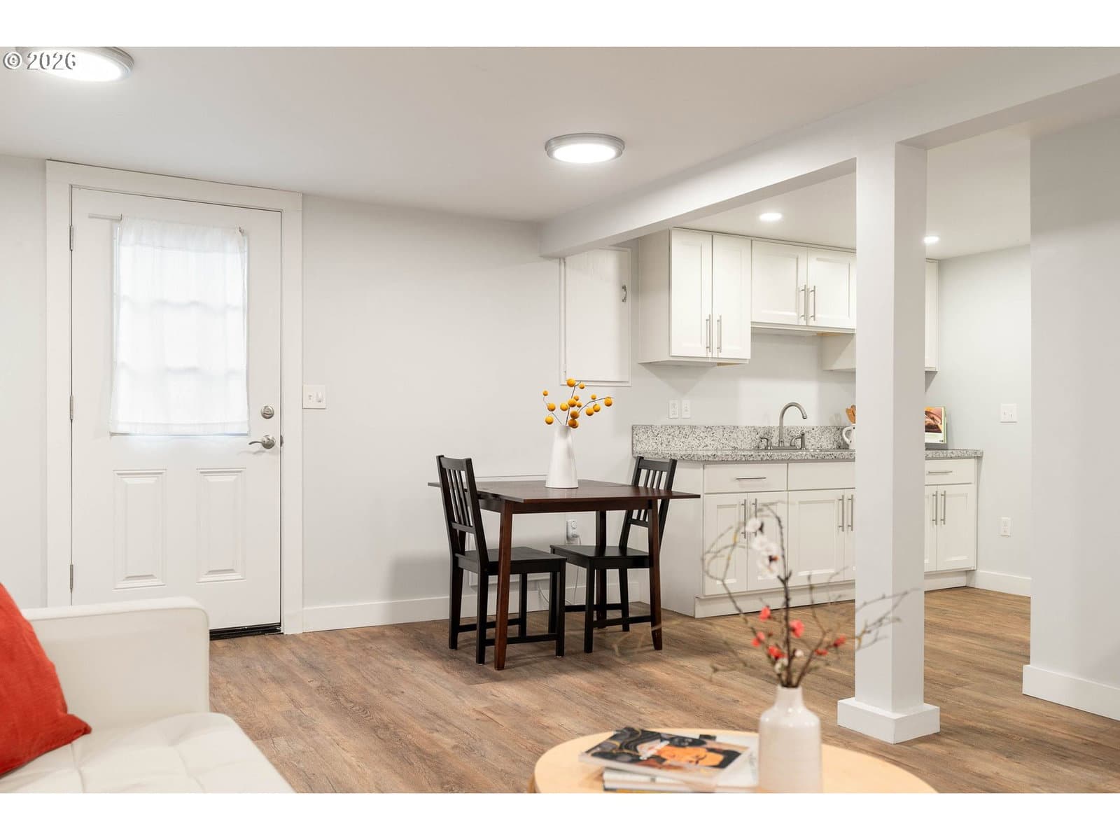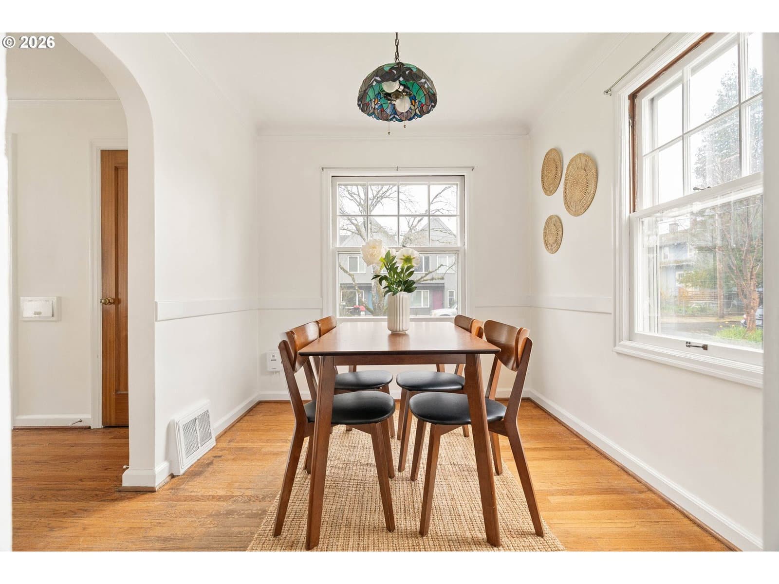 Endless possibilities await at this lovely University Park bungalow. Rich with 1940s character, the home features original hardwood floors, a cozy wood-burning fireplace, classic wood built-ins, and beautiful leaded glass windows. Explore ADU potential with a fully finished basement - complete with a kitchenette, laundry, two bedrooms, a full bath, and a private exterior entrance—ideal for students, guests, or multi-generational living (buyers to perform all due diligence). Behind the garage, a versatile flex space invites your next creative endeavor. Currently serving as an art studio, it is equipped with ample 220v outlets for woodworking or workshop use. Ideally located near the University of Portland, New Seasons Market, and some of NoPo’s most beloved restaurants and local shops. [Home Energy Score = 1. HES Report at https://rpt.greenbuildingregistry.com/hes/OR10118250]