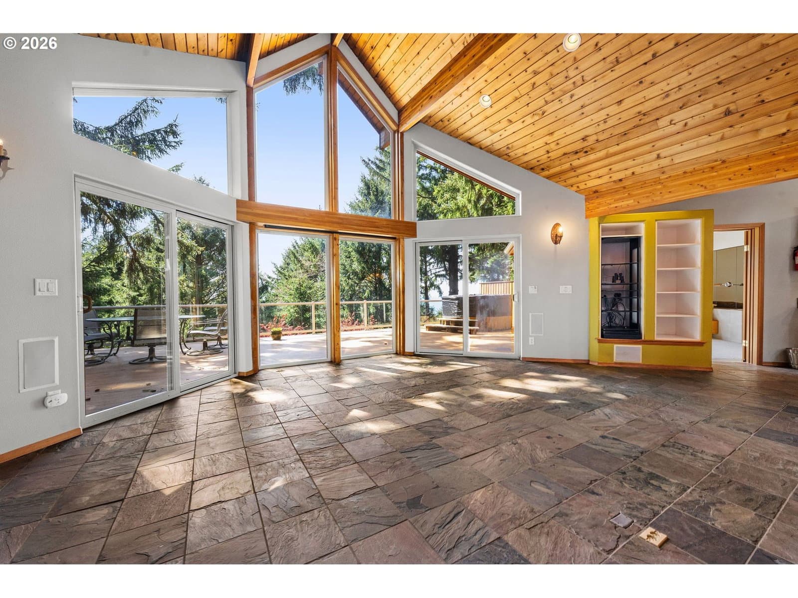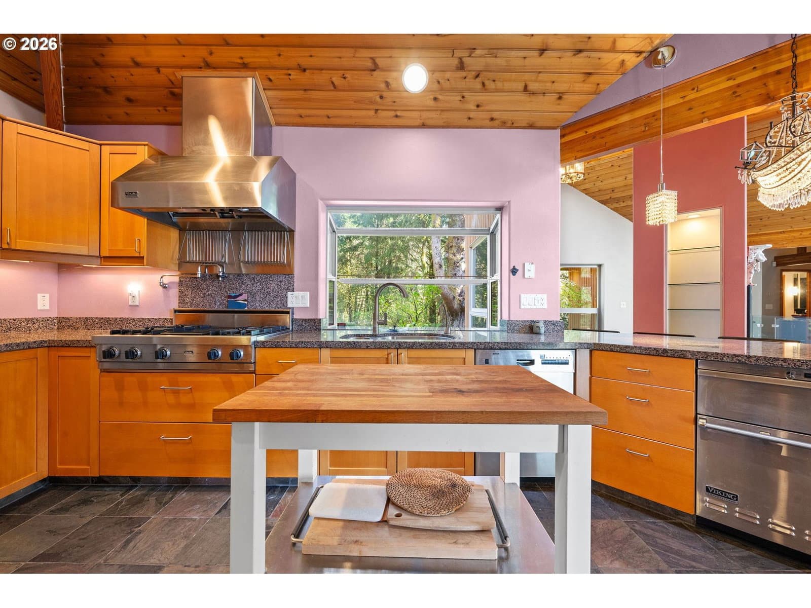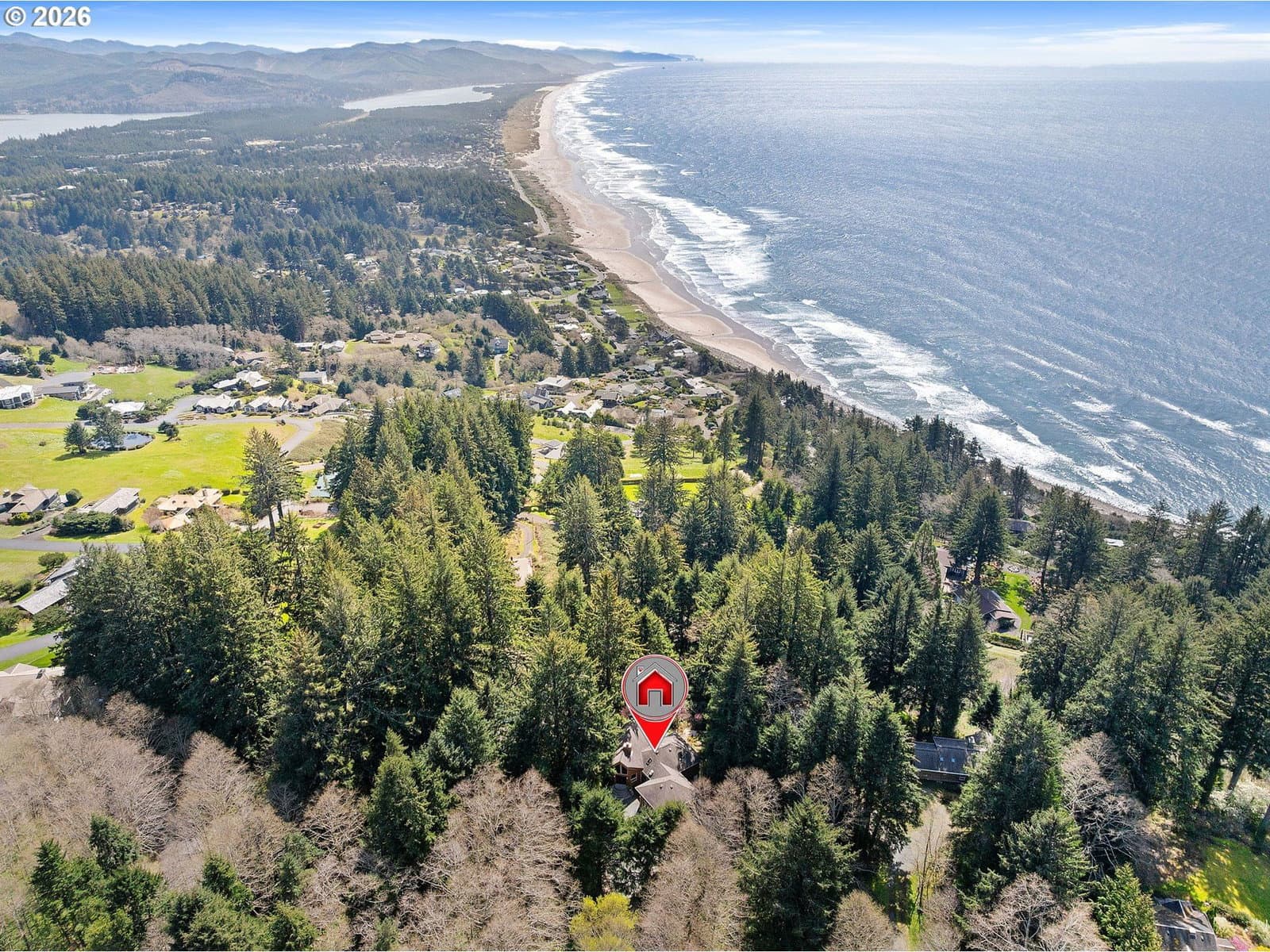 Step into this custom home where ocean views greet you. Vaulted knotty pine ceilings and expansive picture windows flood the space with natural light, seamlessly blending the indoors with the beauty outside. The main floor boasts two master ensuites and a full bath with a relaxing sauna. Versatile rooms with Murphy beds and built-in shelving invite endless possibilities, whether you dream of a craft room, home office, or a welcoming space for guests. The gourmet kitchen is equipped with high-end Viking appliances, while slate floors and a cozy fireplace create a warm, inviting atmosphere. Entertain on the sprawling ocean-view deck, complete with a hot tub and covered patio. Downstairs, a spacious family room an additional two bedrooms offer even more room to unwind. This secluded retreat sits on a generous lot, offering privacy and space to savor coastal living.