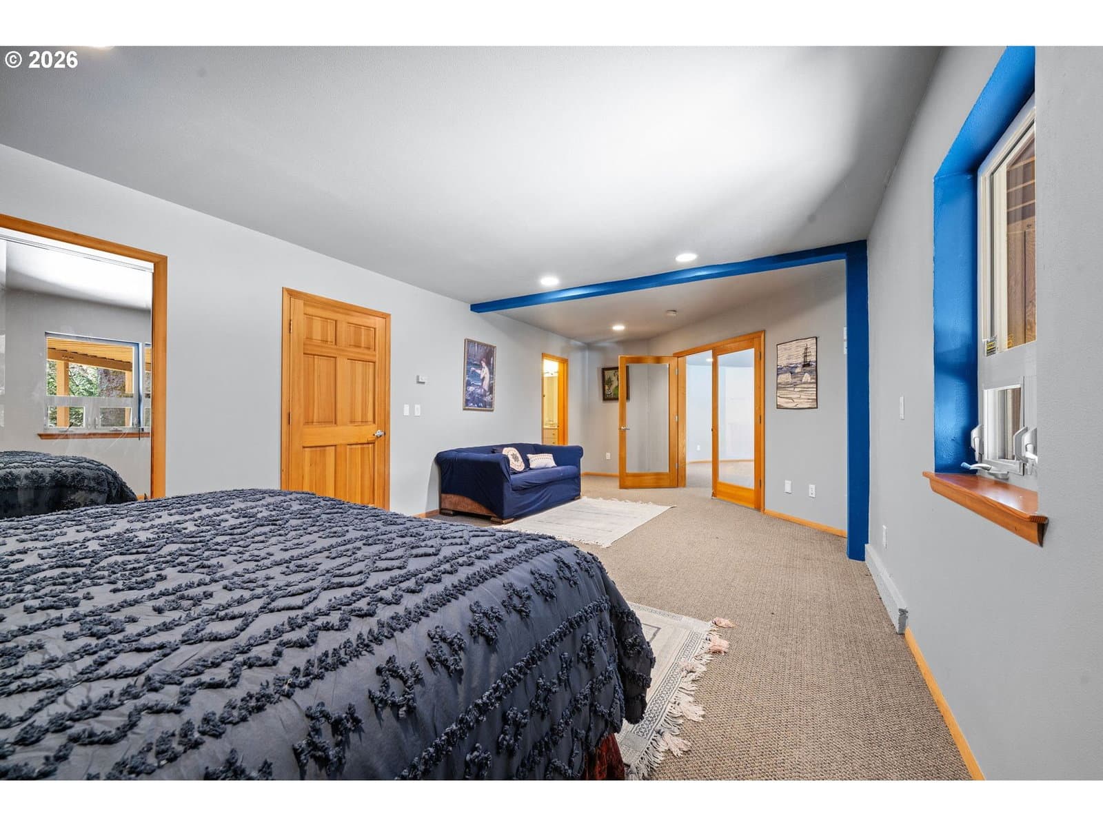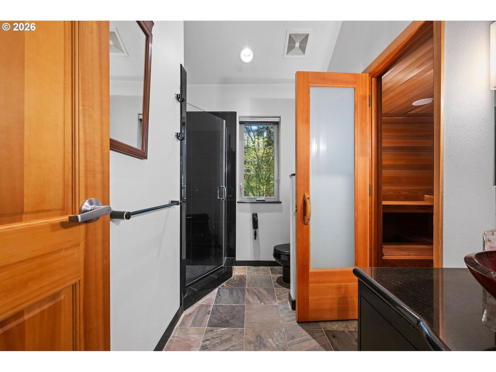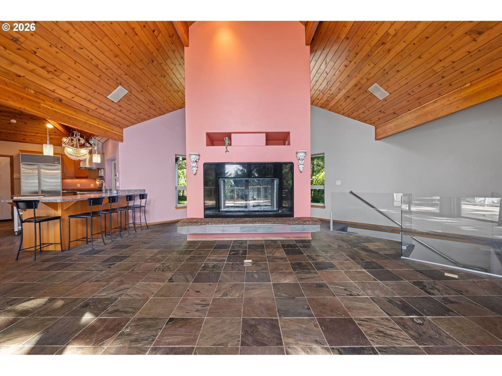 Step into this custom home where ocean views greet you. Vaulted knotty pine ceilings and expansive picture windows flood the space with natural light, seamlessly blending the indoors with the beauty outside. The main floor boasts two master ensuites and a full bath with a relaxing sauna. Versatile rooms with Murphy beds and built-in shelving invite endless possibilities, whether you dream of a craft room, home office, or a welcoming space for guests. The gourmet kitchen is equipped with high-end Viking appliances, while slate floors and a cozy fireplace create a warm, inviting atmosphere. Entertain on the sprawling ocean-view deck, complete with a hot tub and covered patio. Downstairs, a spacious family room an additional two bedrooms offer even more room to unwind. This secluded retreat sits on a generous lot, offering privacy and space to savor coastal living.