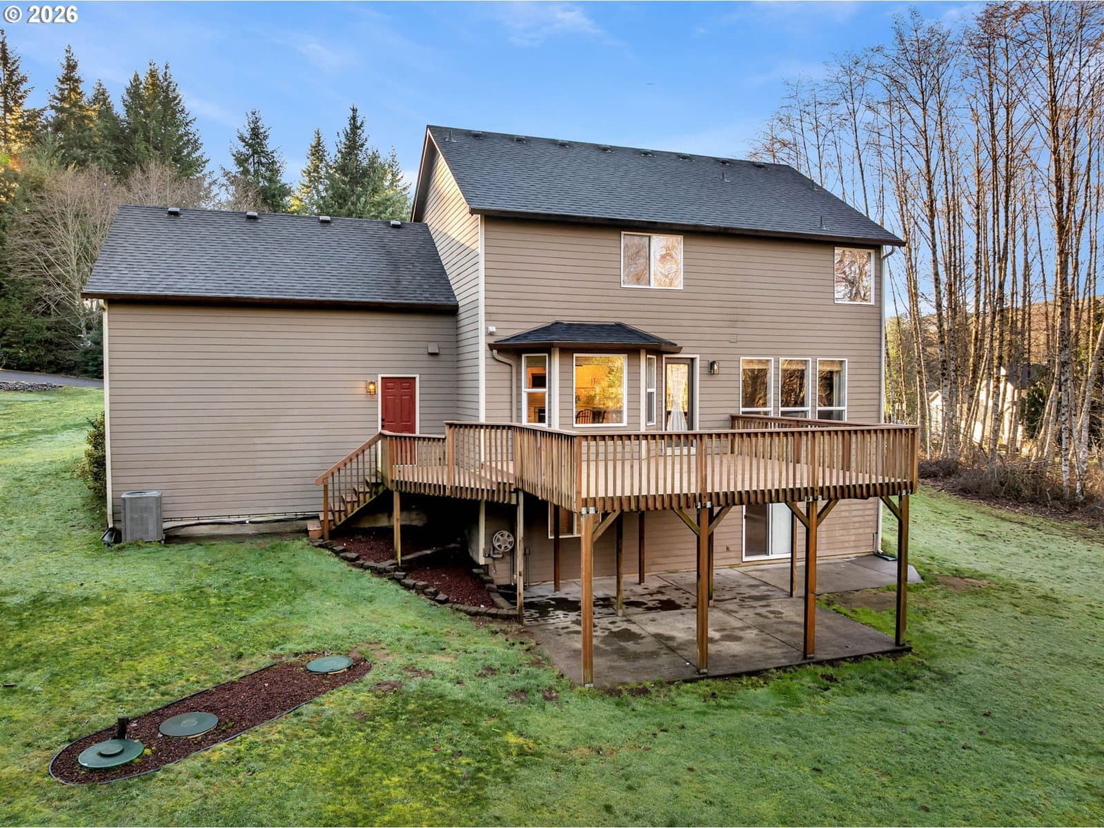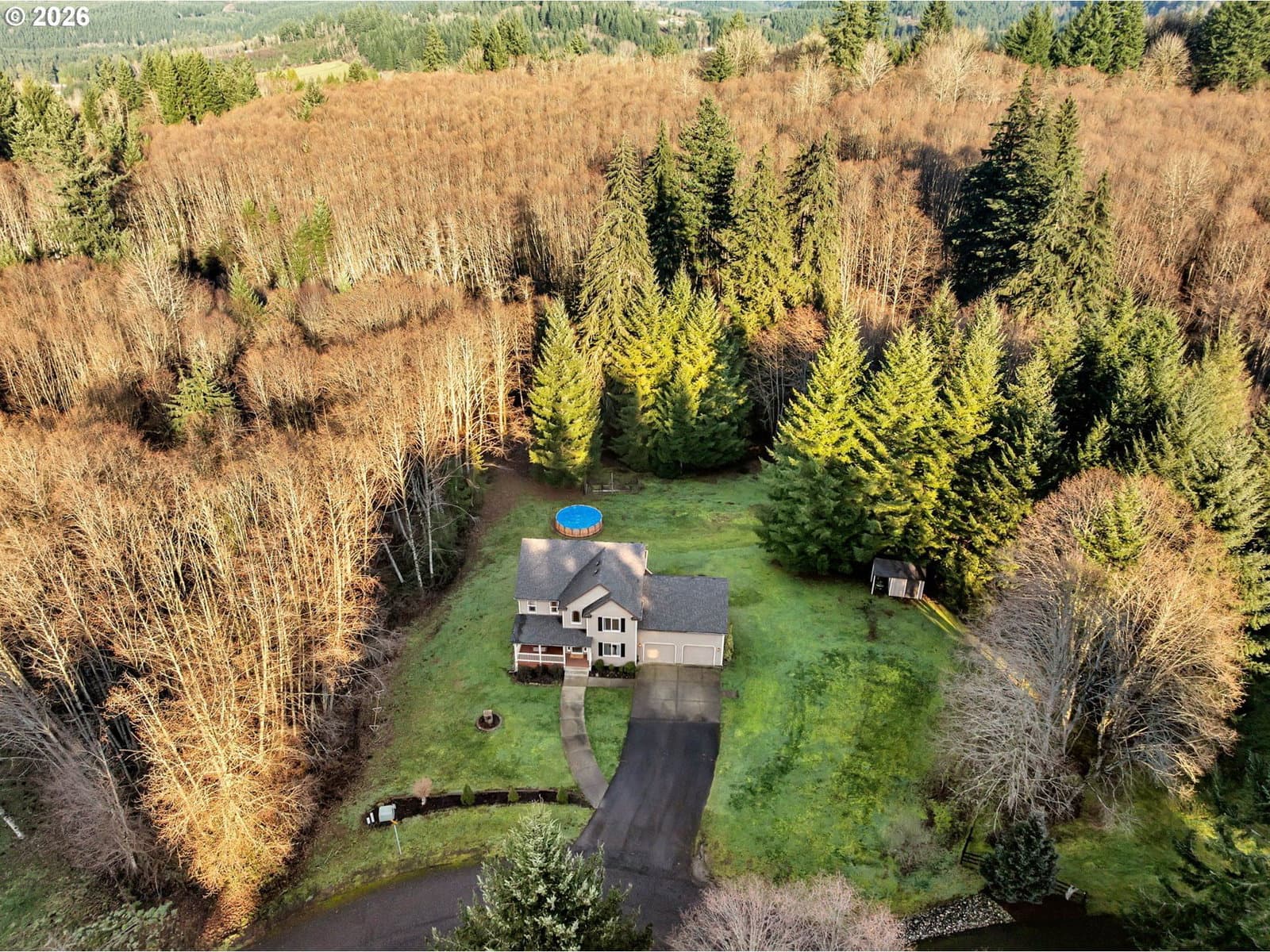 1 acre slice of property with a tastefully remodeled home. Gently rolling property with garden area, separate tool shed and above ground pool leading to a seasonal creek. Find yourself able to relax at home with a new roof, new HVAC, recently inspected and pumped septic system, new kitchen appliances, and new interior paint and newer carpet. Main level features easy care LVP flooring, propane fireplace, remodeled kitchen (new appliances, cabinets, counters, backsplash, under cabinet lighting), and formal living and dining spaces. Upstairs Primary suite with vaulted ceiling, modern fixtures, jetted tub, dual sinks and walk in closet. Additional 3 bedrooms upstairs with 1 of 2 laundry rooms upstairs. Travel down to the basement for a 5th bedroom, bonus area, another flex space, 2nd laundry area, full bathroom, sauna and walk out to lower level patio.